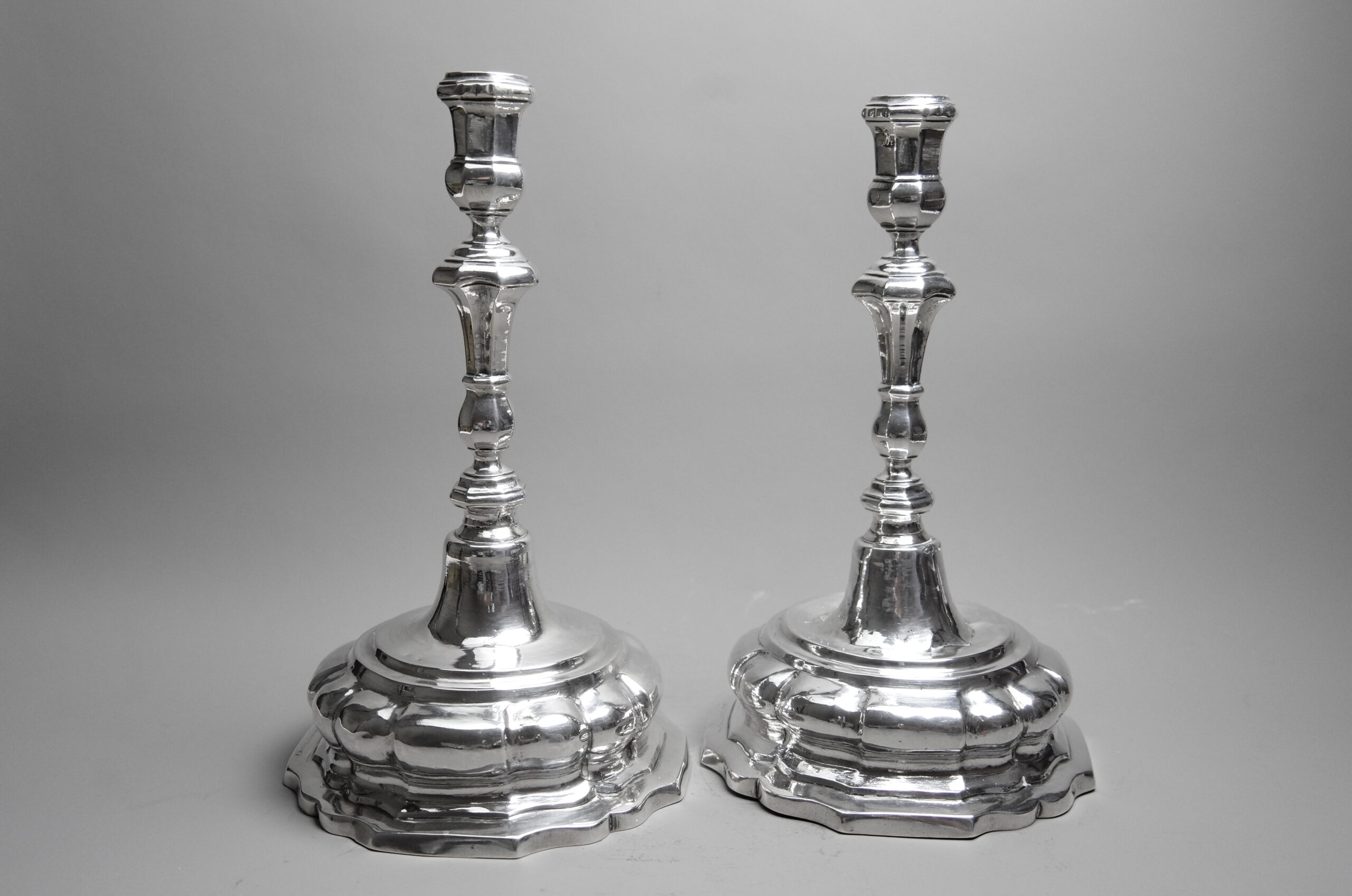 Ein Kerzenleuchterpaar mit rundem, mehrpassigem und getrepptem Standfuß. Der Schaft ist balusterförmig und mit Nodus gestaltet, die Tülle ist tulpenförmig.