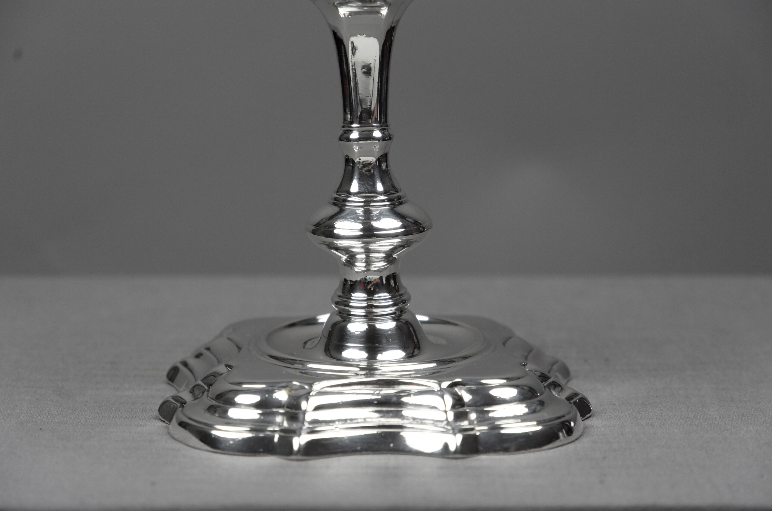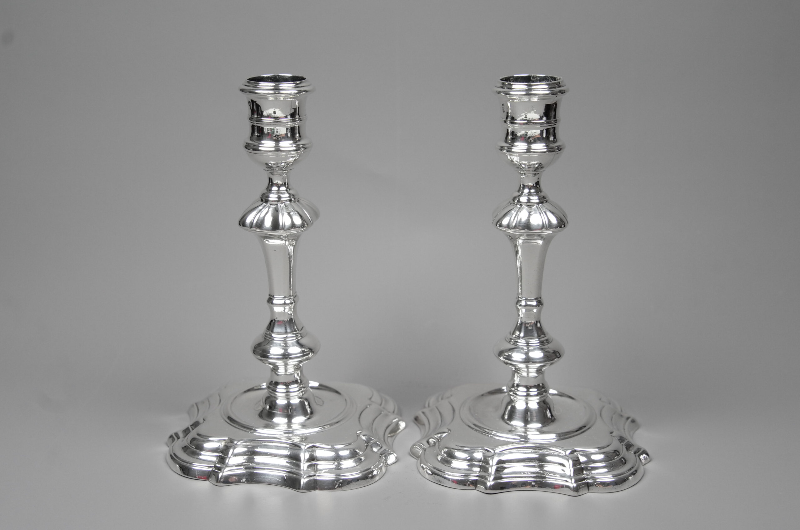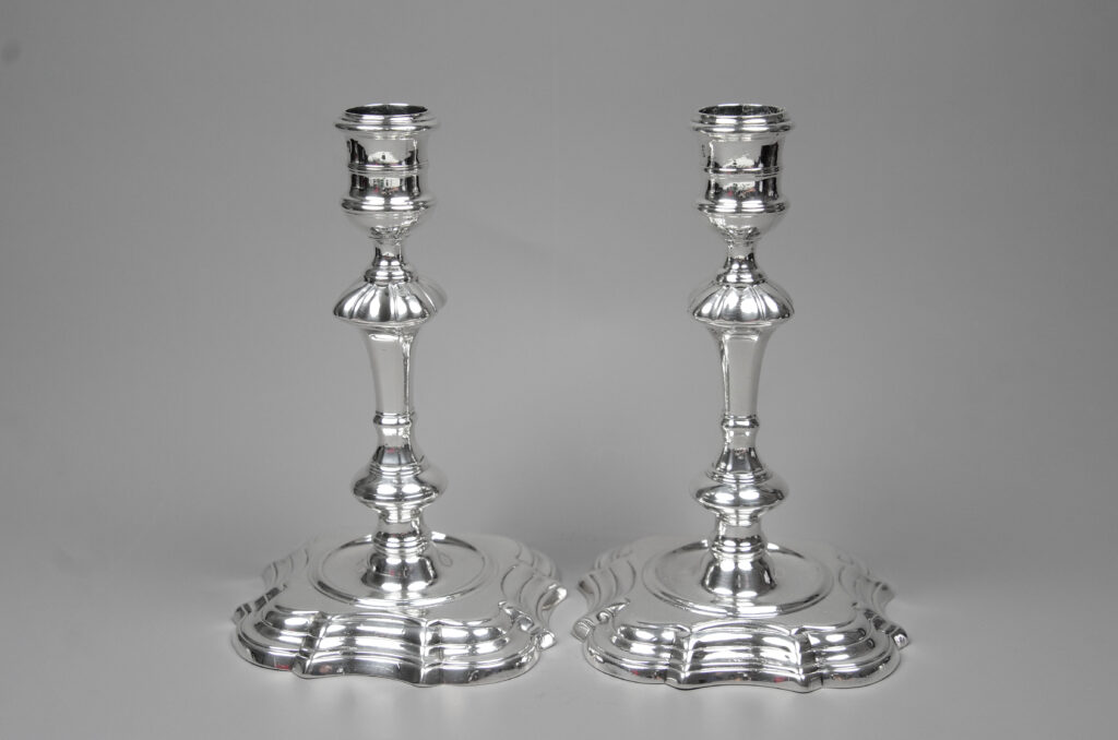 Markiert ist das Leuchterpaar mit dem linksschreitenden Löwen für 925er Sterlingsilber, mit dem gekrönten Leopardenkopf für London, mit dem Jahresbuchstaben e für 1740 sowie mit I·G als Meistermarke für James Gould.