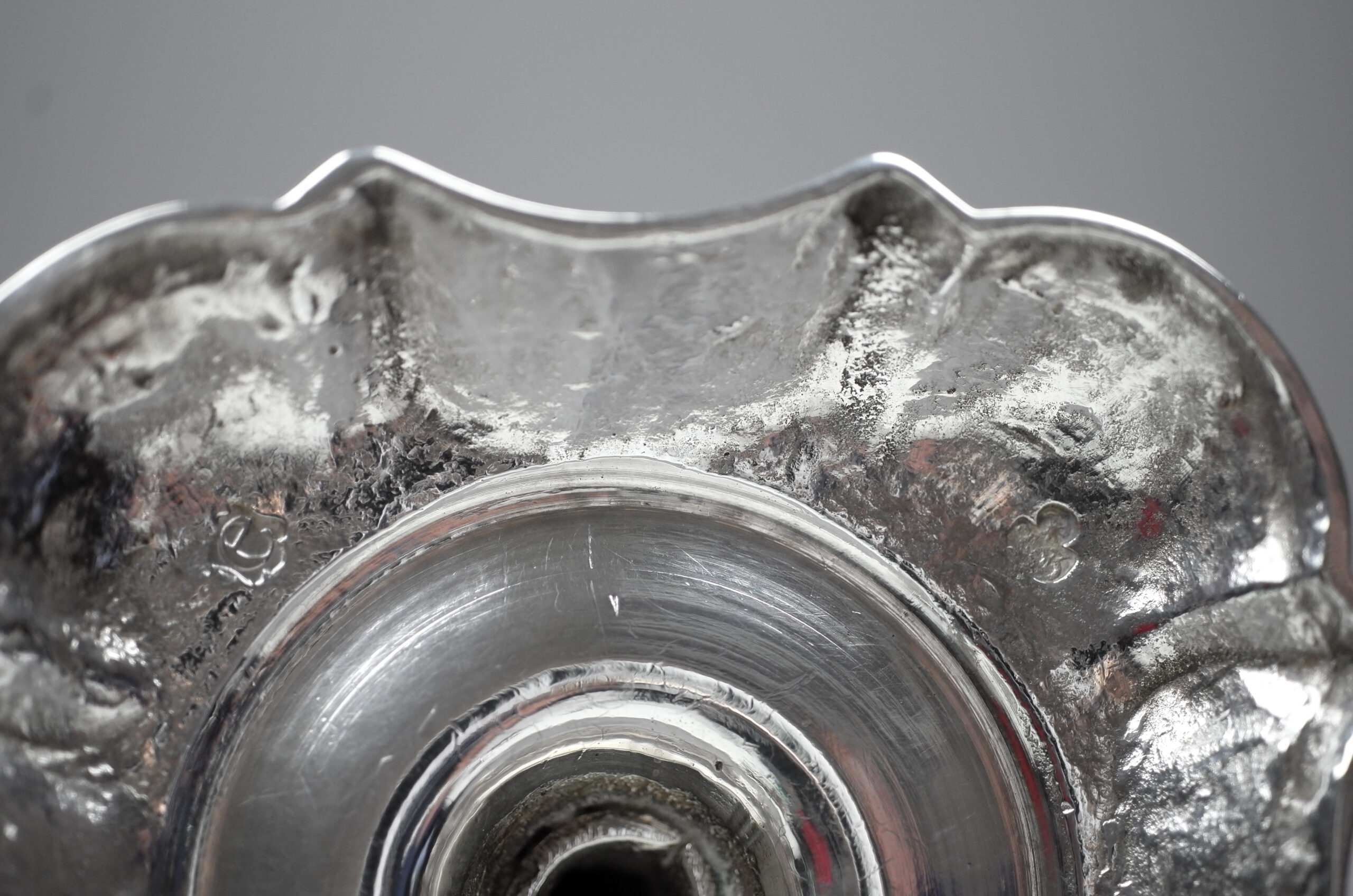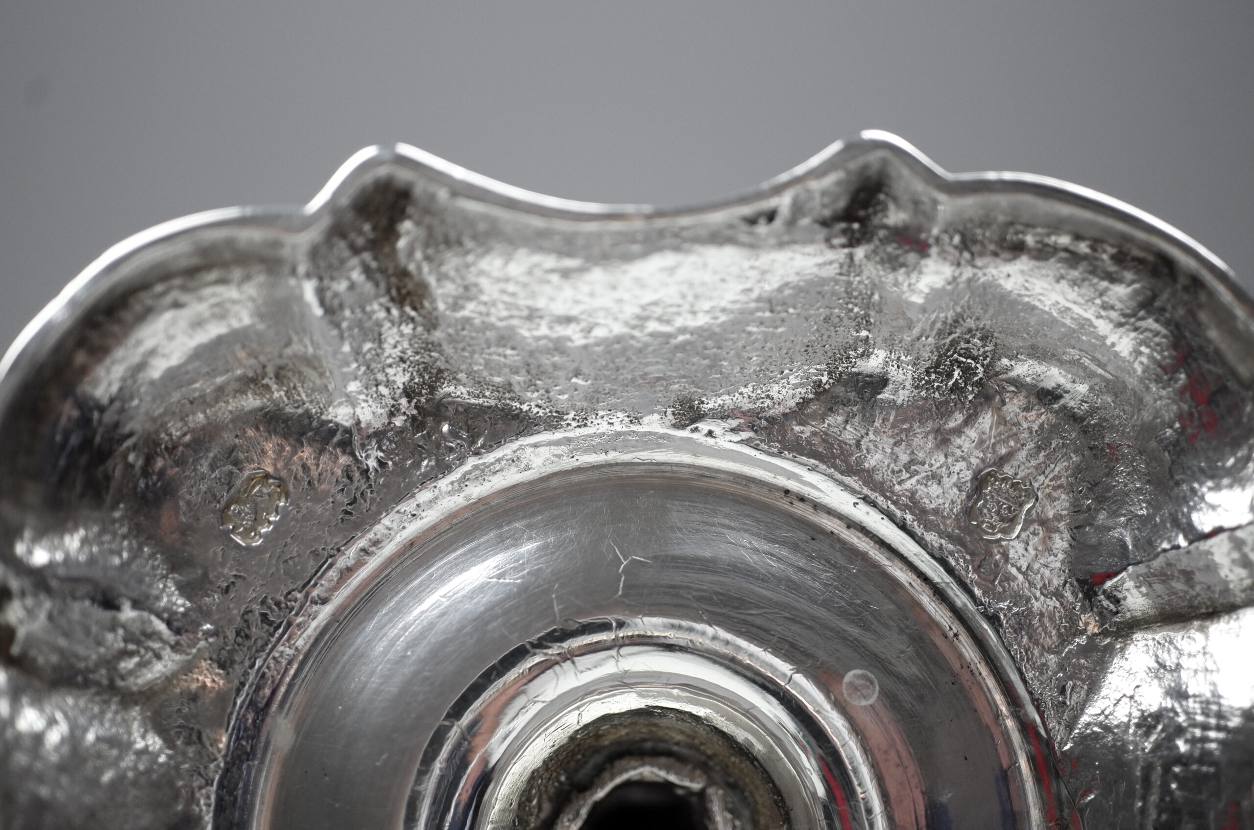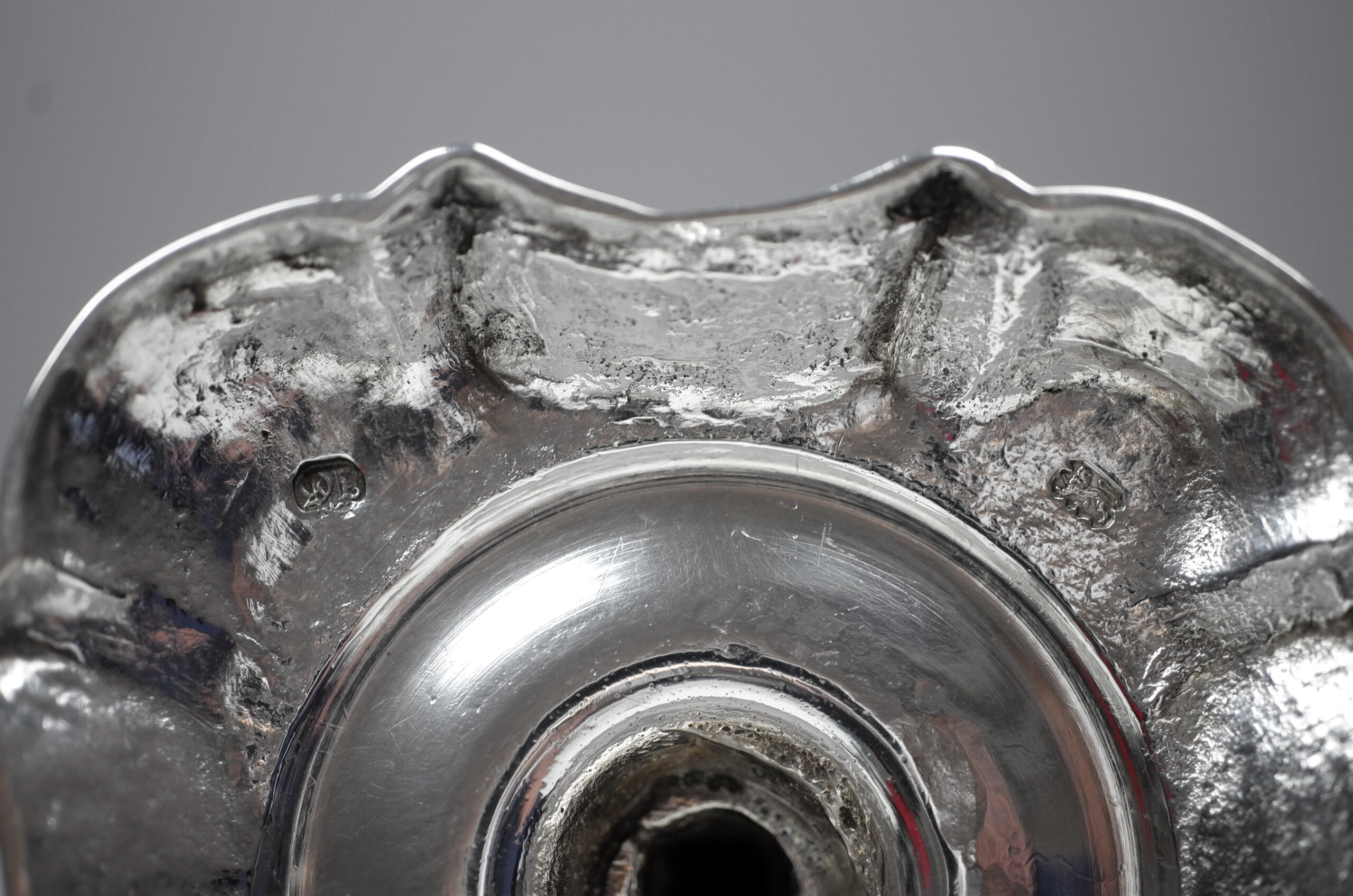 Markiert ist das Leuchterpaar mit dem linksschreitenden Löwen für 925er Sterlingsilber, mit dem gekrönten Leopardenkopf für London, mit dem Jahresbuchstaben e für 1740 sowie mit I·G als Meistermarke für James Gould.