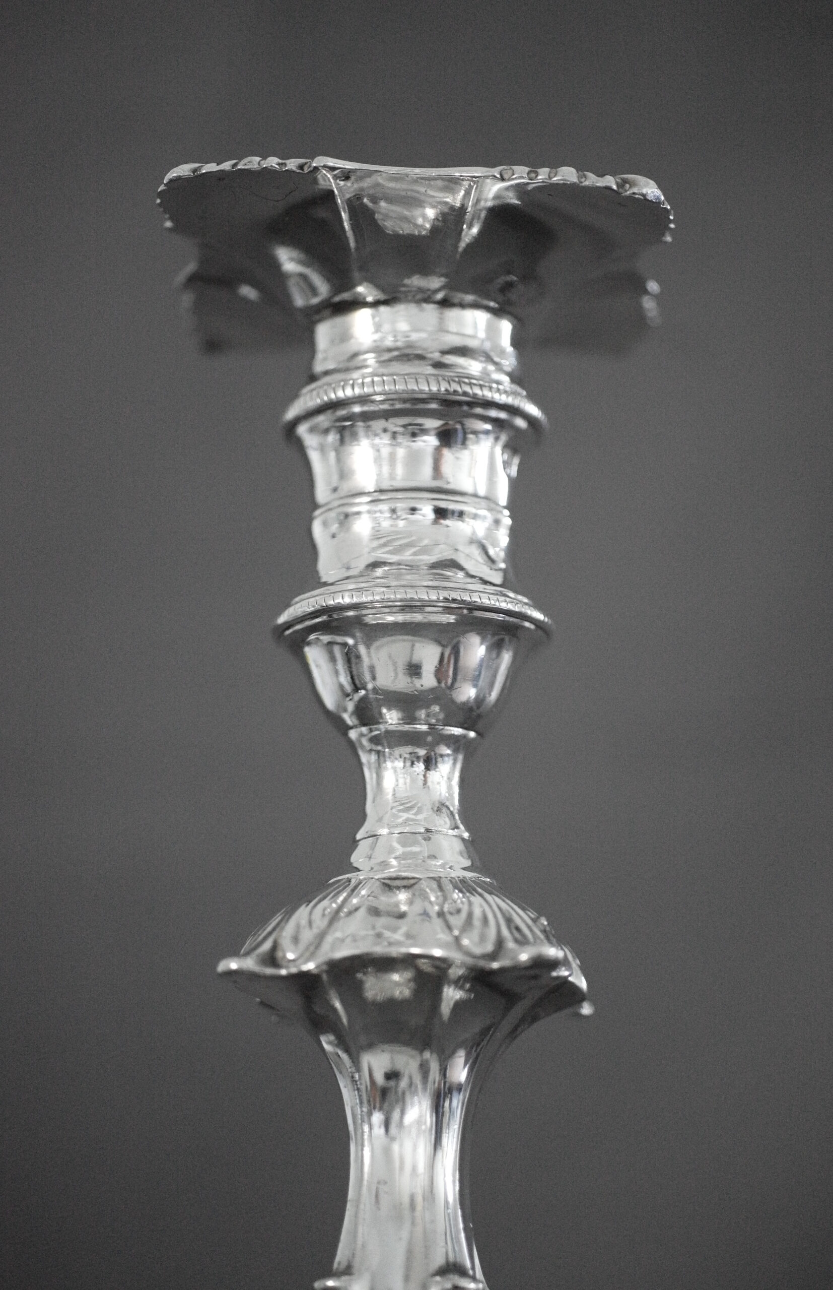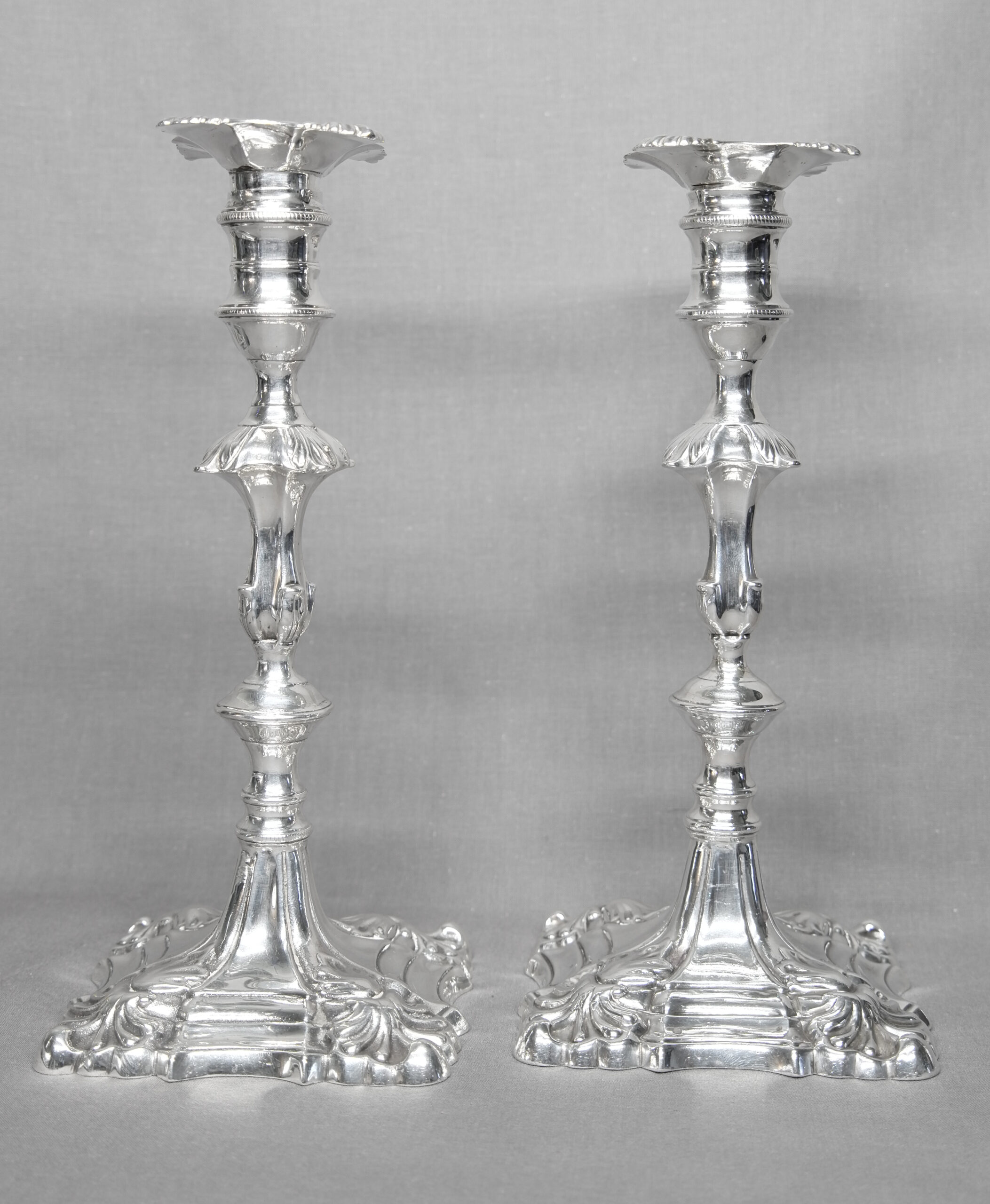 Das Leuchterpaar auf quadratischem Stand mit Muschelverzierungen hat einen  balusterförmigen Aufbau, abnehmbare Tropfenfänger und ist solide gearbeitet.