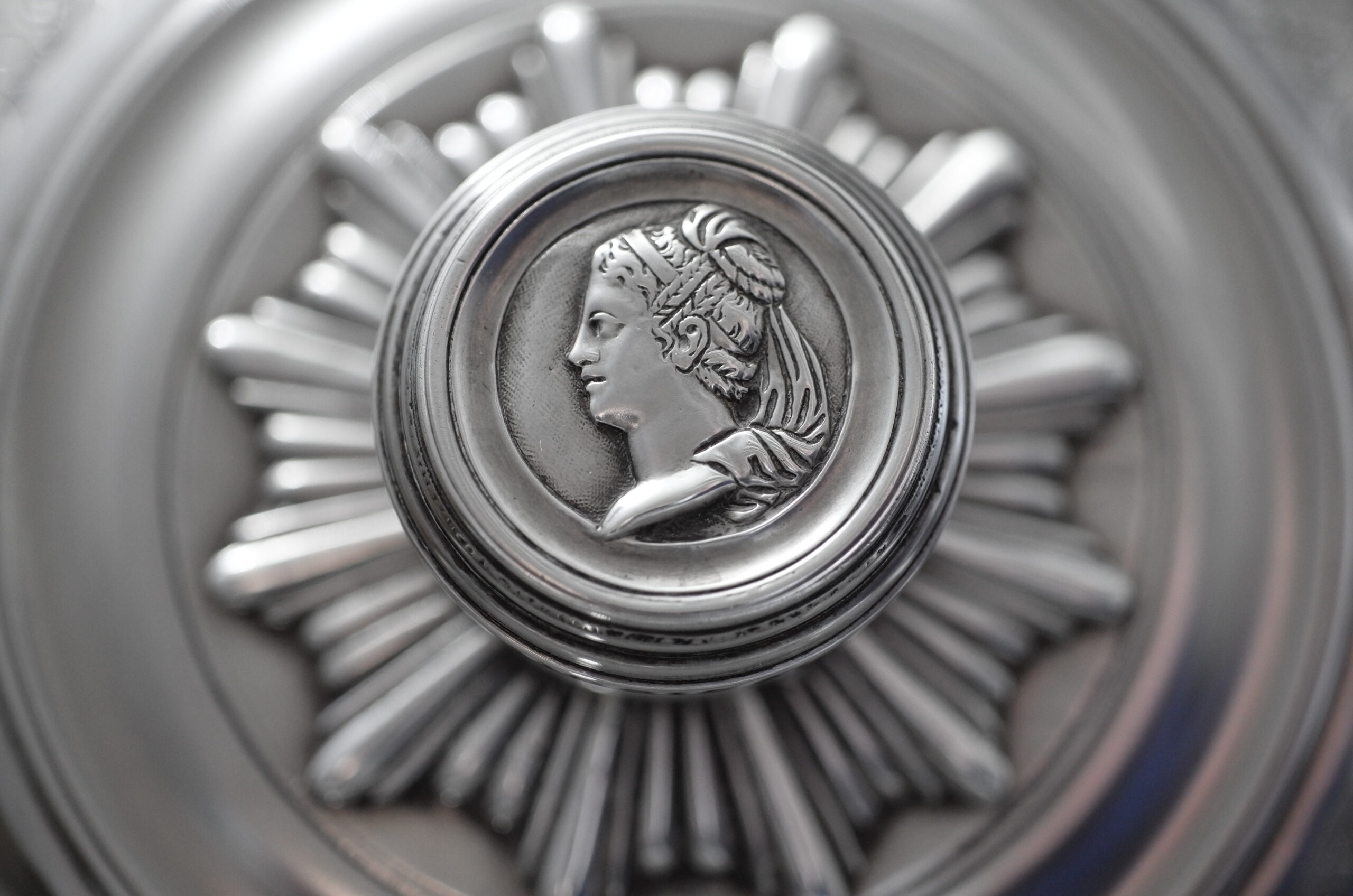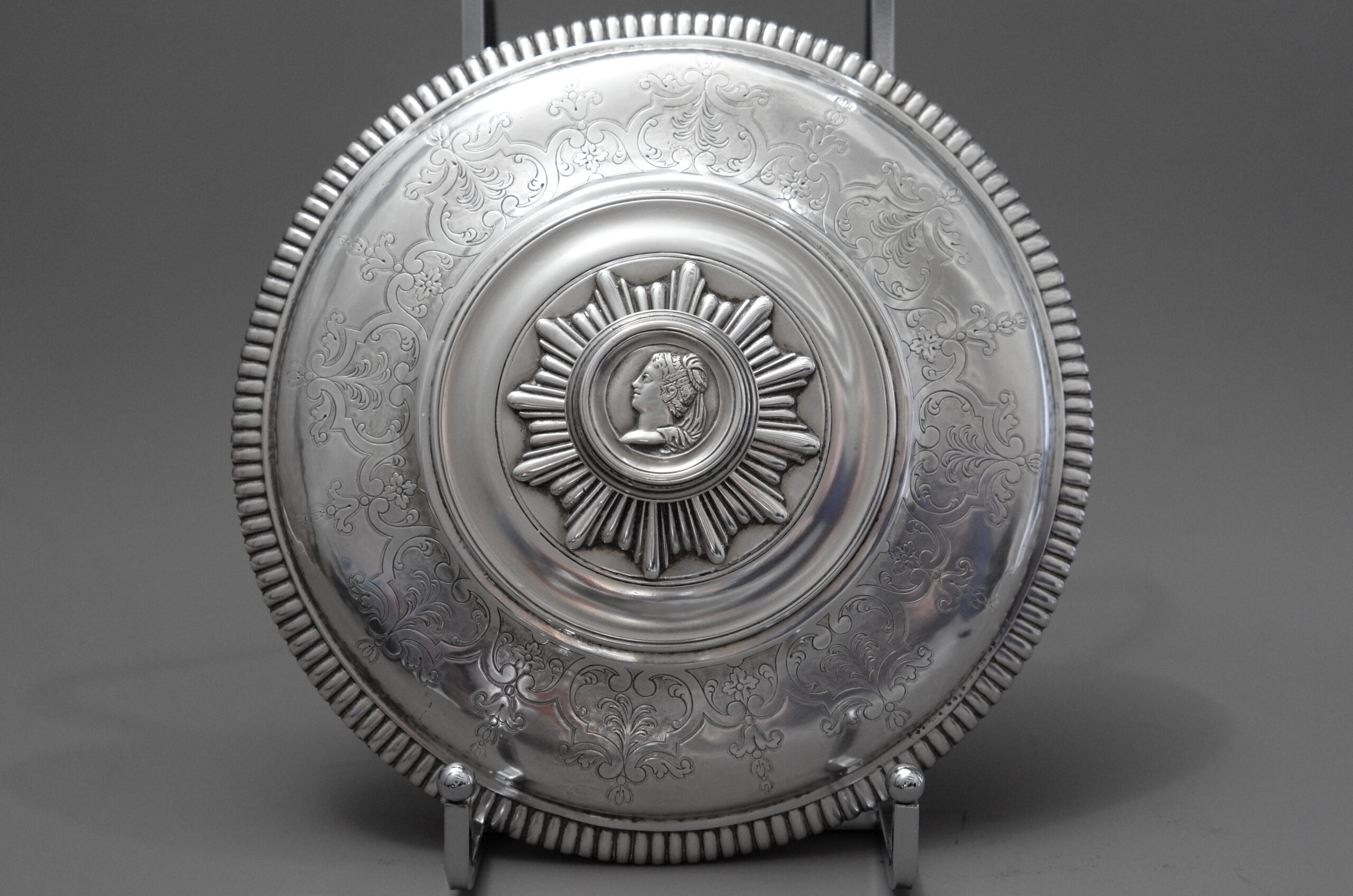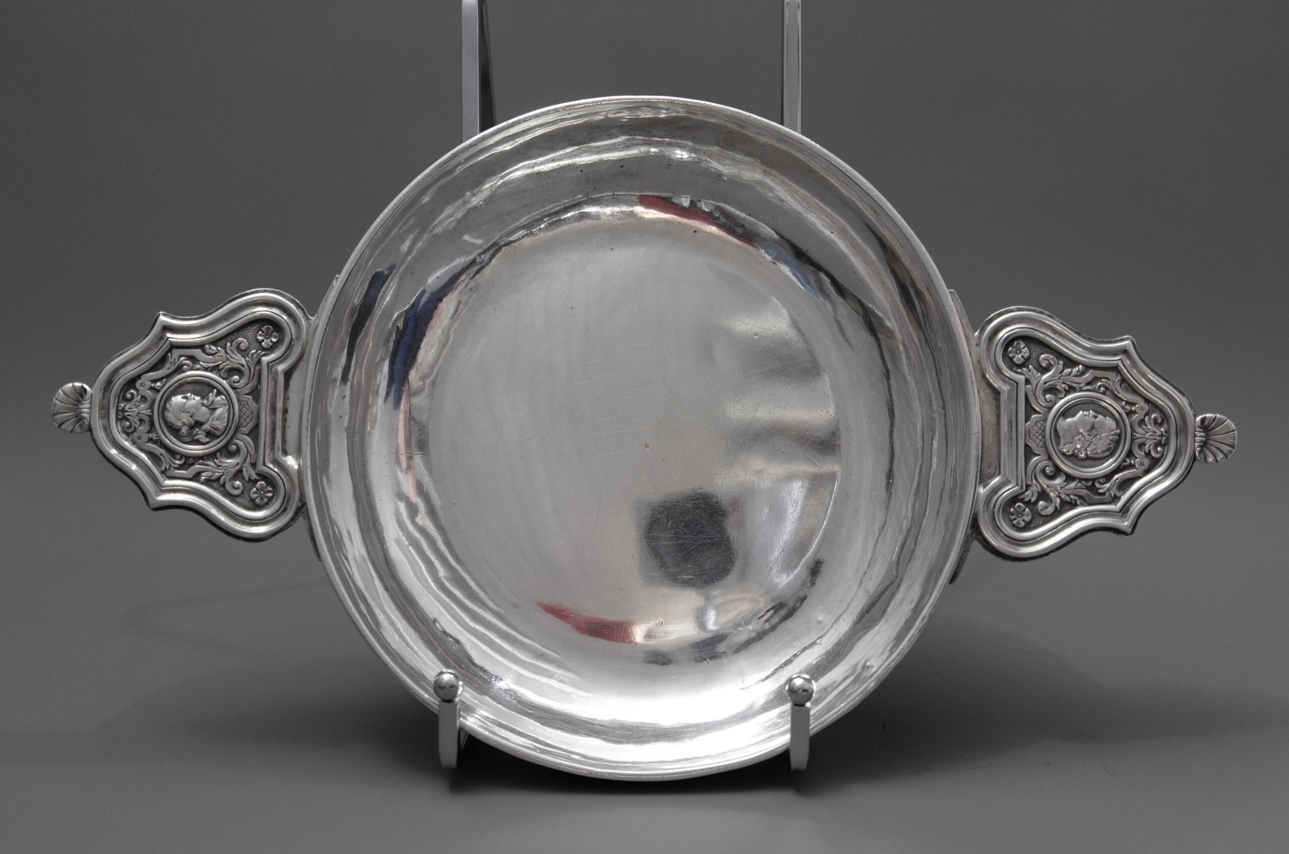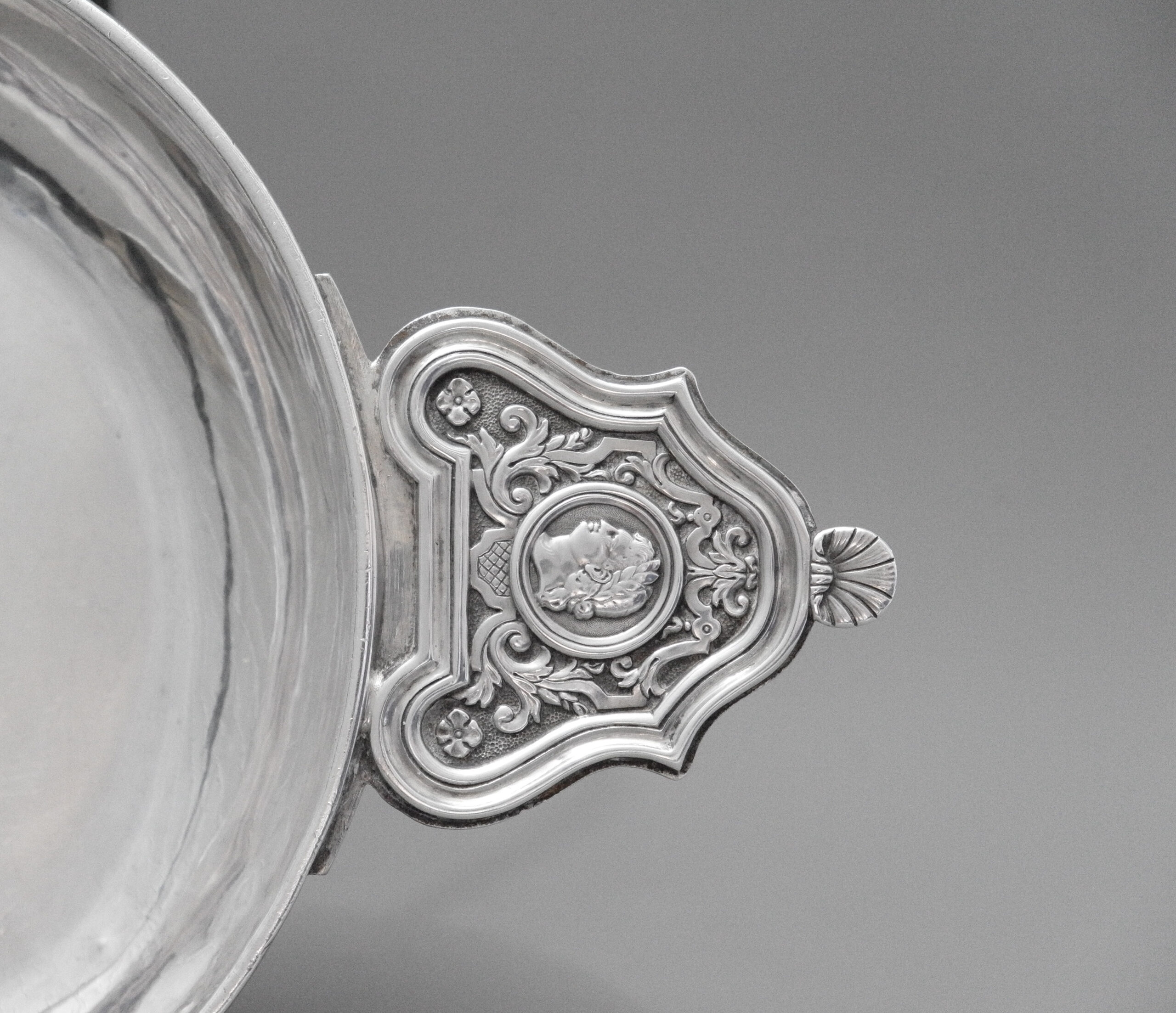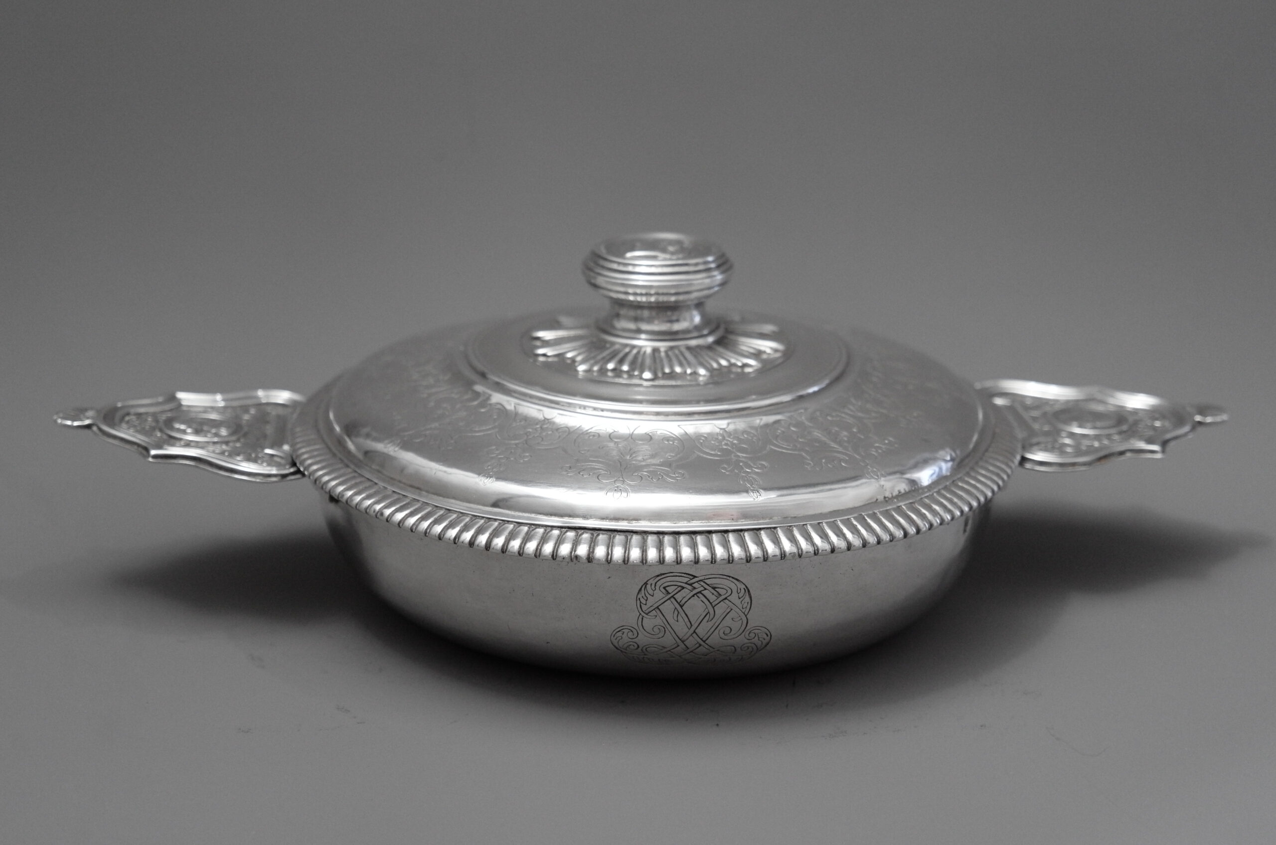 Eine Bouillonschüssel mit rundem, glattem Korpus und mit Monogramm. Die seitlichen Griffe sind mit Rocaillen-, Akanthus- und Muschelmuster sowie Portraits dekoriert, die Fahne des gestuften Deckels hat gravierte Muster und einen Blattrand, im Deckelknauf ist ein Portrait eingelassen.