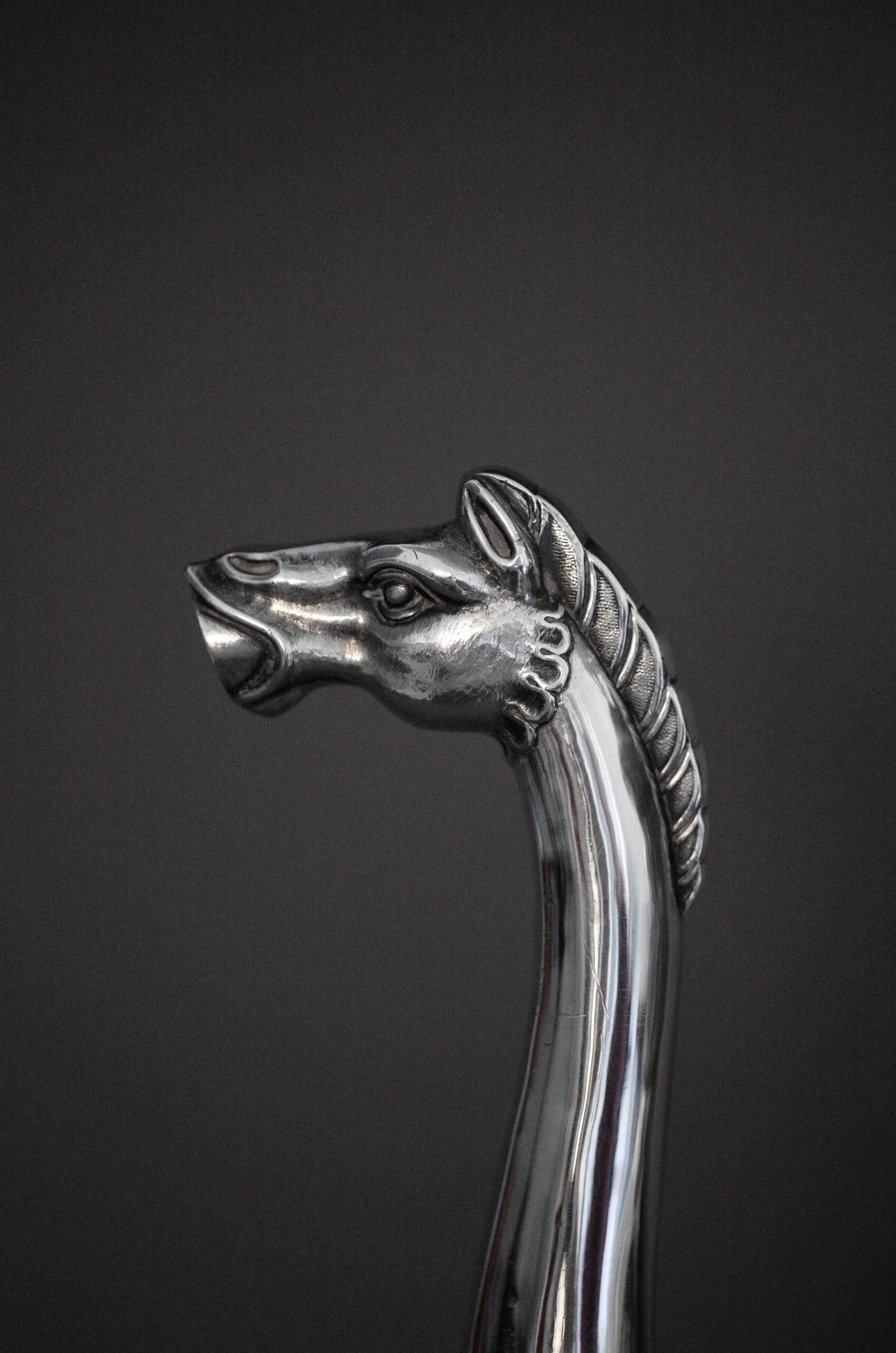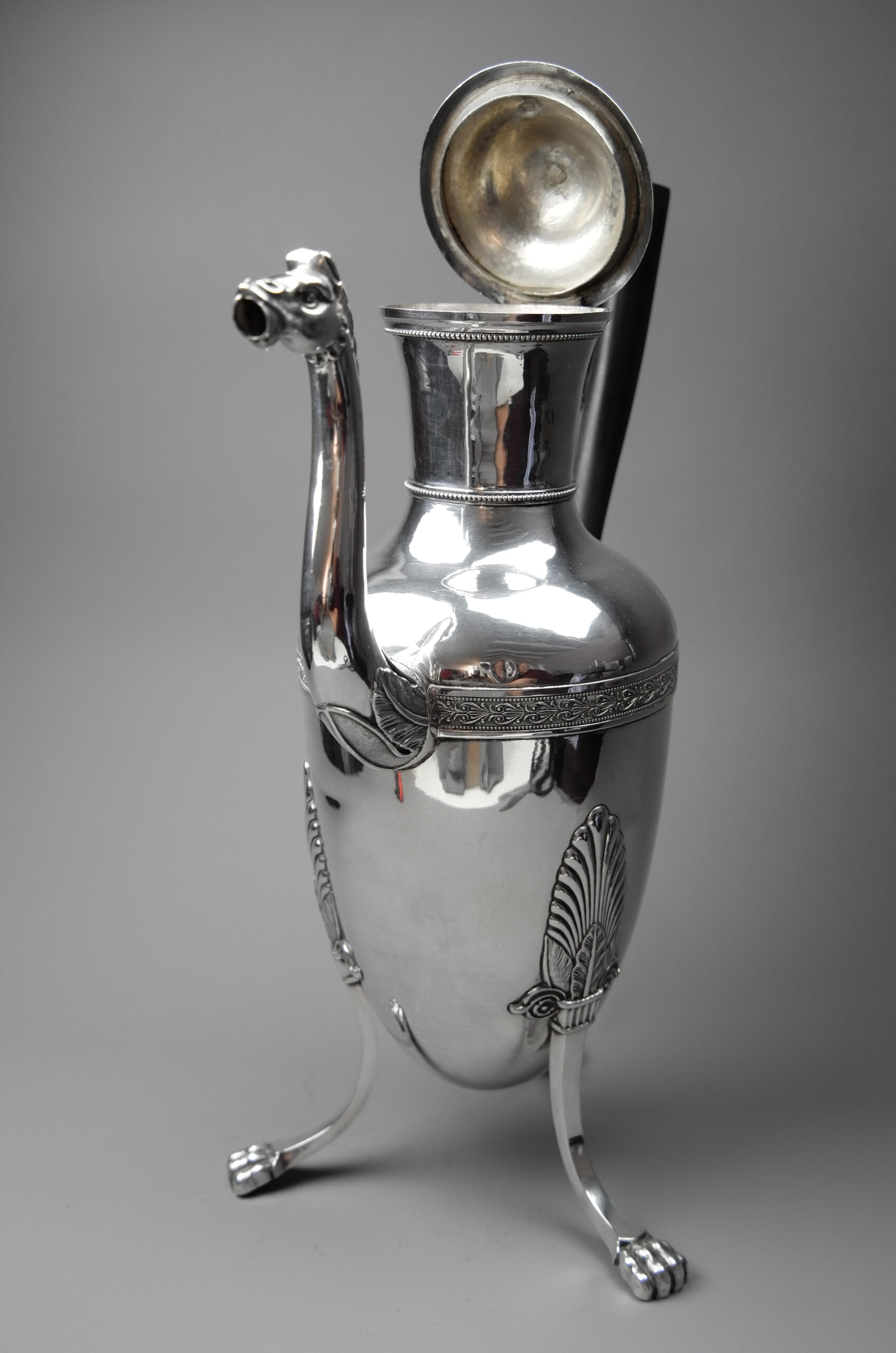 Diese hohe Tripode-Kaffeekanne in Birnenform steht auf auf drei mit Blattwerk verzierten Kartuschen mit Tatzenfüßen. Korpus und Deckel sind ganz im Stil dieser Zeit mit Musterband verziert und die Schnaupe ist als Pferdekopf gestaltet. Als Handhabe dient ein ebonisierter Holzgriff, eine Blüte mit Blattwerk dient als Deckelknauf.