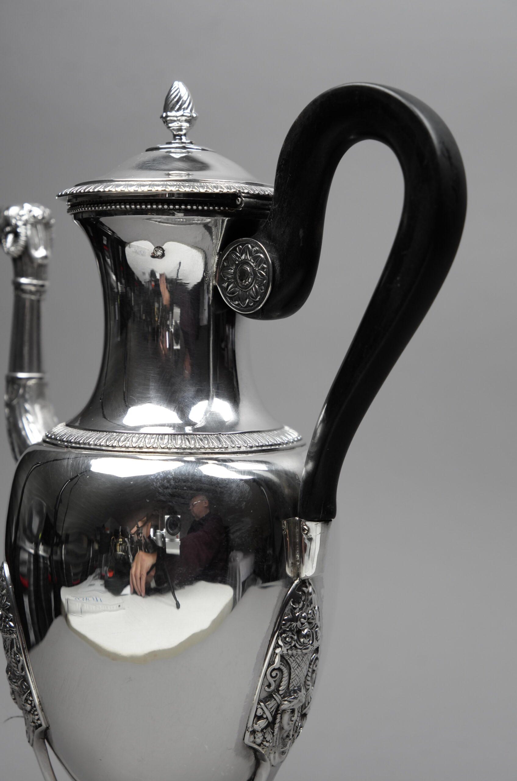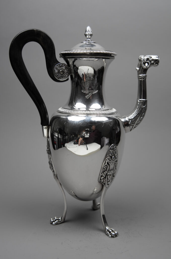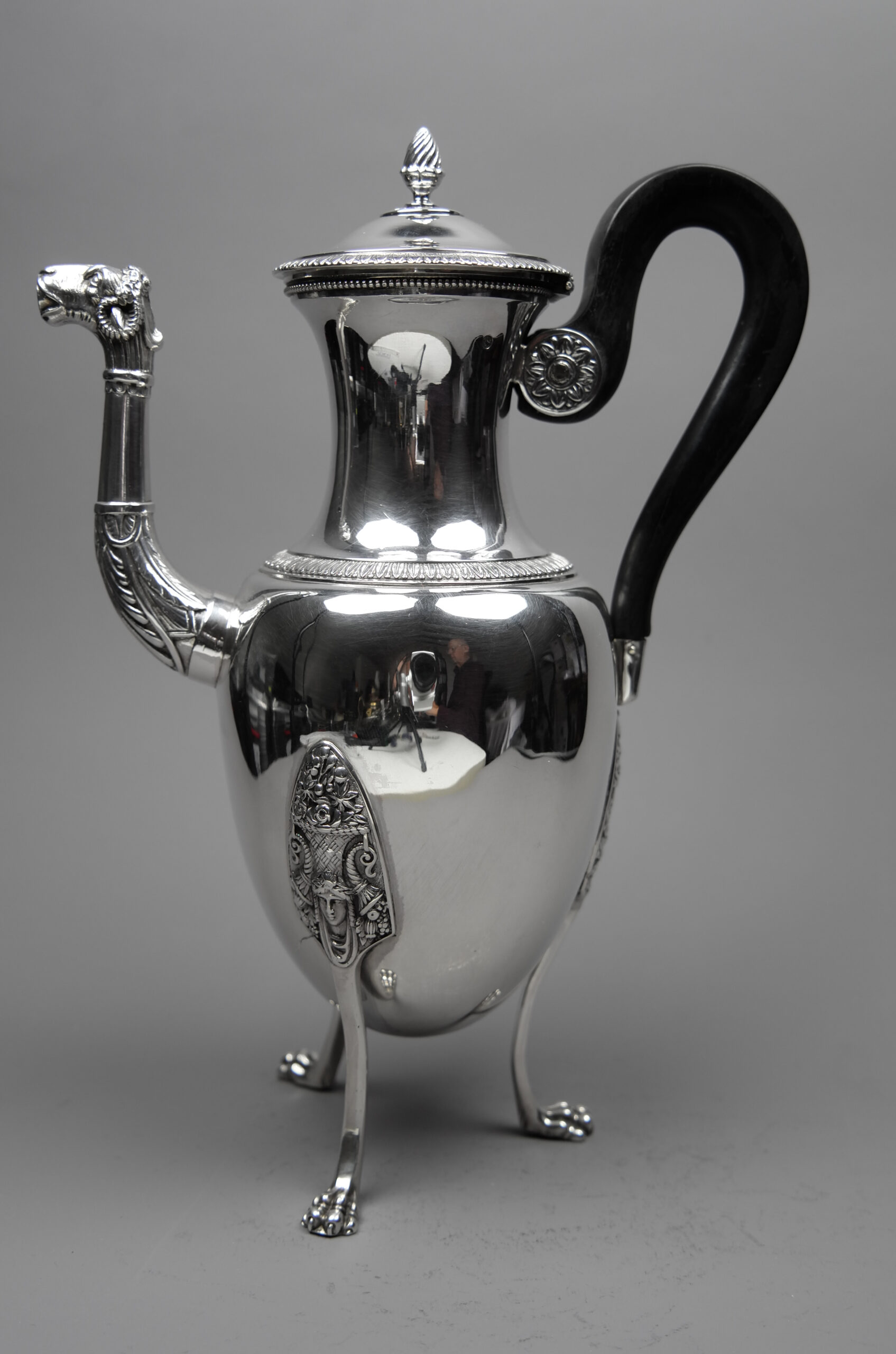 Eine Pariser Triode Kaffeekanne in Eiform auf drei Tatzenfüßen mit Motivbefestigung (Portrait Göttin mit Füllhörnern), Blattfriese zieren Klappdeckel und Schulter, der Ausguss ist als Widderkopf modelliert und die Holzhandhabe ist ebonisiert. Eine plastische Blütenknospe dient als Deckelknauf, am Half befindet sich seitlich ein graviertes Wappen.