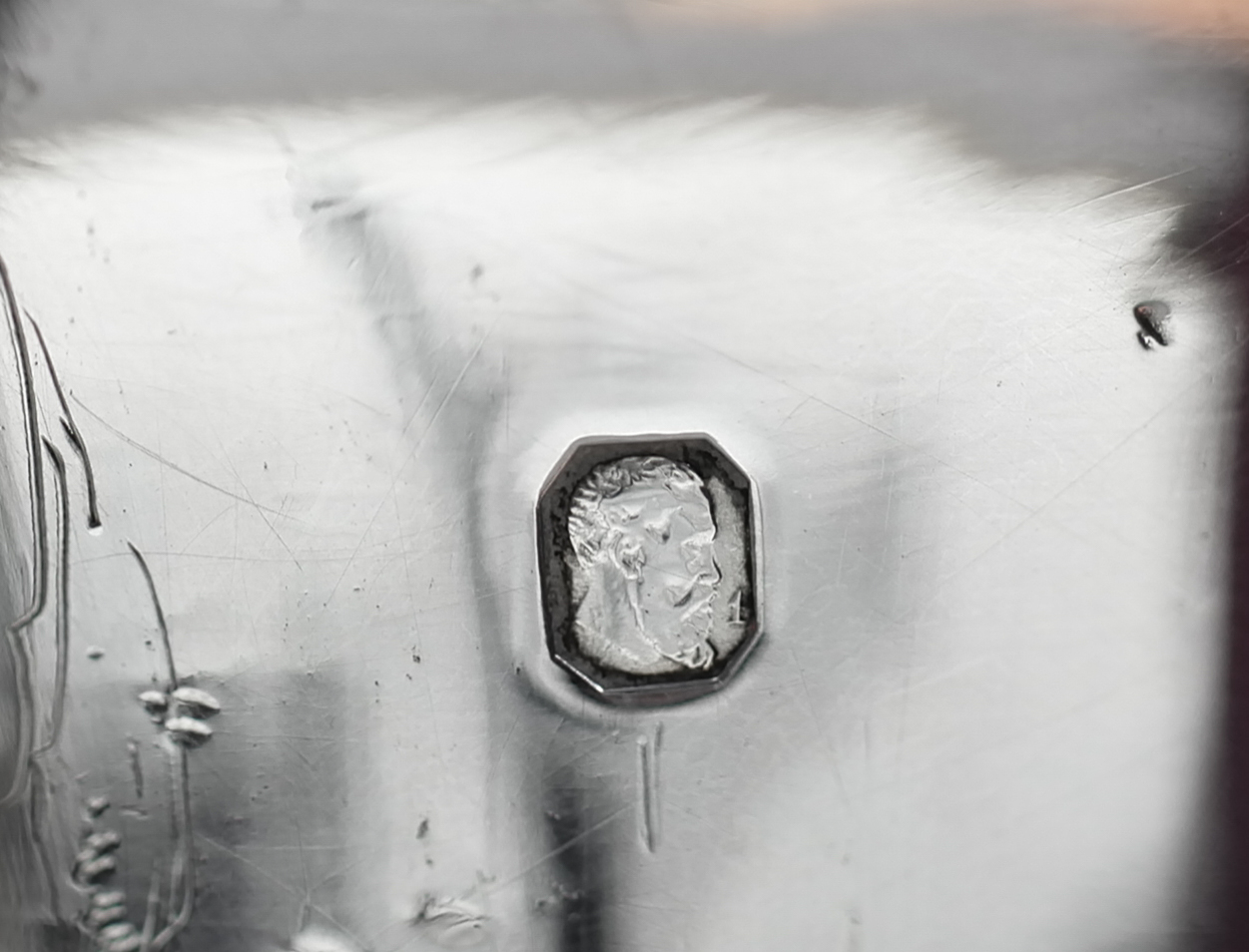 Gepunzt ist die Tripode mit dem Kopf des Michelangelo mit 1 für 950er Silber, Paris, von 1819-1838, mit dem Kopf der Ceres als Garantiestempel von Paris sowie mit der Meistermarke NAF für Nicolas Auguste Frankson.