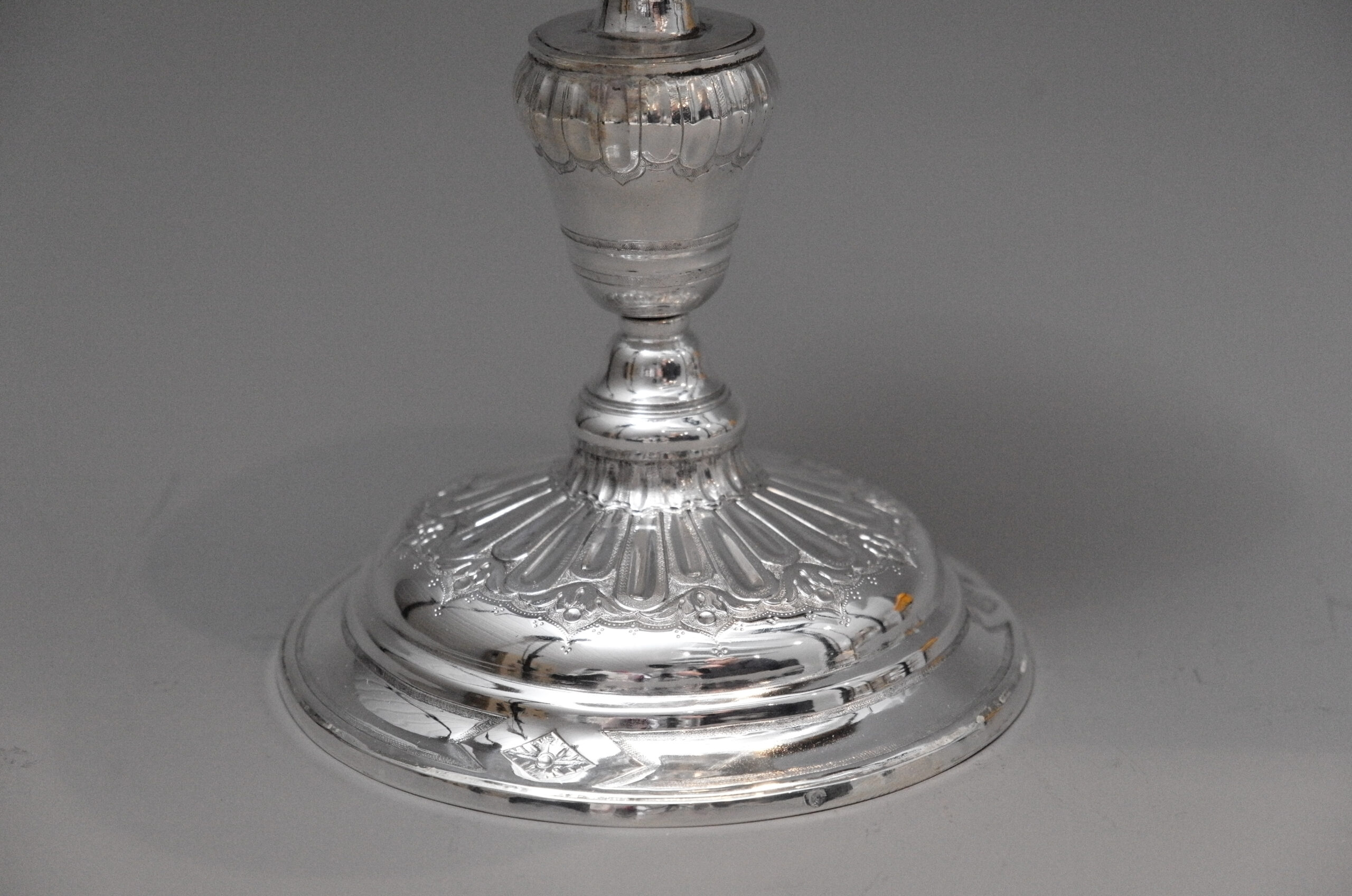 Ein französisches, silbernes Ziborium aus der zweiten Hälfte des 18. Jhdt. mit einem runden, getreppten Standfuß und einem balusterförmigen Schaft, beide mit gravierten und geprägten Muster. Glatte Kuppa mit abnehmbarem Deckel und mit plastischem Kreuz auf Kugel als Knauf.