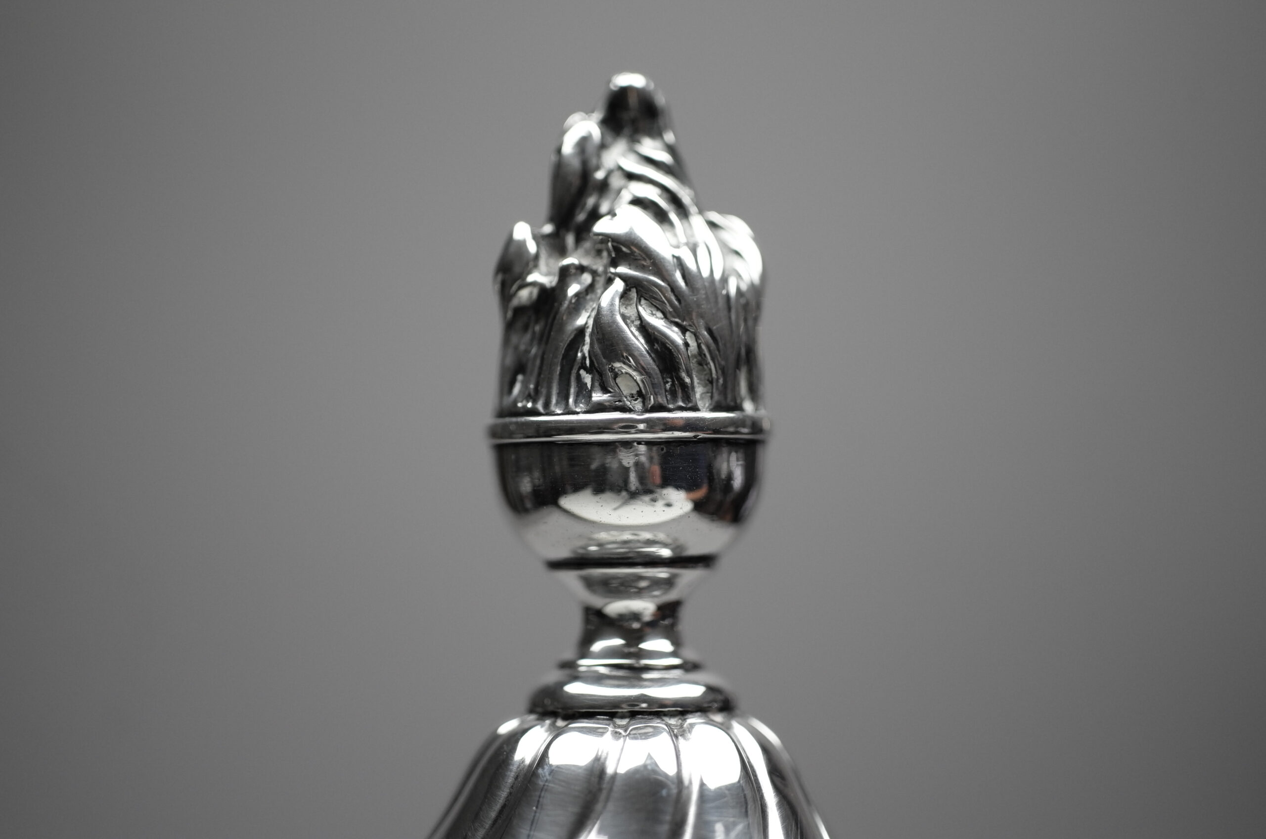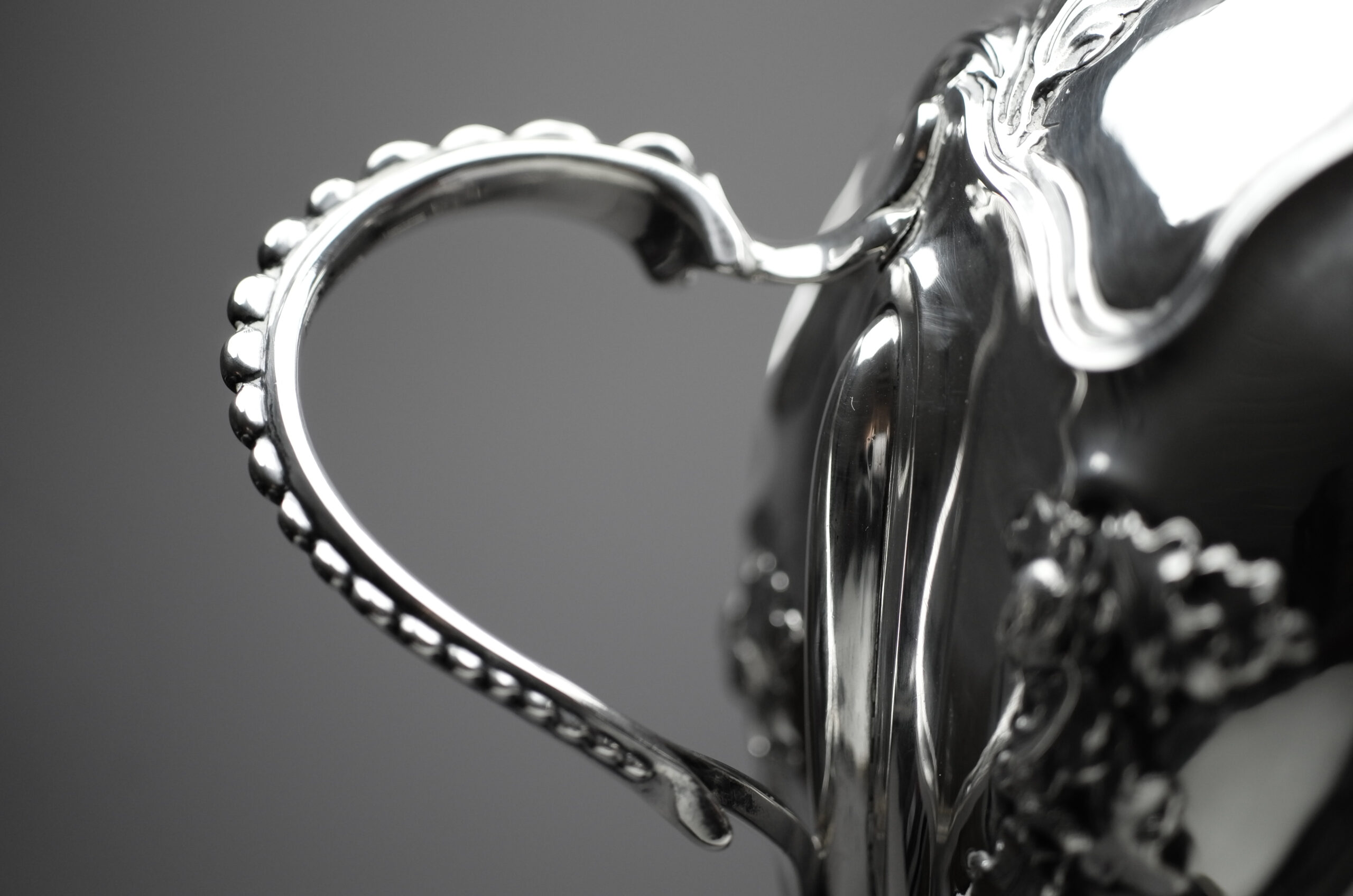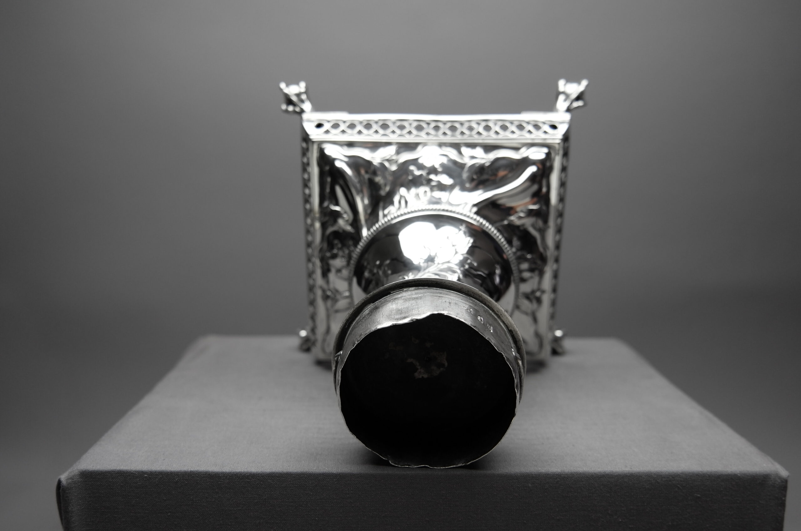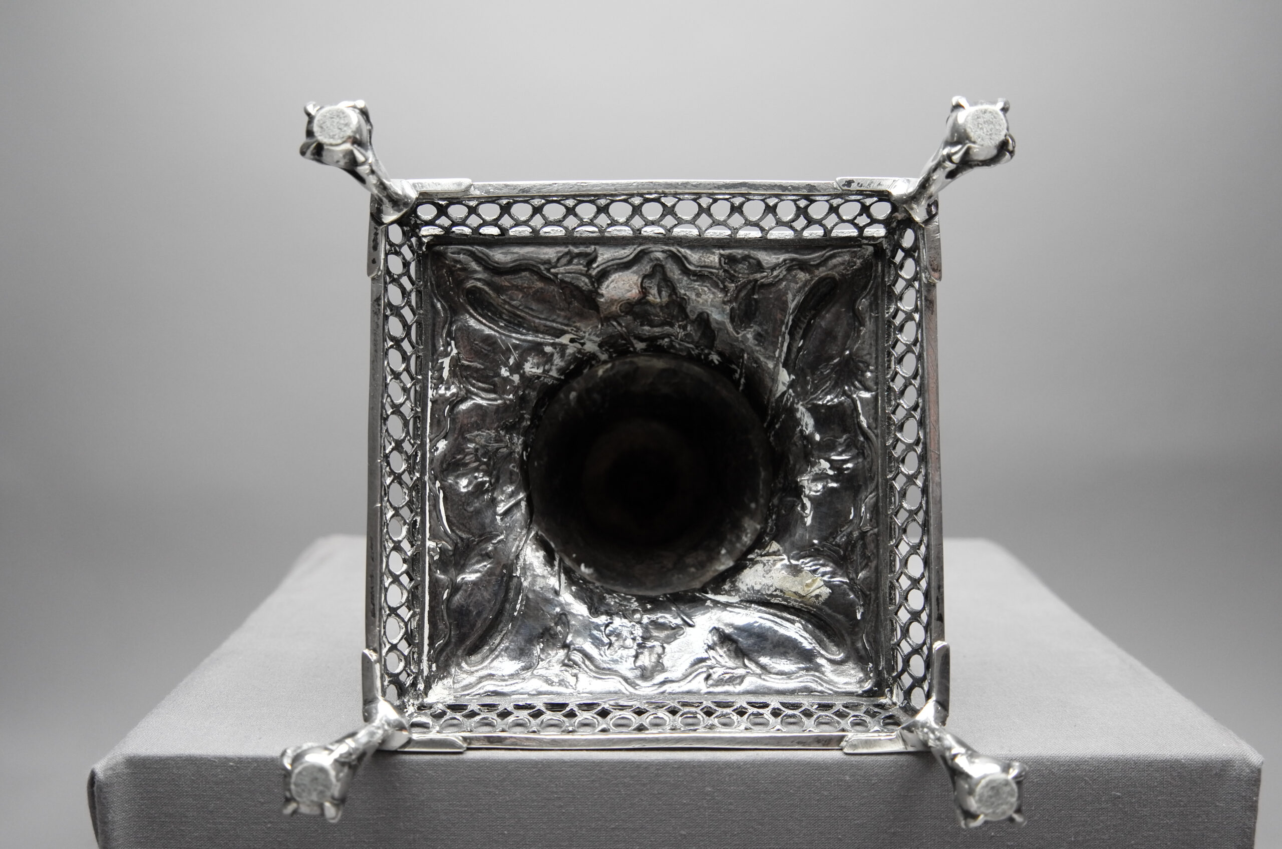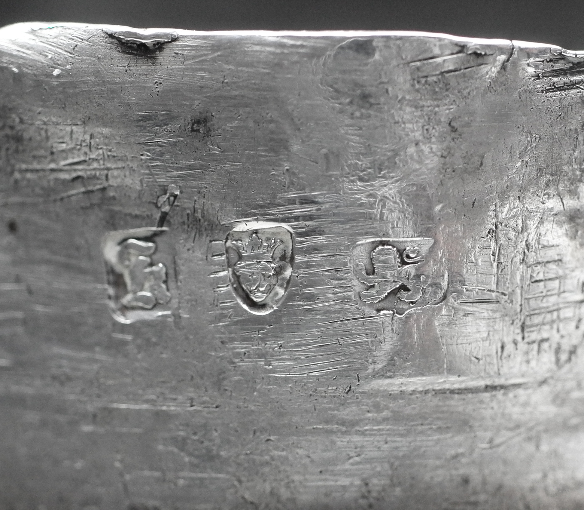 Markiert sind alle Teile mit dem linksschreitenden Löwen für Sterlingsilber, mit dem gekrönten Leopardenkopf für London, mit dem Jahresbuchstaben k für das Jahr 1765 sowie mit einer verwischten Meistermarke F·B, die sich leider nicht auflösen lässt.