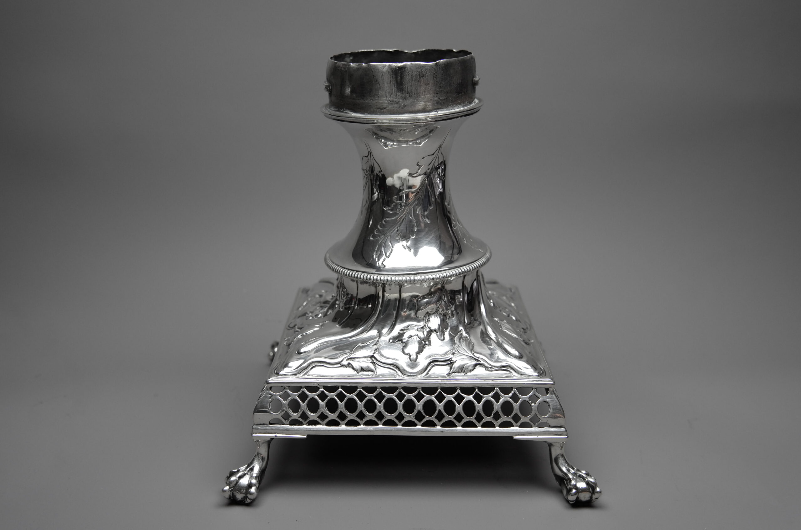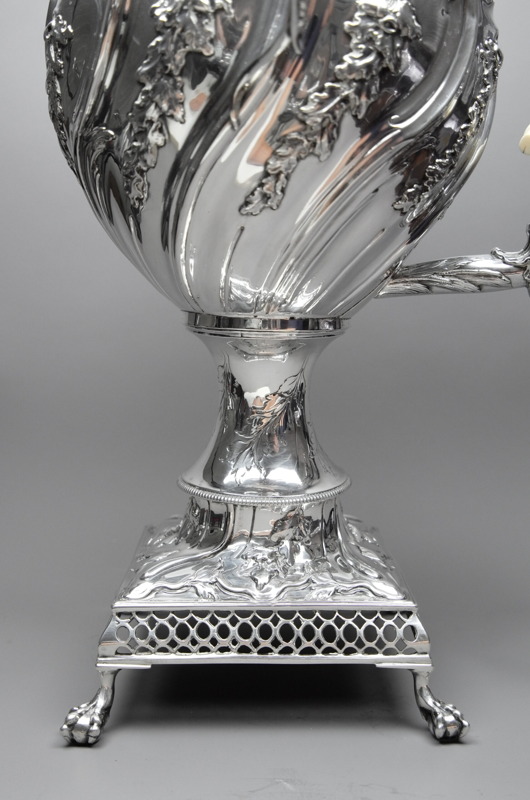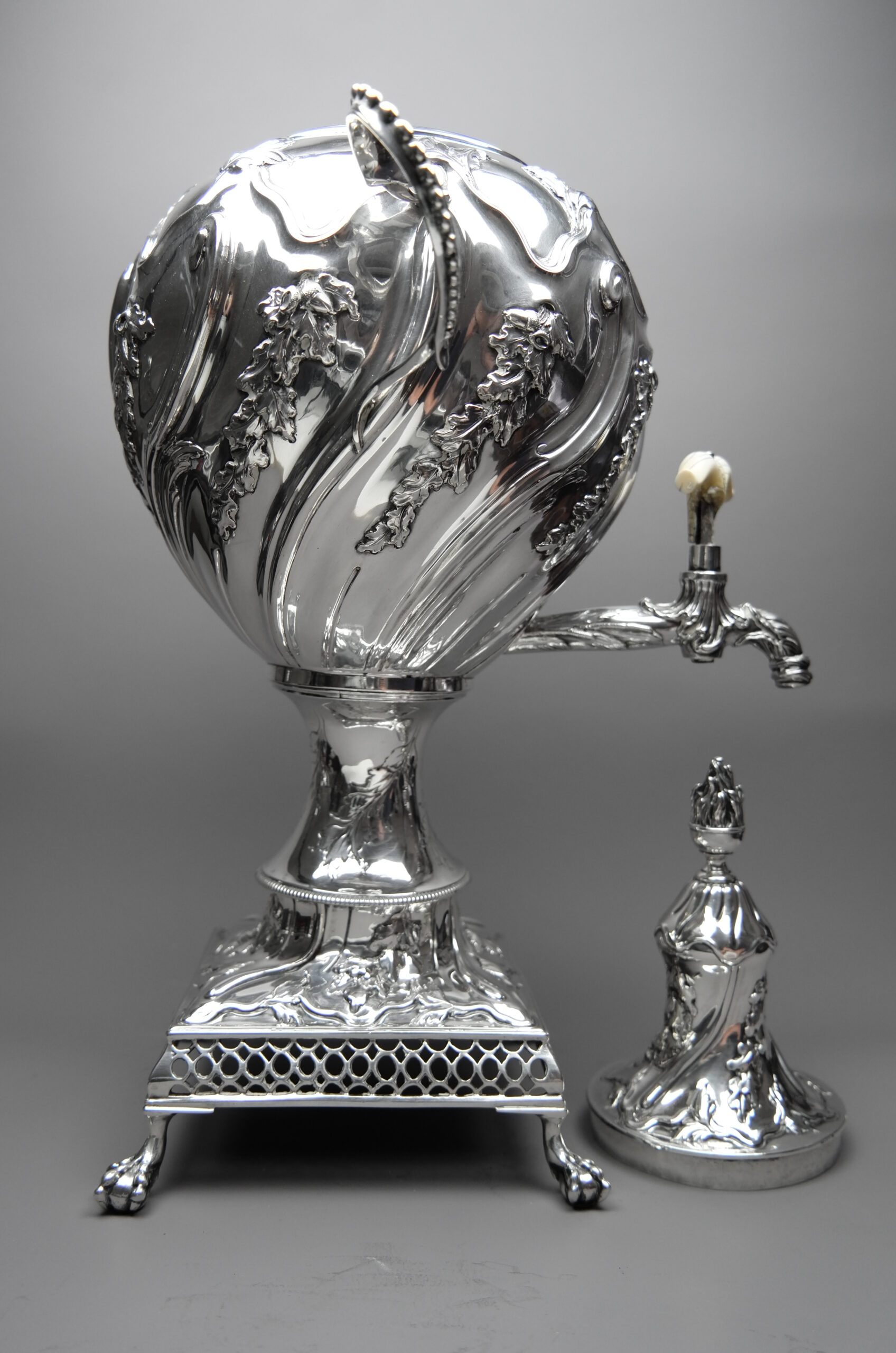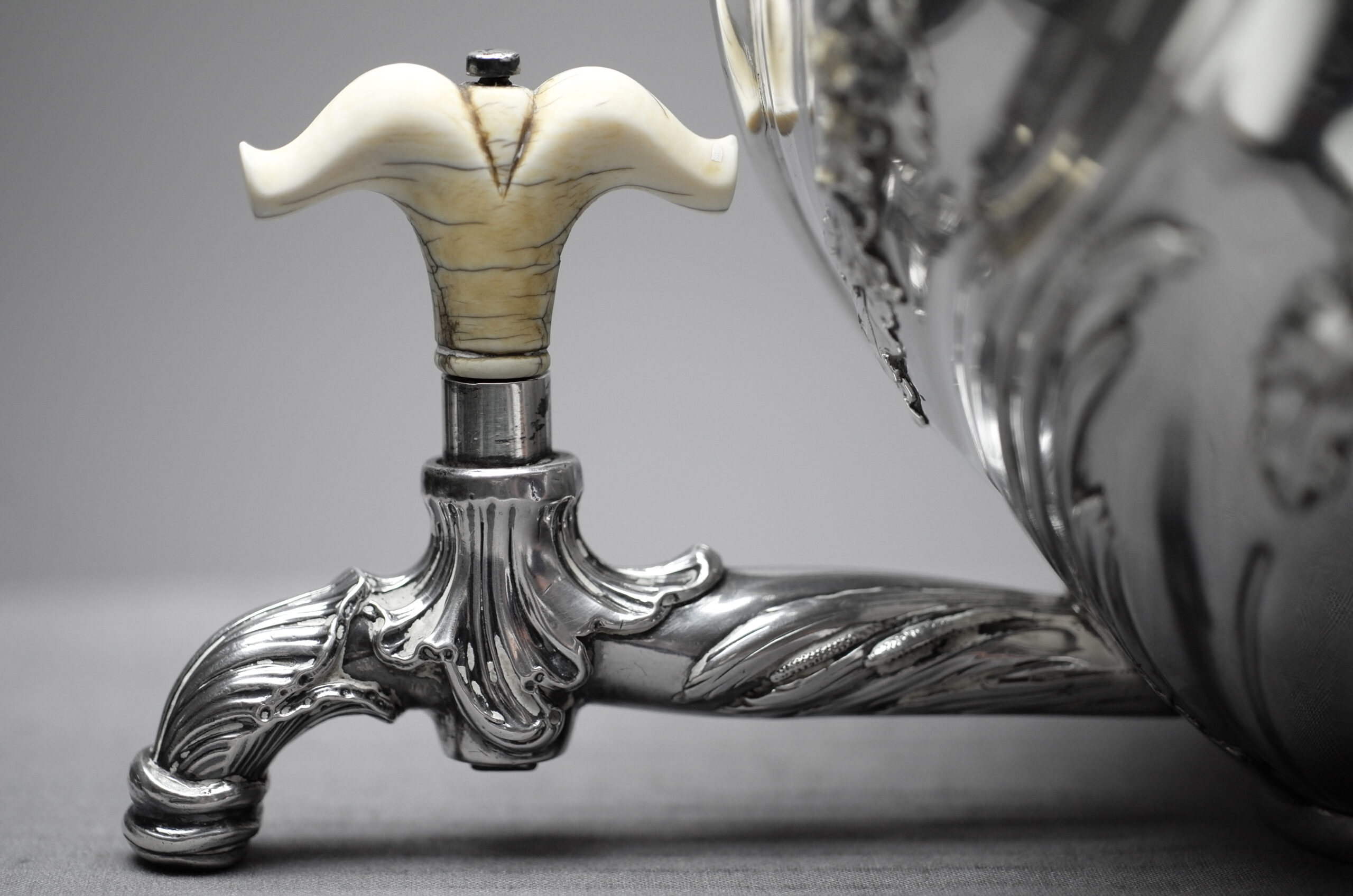 Dieser silberne Samowar besteht aus drei Teilen, dem eiförmigen Kessel mit zwei geschwungenen Henkeln sowie einem Hahn mit Drehknauf aus Bein, dem quadratischen Fuß auf vier Krähenfüßen mit Brennkammer für Holzkohle und dem hochgewölbten Deckel mit plastischer Knospe. Alle Teile sind reichhaltig verziert mit geprägten Rocaillen sowie Blatt- und Blütenmuster. Der Drehknauf aus Bein ist leider teilweise gebrochen.