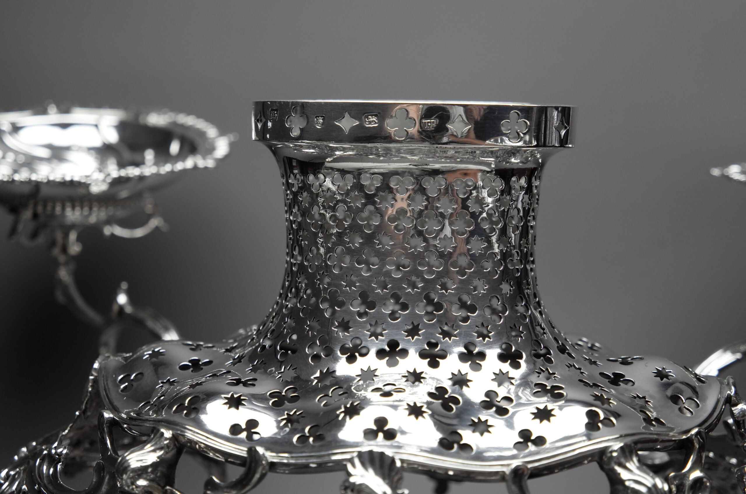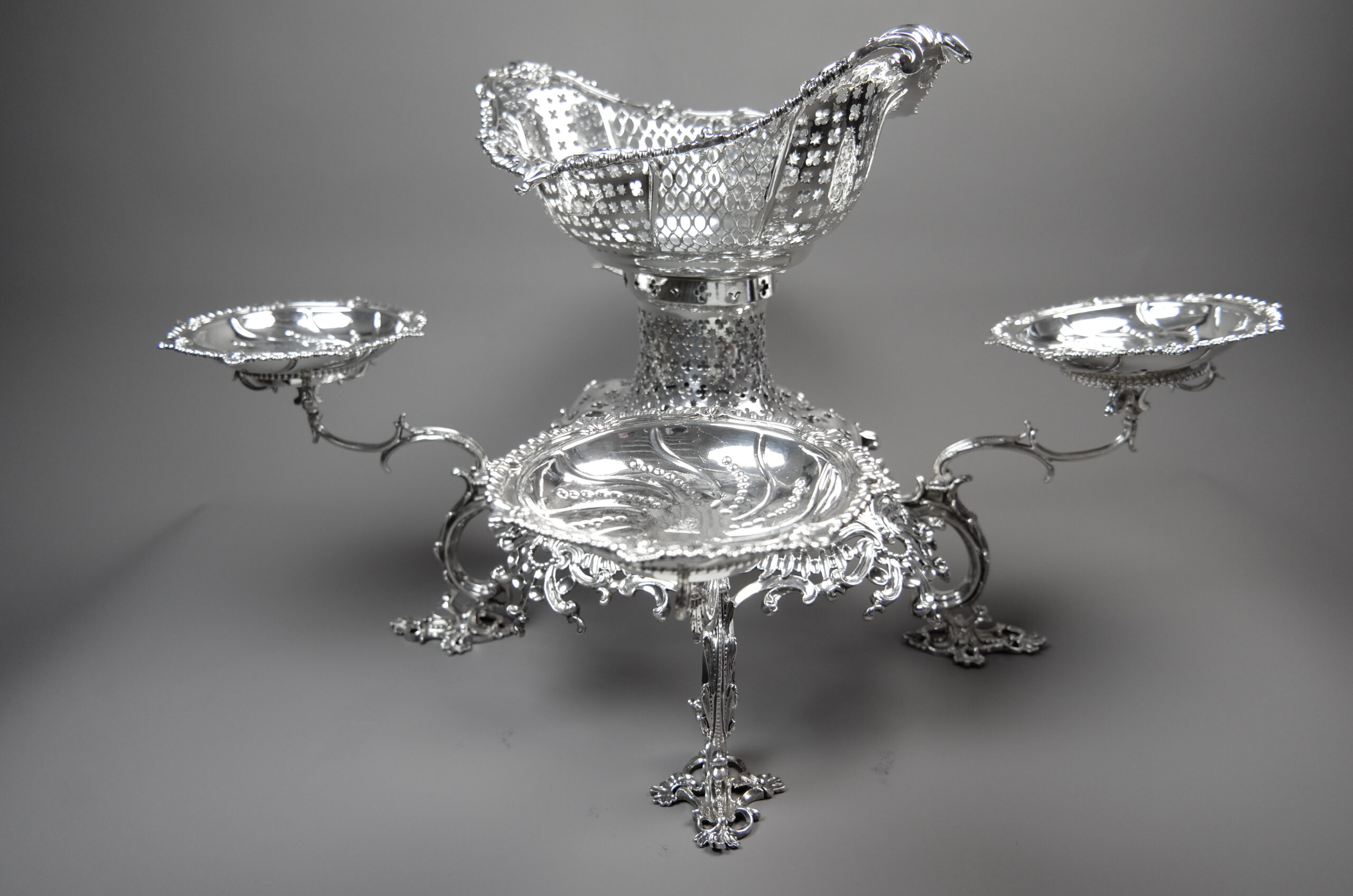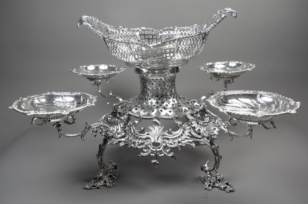 Im Wesentlichen handelt es sich bei dem Objekt um einen in England typisch gebräuchlichen Tafelaufsatz mit einem zentralen durchbrochenen Korb und vier Presentoirs, allesamt abnehmbar. Das Dekor ist in reinem Rokoko gehalten. Die Epergne steht auf vier Tatzenfüssen, der Korpus besteht aus einer Basis mit pflanzlichem Dekor und aus einem Halsbereich mit ähnlich durchbrochenem Muster, wie der zentrale Korb.