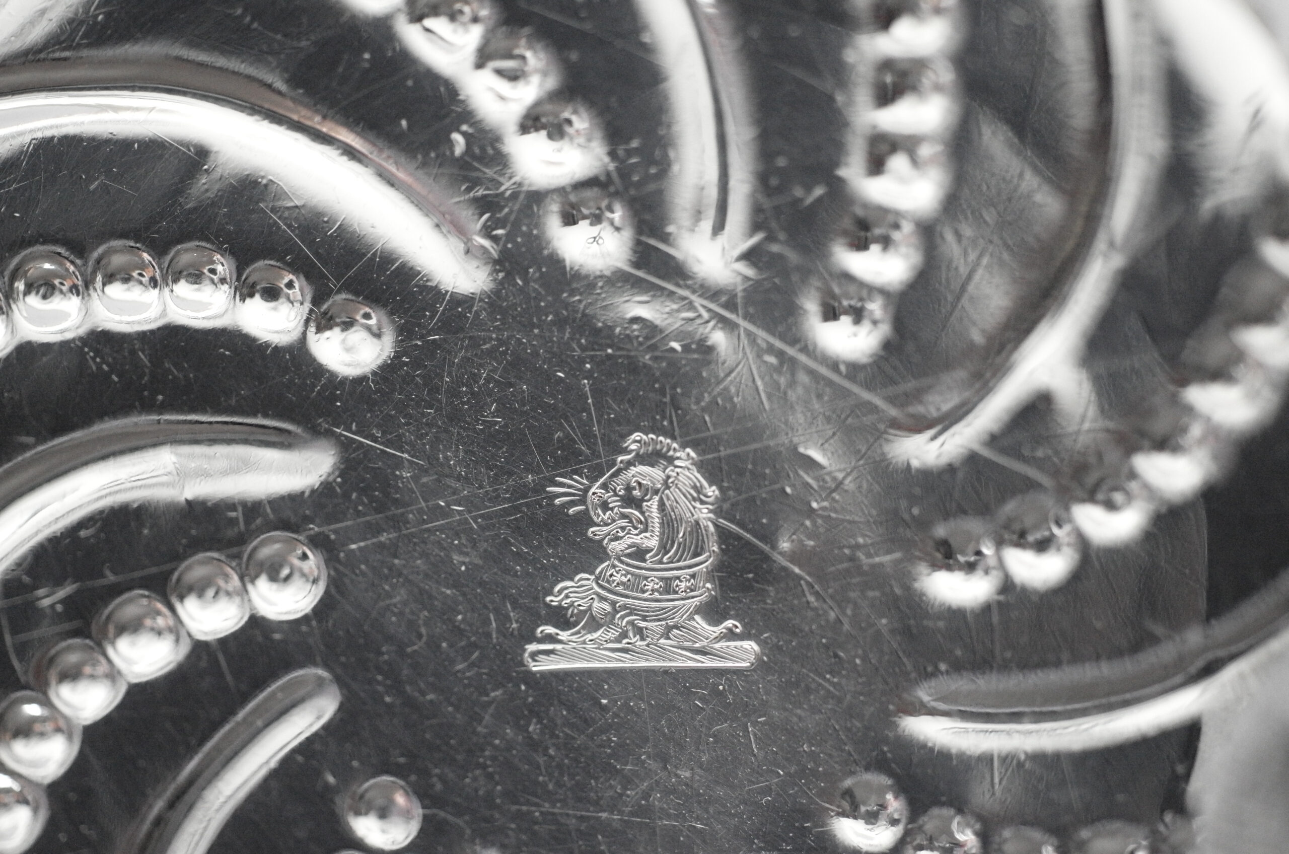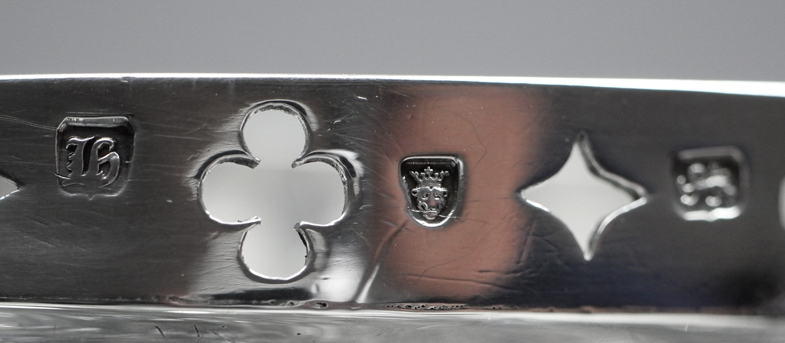 Gepunzt ist die Epergne mit dem linksschreitenden Löwen für Sterlingsilber, mit dem gekrönten Leopardenkopf für London, mit dem Jahresbuchstaben H für das Jahr 1763 sowie mit der Meistermarke T·P für Thomas Pitts I.