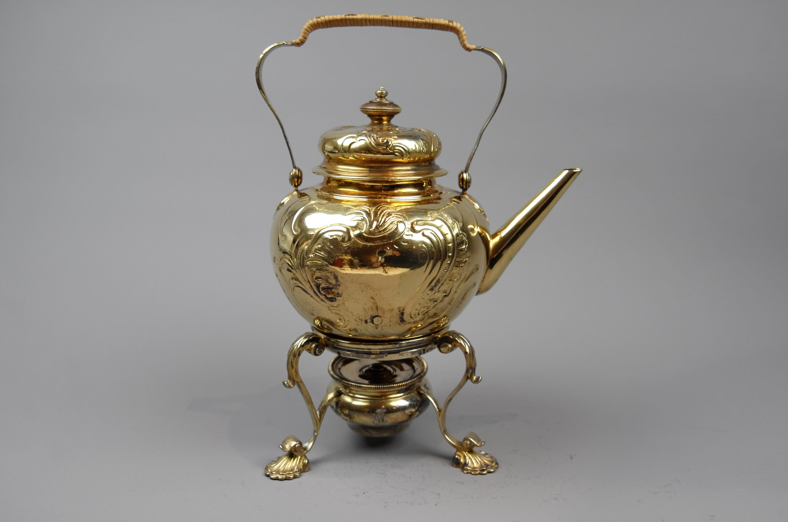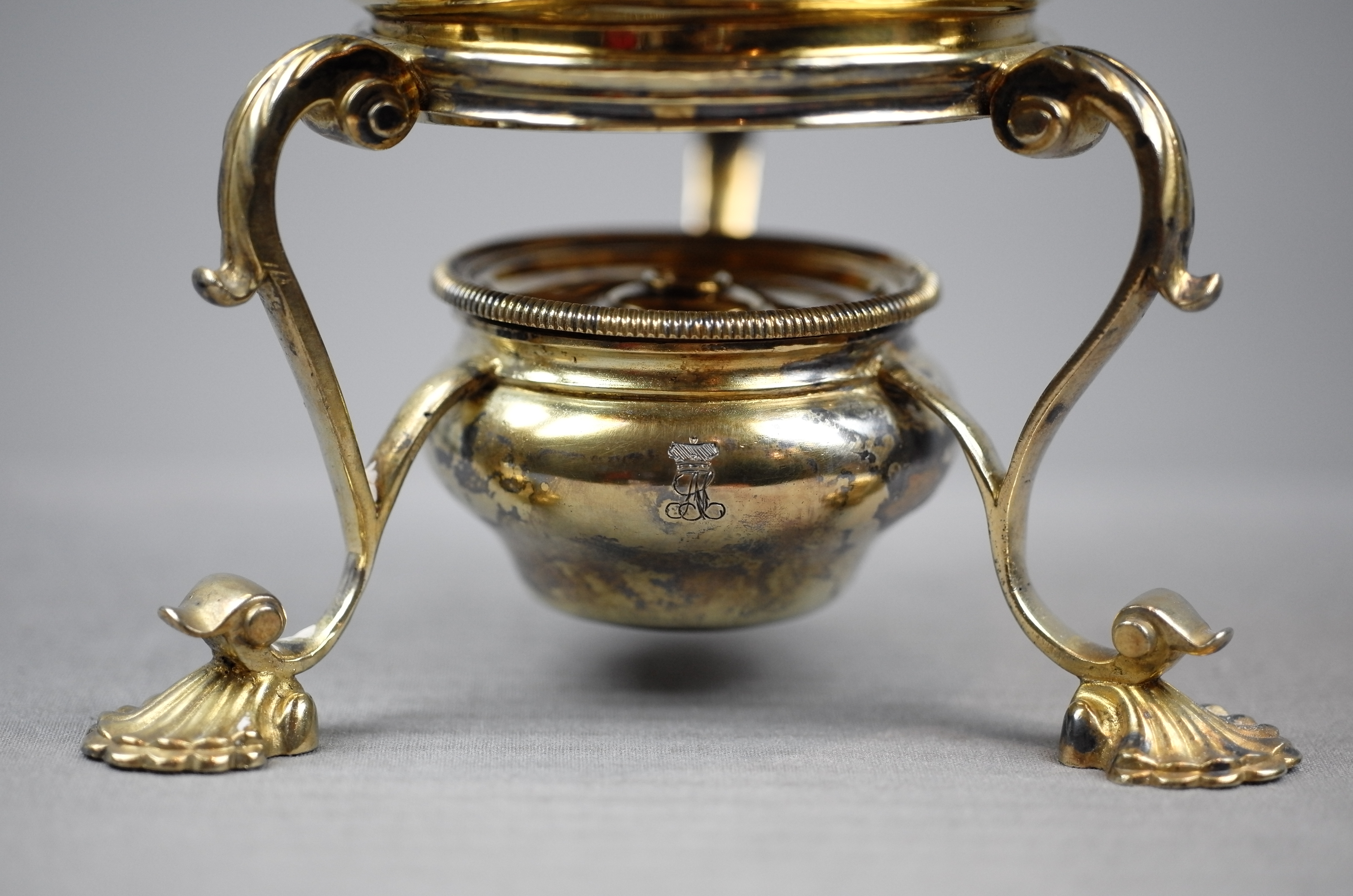 Der Rechaud ist ebenfalls mit den Insignien der britischen Monarchie versehen. Er steht auf 3 Tatzenfüßen mit Akanthuslaub, der Brenner ist abnehmbar und gesondert markiert.