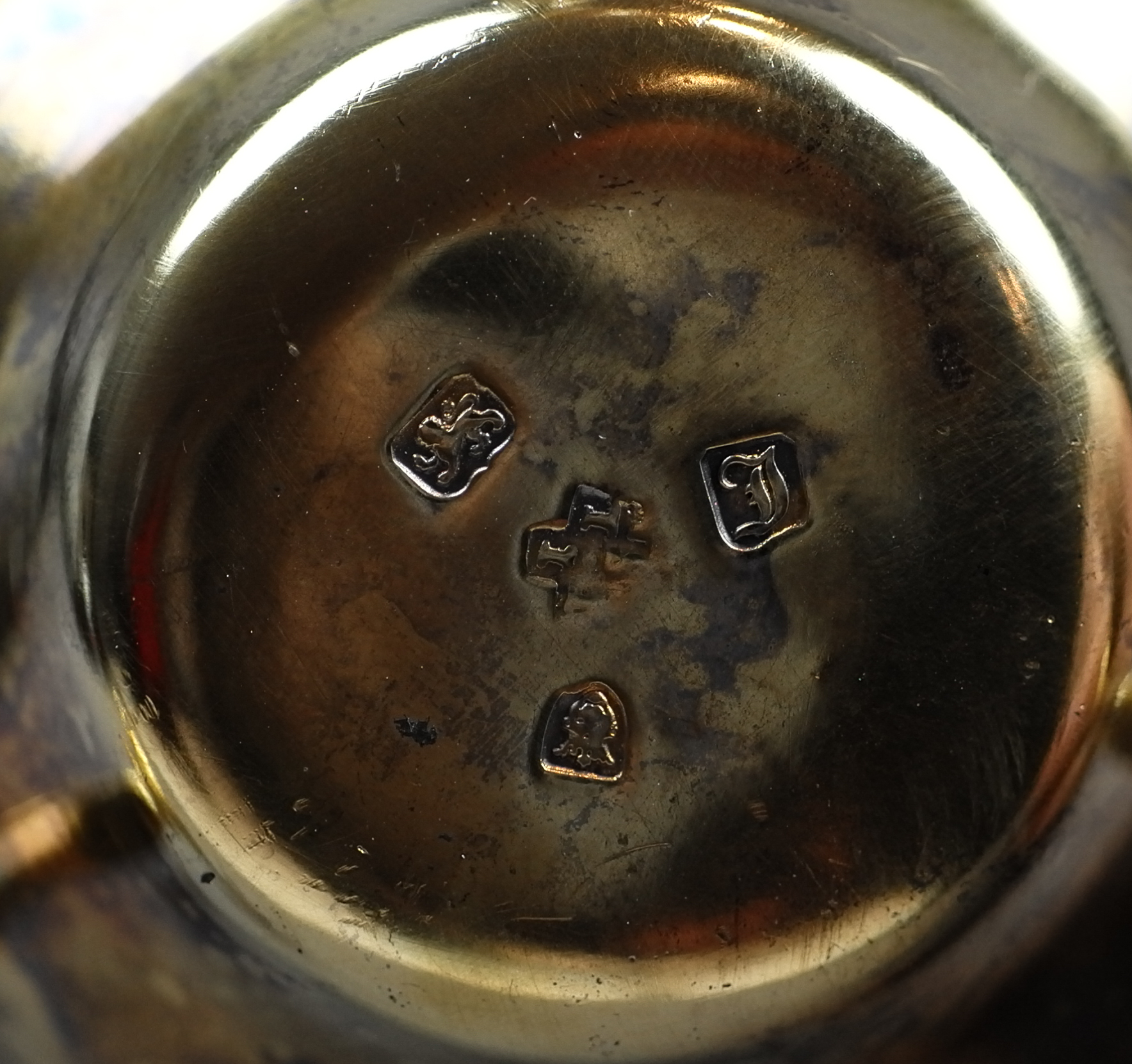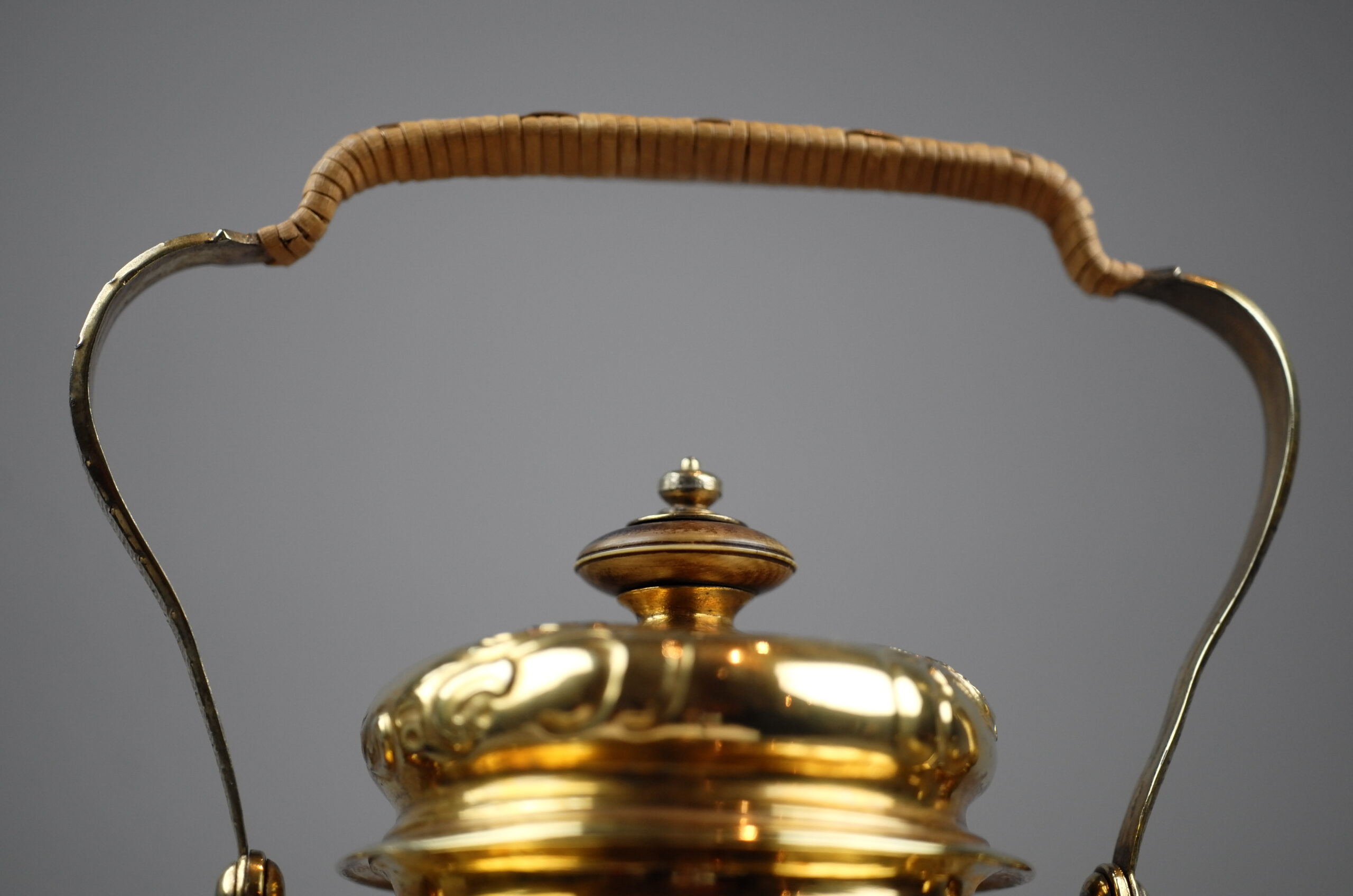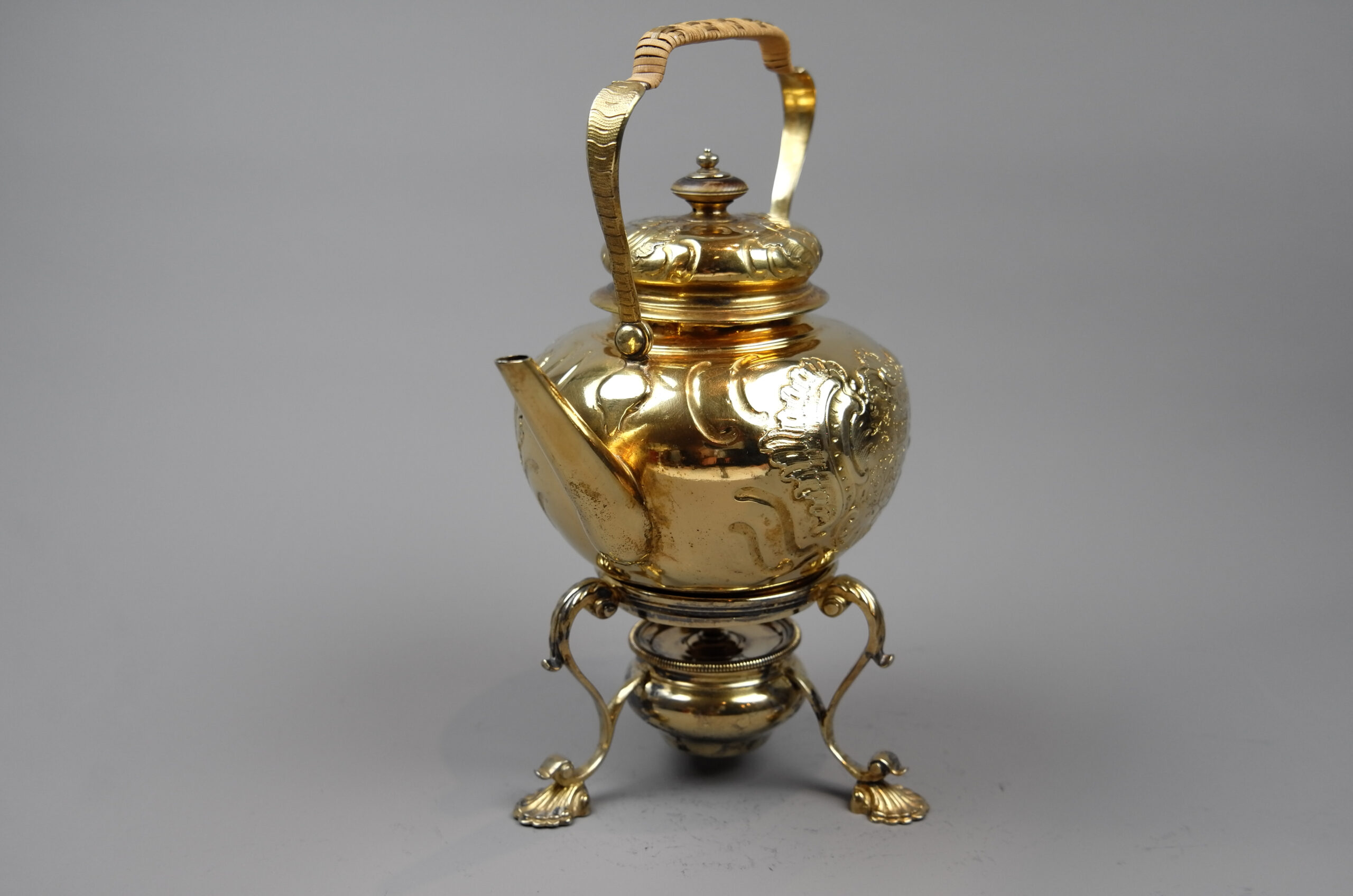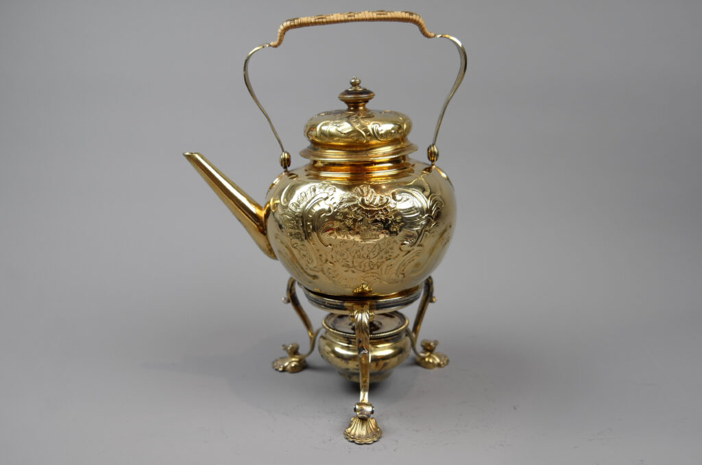 Das Set aus Kessel und Rechaud ist vergoldet und von unterschiedlichen Meistern gefertigt. Charlotte von Mecklenburg Strelitz hat vermutlich bei Ihrer Reise zur Hochzeit mit König Georg am 08.09.1761 den Kessel als Mitgift nach England gebracht. Der Rechaud wurde später in England ergänzt.