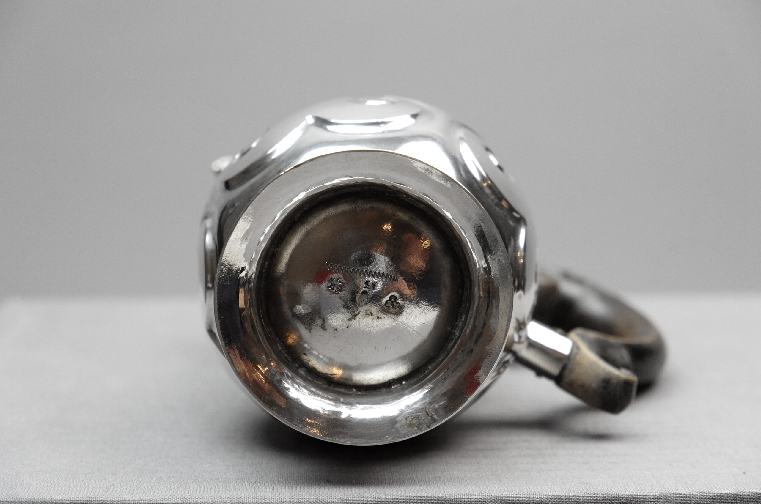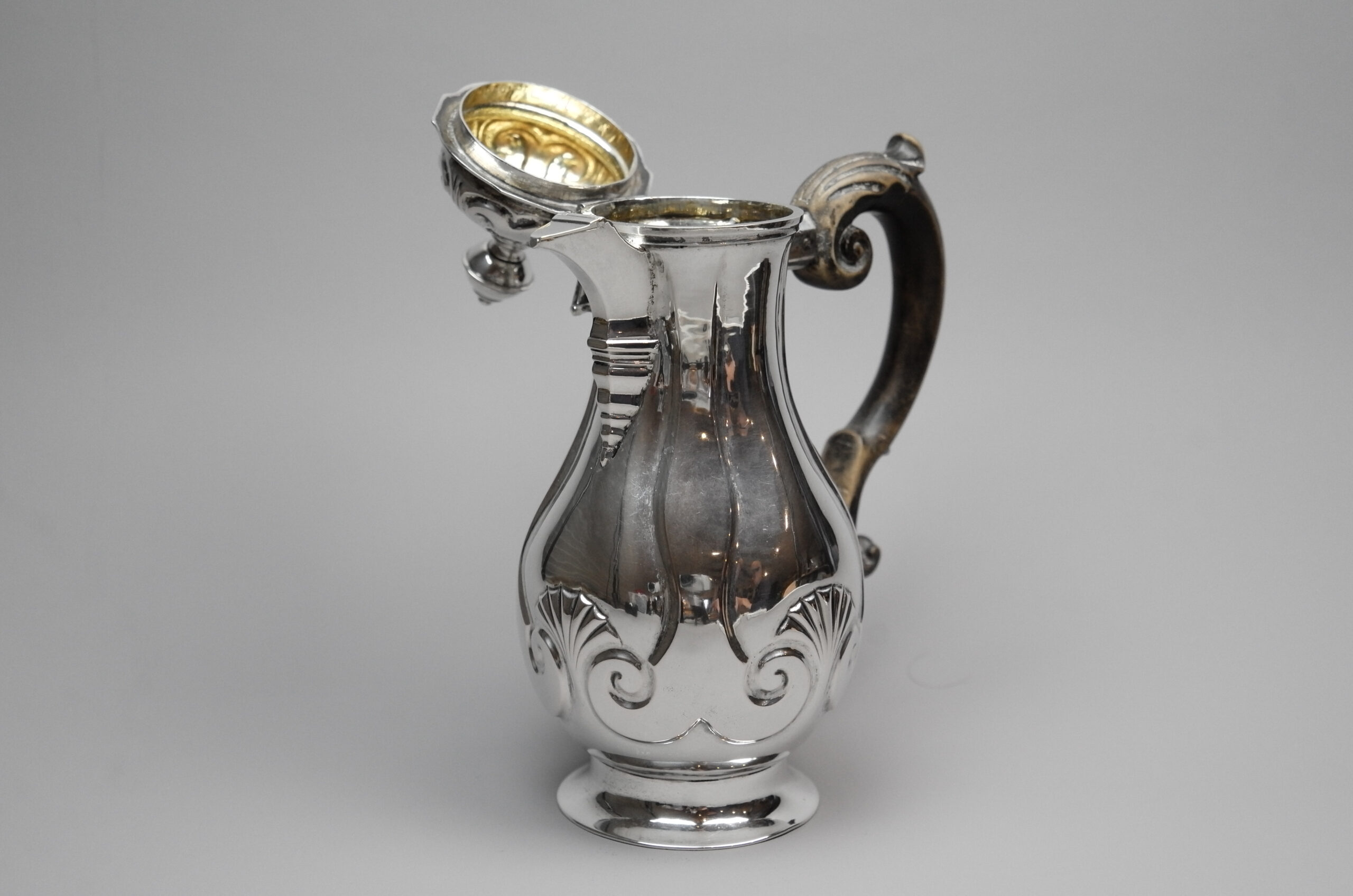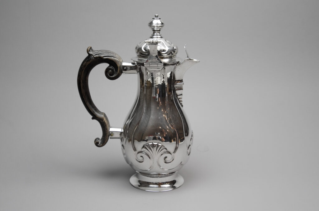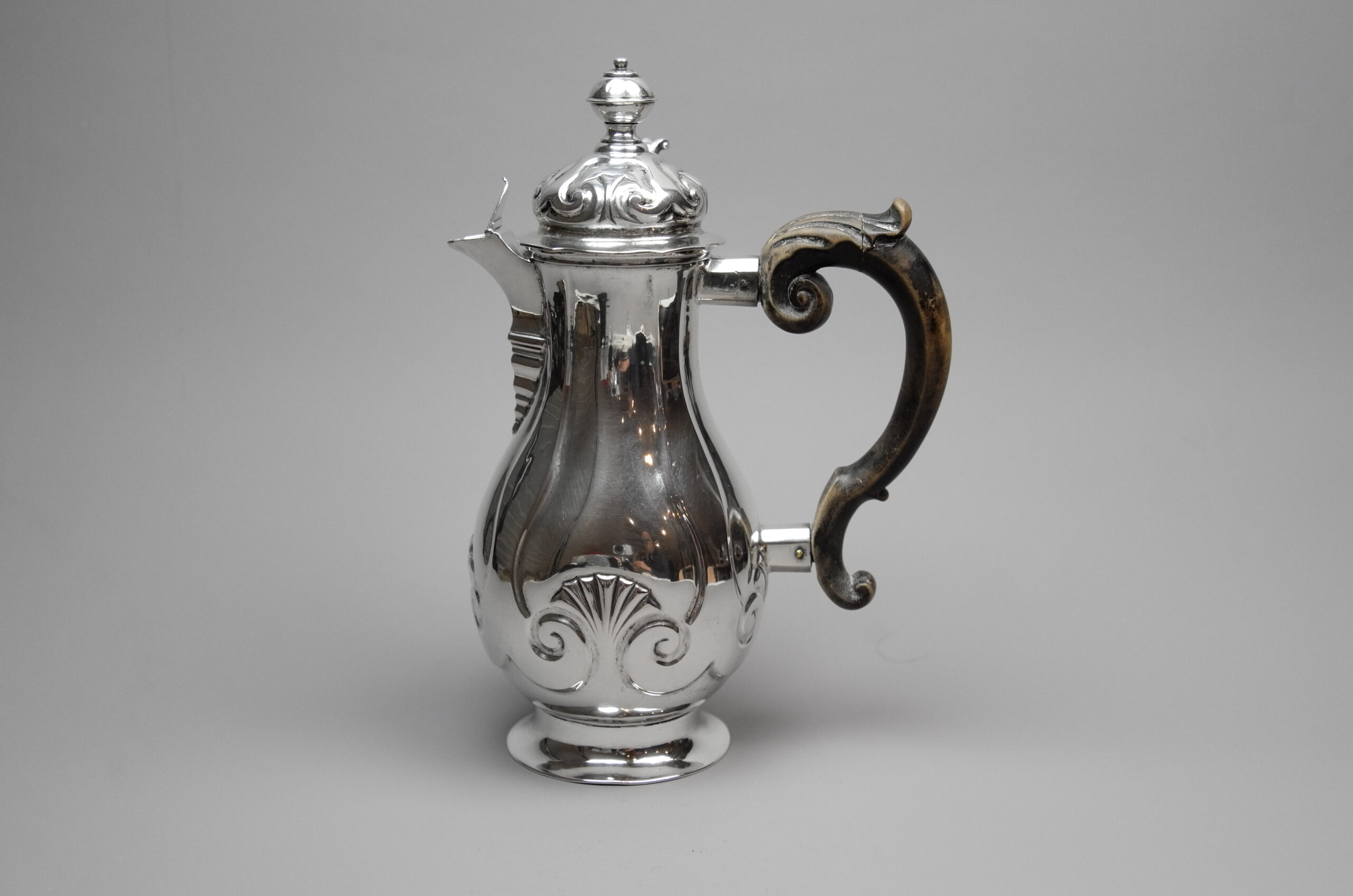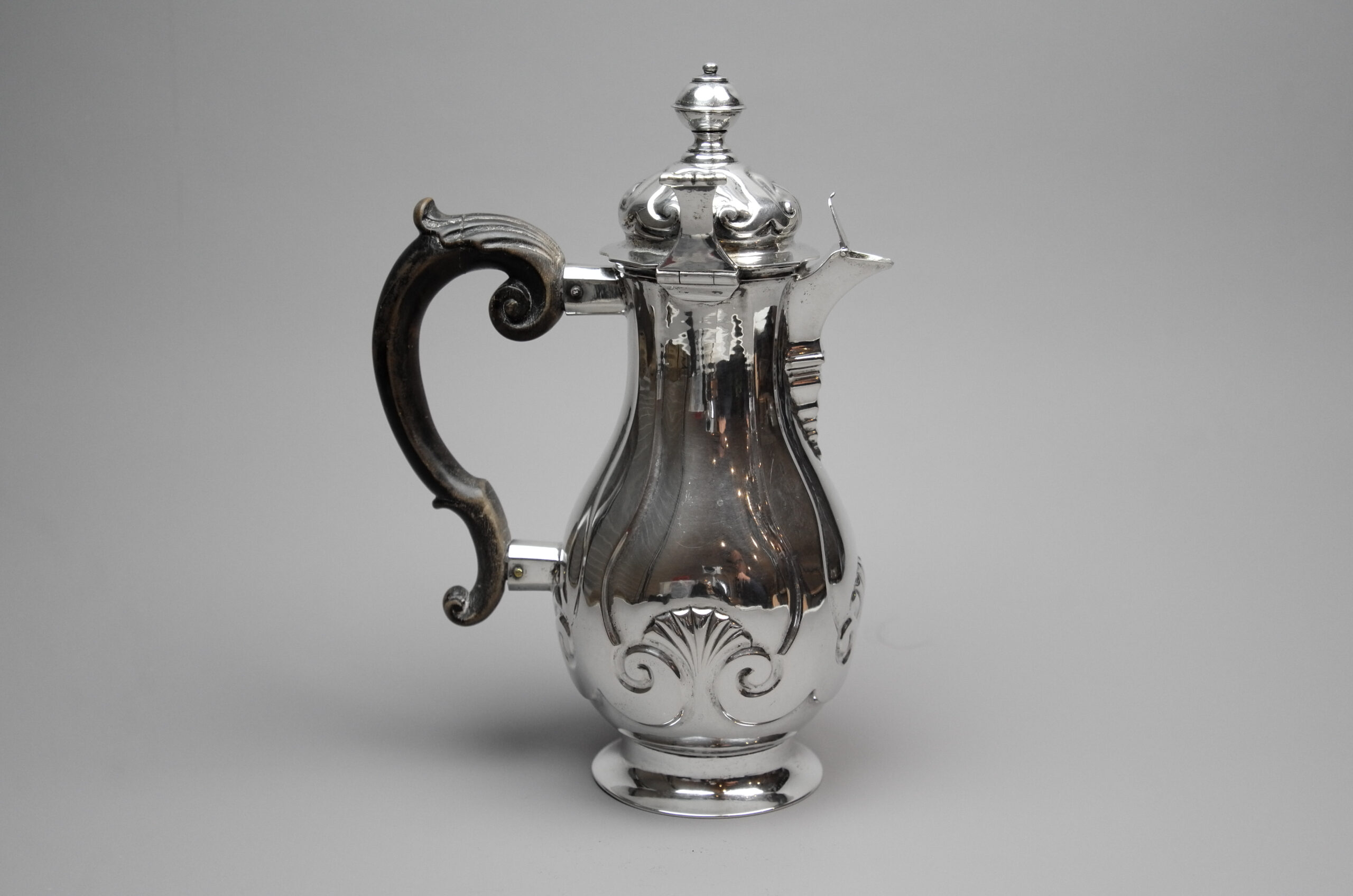 Ein zierliches und dezent reliefiertes Kännchen in Balusterform auf rundem Standfuß, mit Kugelknauf auf dem Scharnierdeckel und floral beschnitzter, volutierter Handhabe aus Holz. Innen vergoldet.