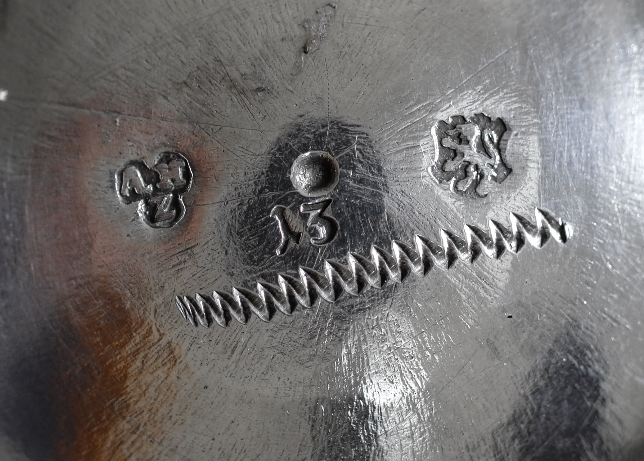 Als Punzen sind zu finden die Zahl 13 für 13-lötiges Silber, ein linksschreitender Löwe im Wappen als Stadtmarke für Rudolstadt, die Initialen AHZ für den Meister Adam Heinrich Zürn, geb. 1706, Hoflieferant ab 1755 und gestorben 1772.
