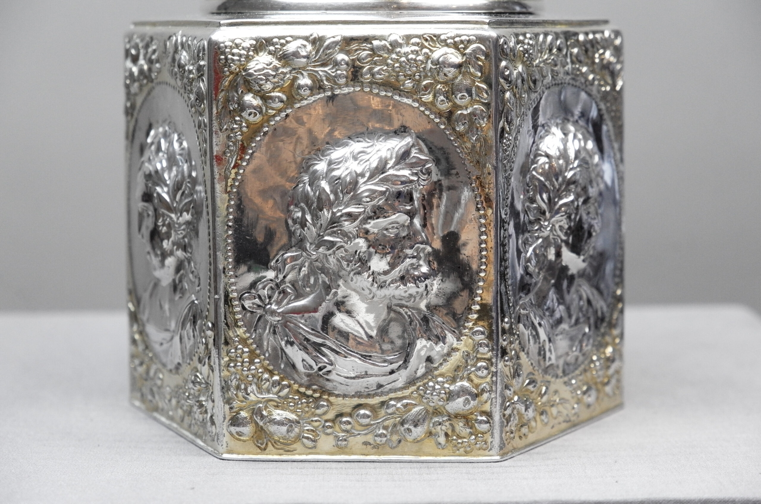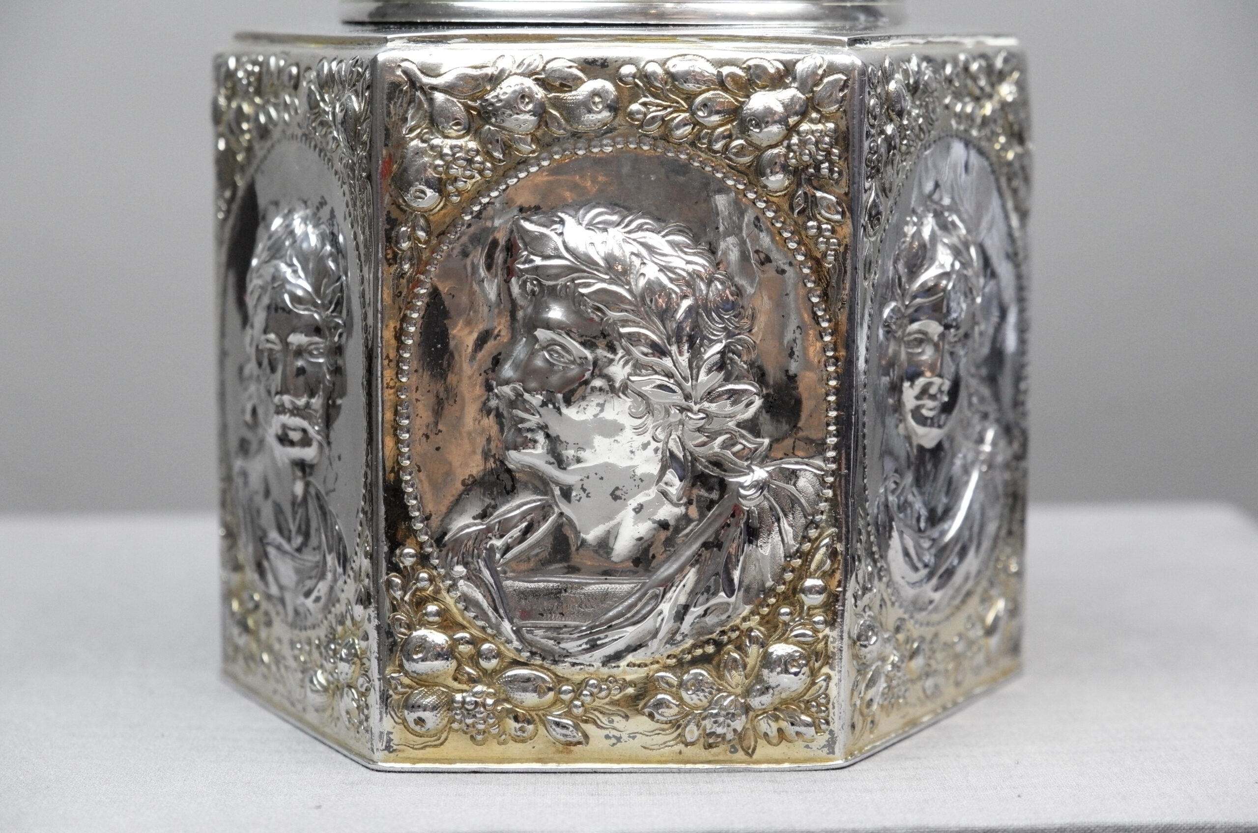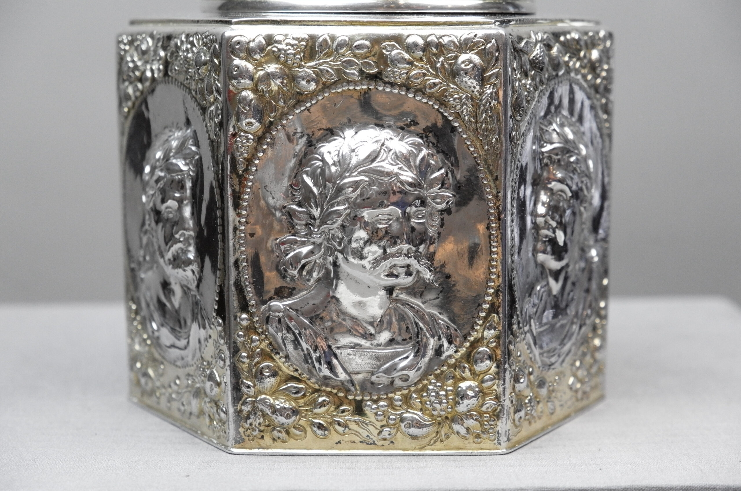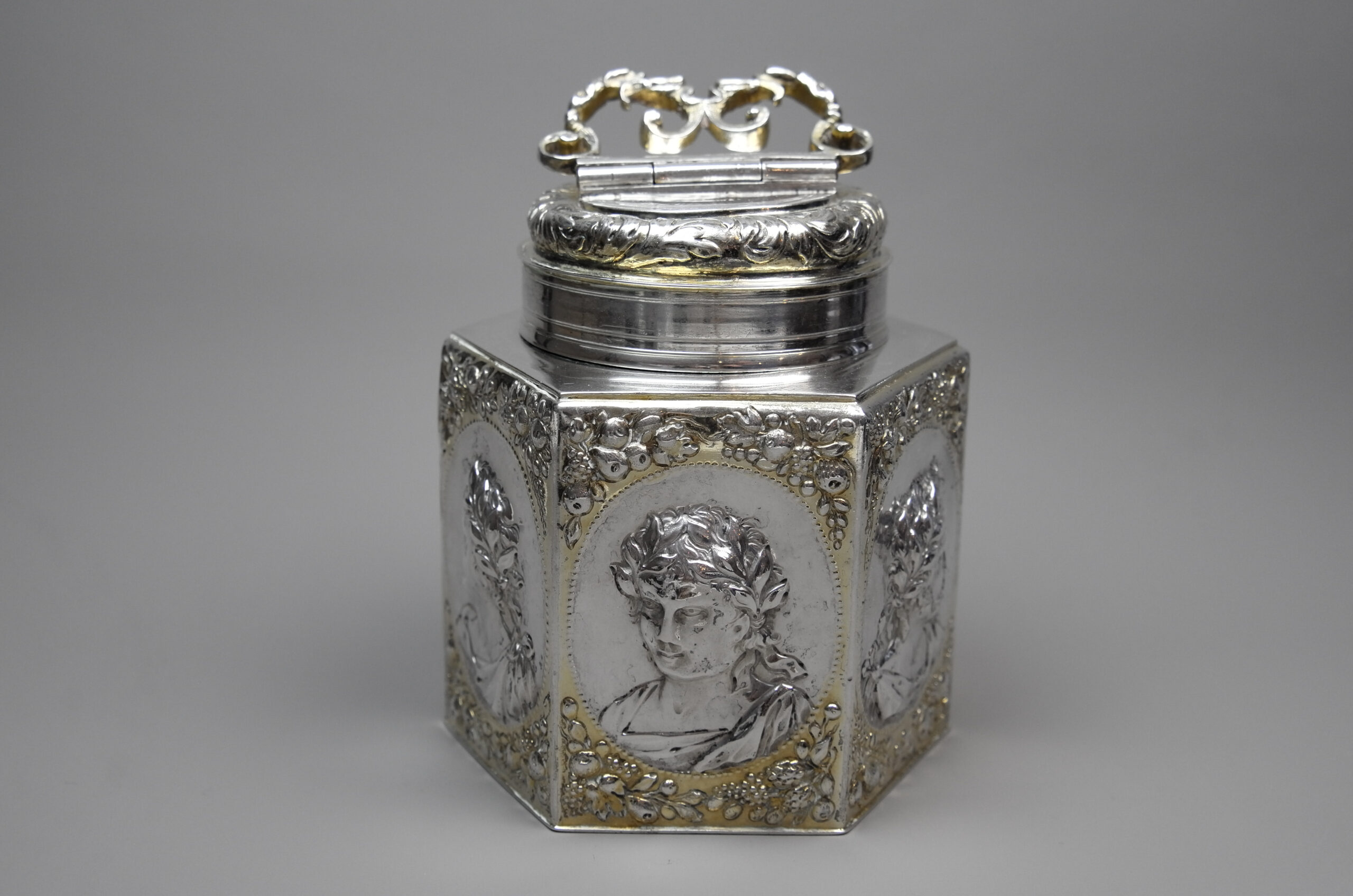 Eine silberne Schraubflasche mit Teil- und Innenvergoldung, sechsseitigem Korpus auf flachem Boden mit getriebenen und ziselierten Imperatorenbüsten in Medaillonreserven. Auf den Zwickelfeldern mit feinem Früchtedekor verziert. Der Schraubdeckel mit einer flachen Oberseite und Akanthusranke entlang der Schulter sowie mit einem scharnierten Bügelgriff aus gegenläufigen S-Schwüngen.