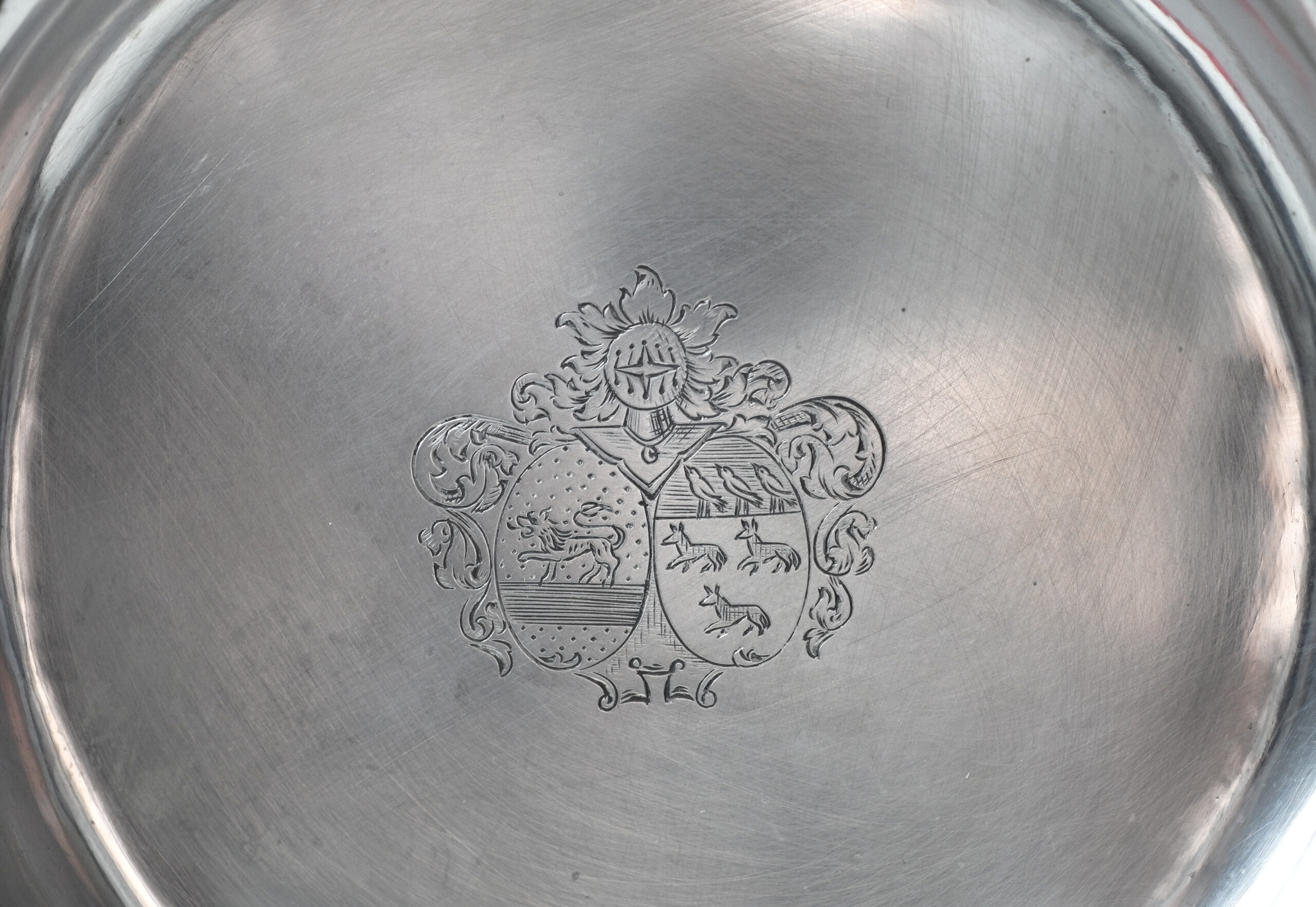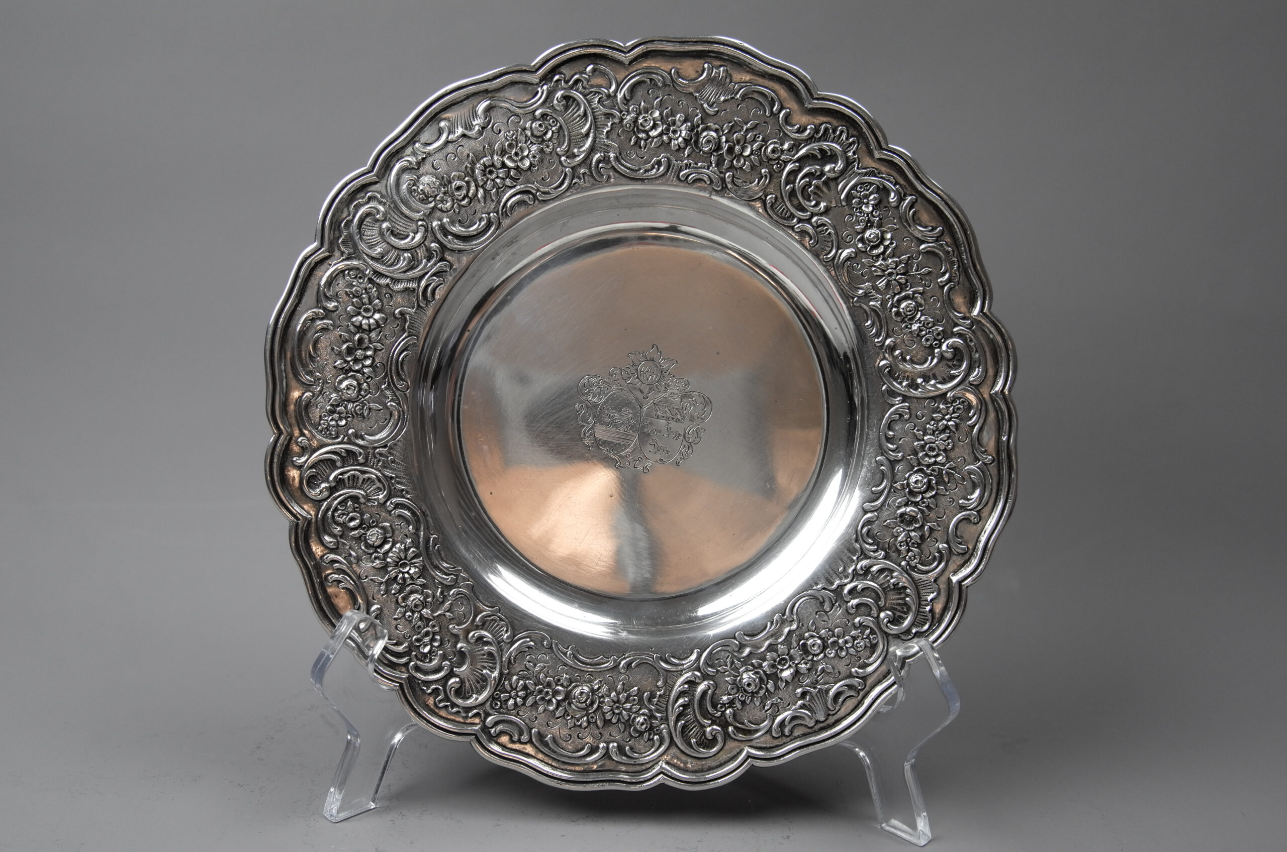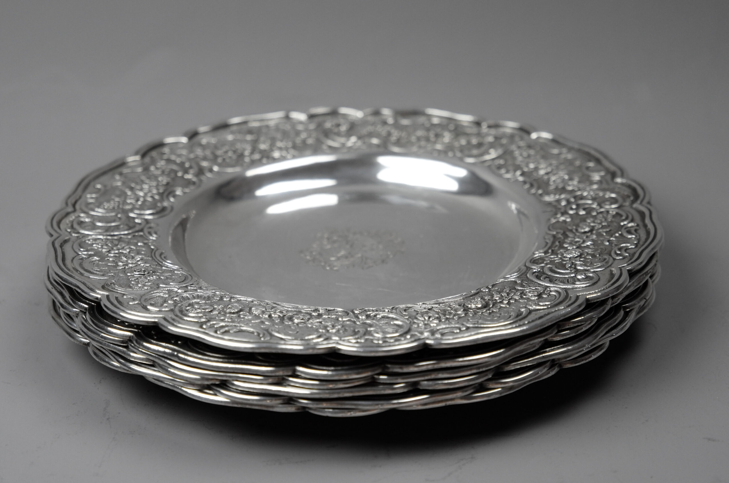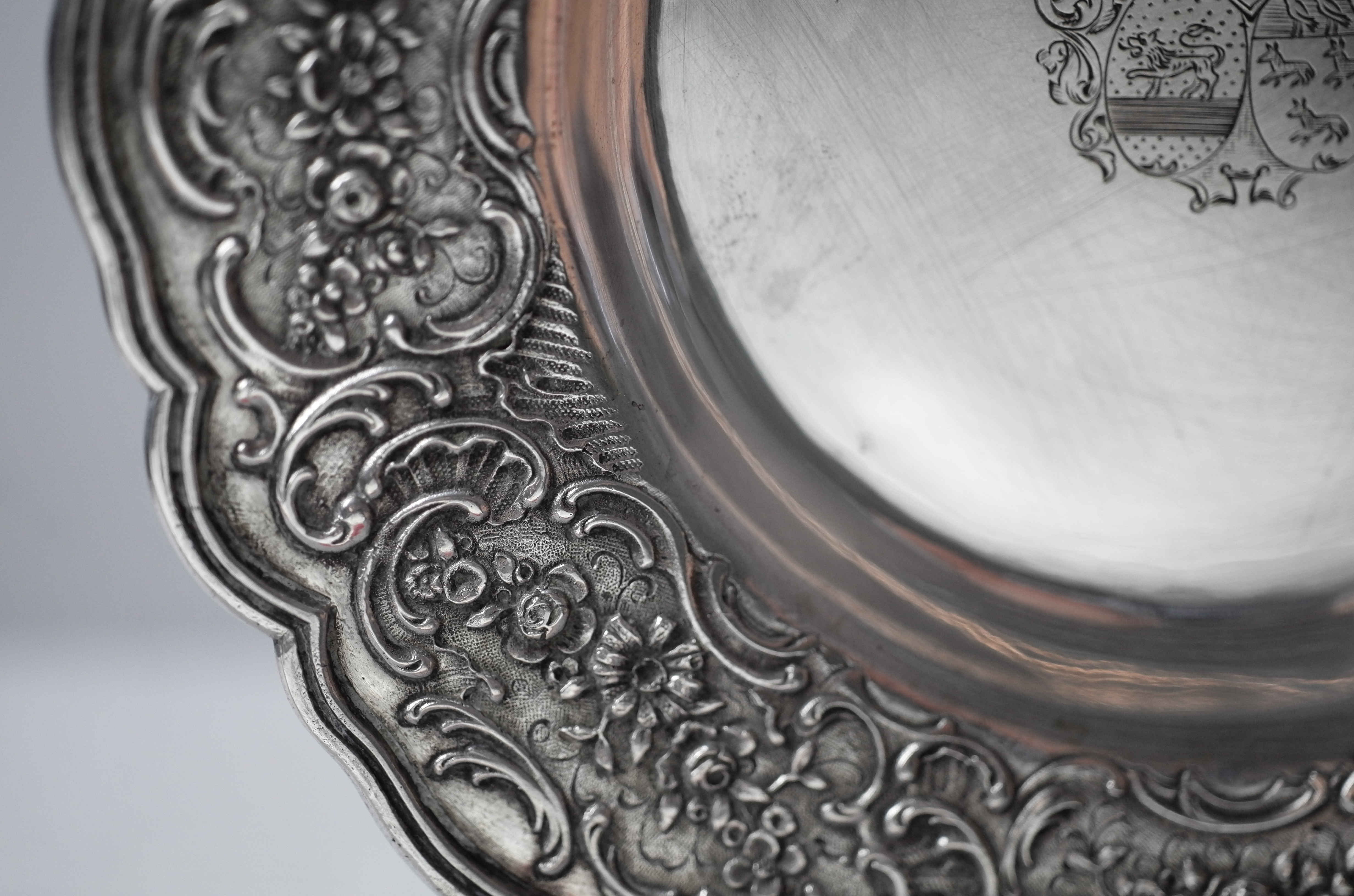 Ein Set bestehend aus sechs Silbertellern in runder Form mit geprägtem Rocaillen- und Blumenmuster am Rand und einer Allianzwappengravur im ansonsten glatten Spiegel.