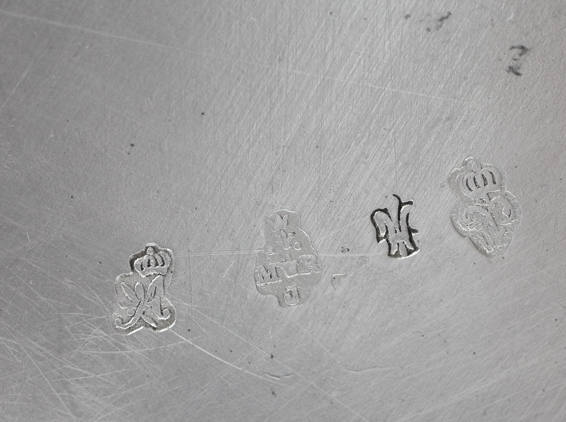 Gepunzt ist mit der Stadtmarke Paris (1762-1768) (Altermann: Jean-Jacques Pévost) und dem Meisterzeichen bekrönte Lilie über Korb mit Initialen MR über J (leider nicht identifizierbar). Weitere nicht identifizierbare Punzen sind eine Lilie sowie eine bekrönte Lilie.