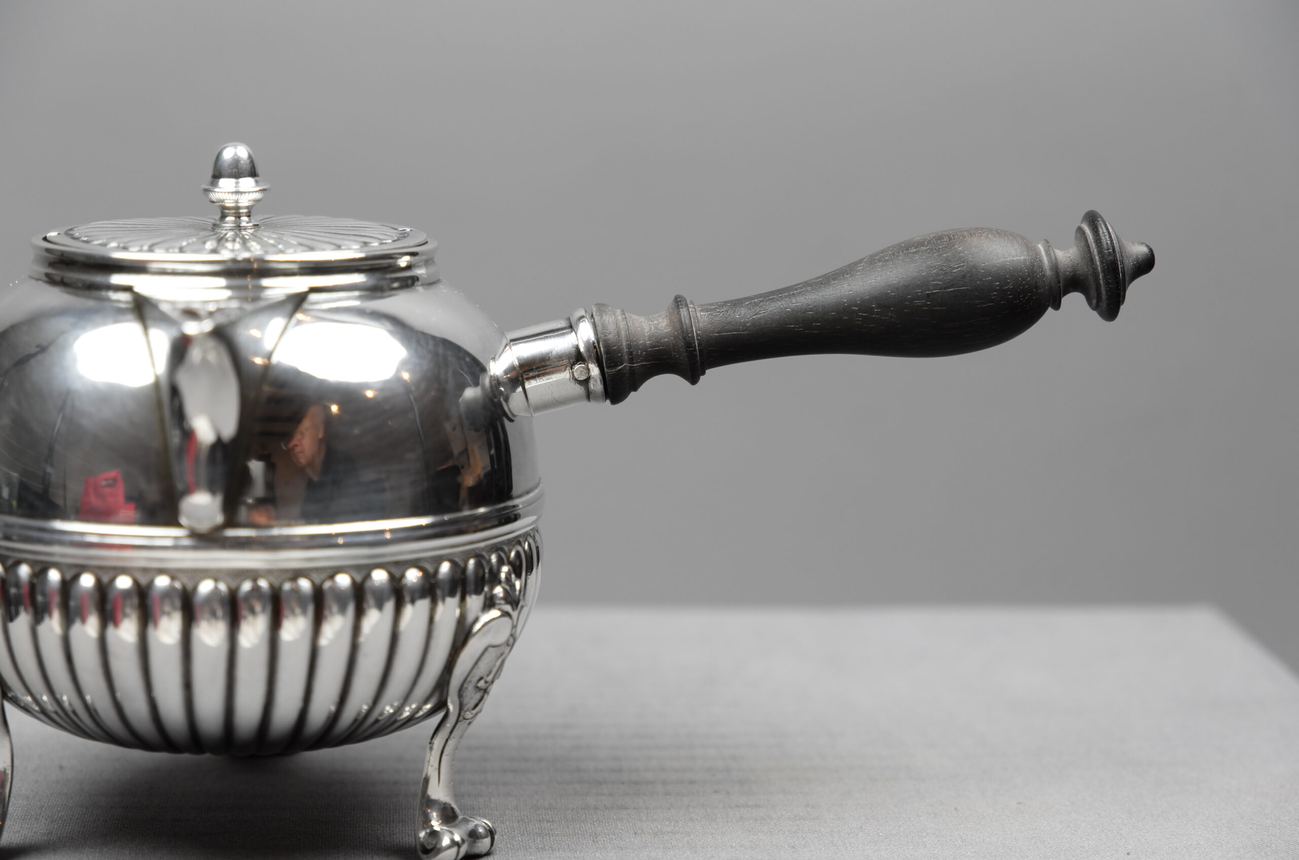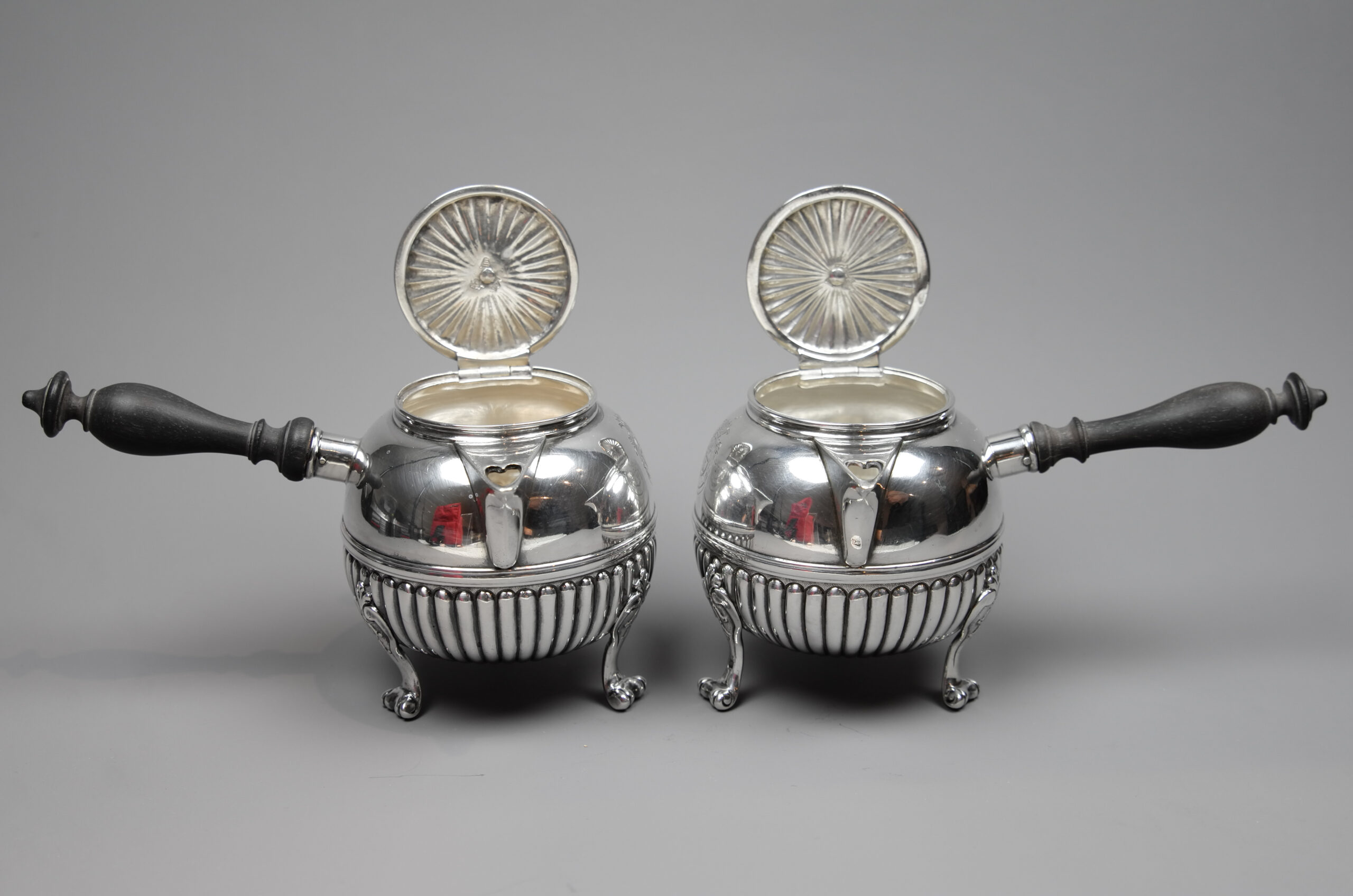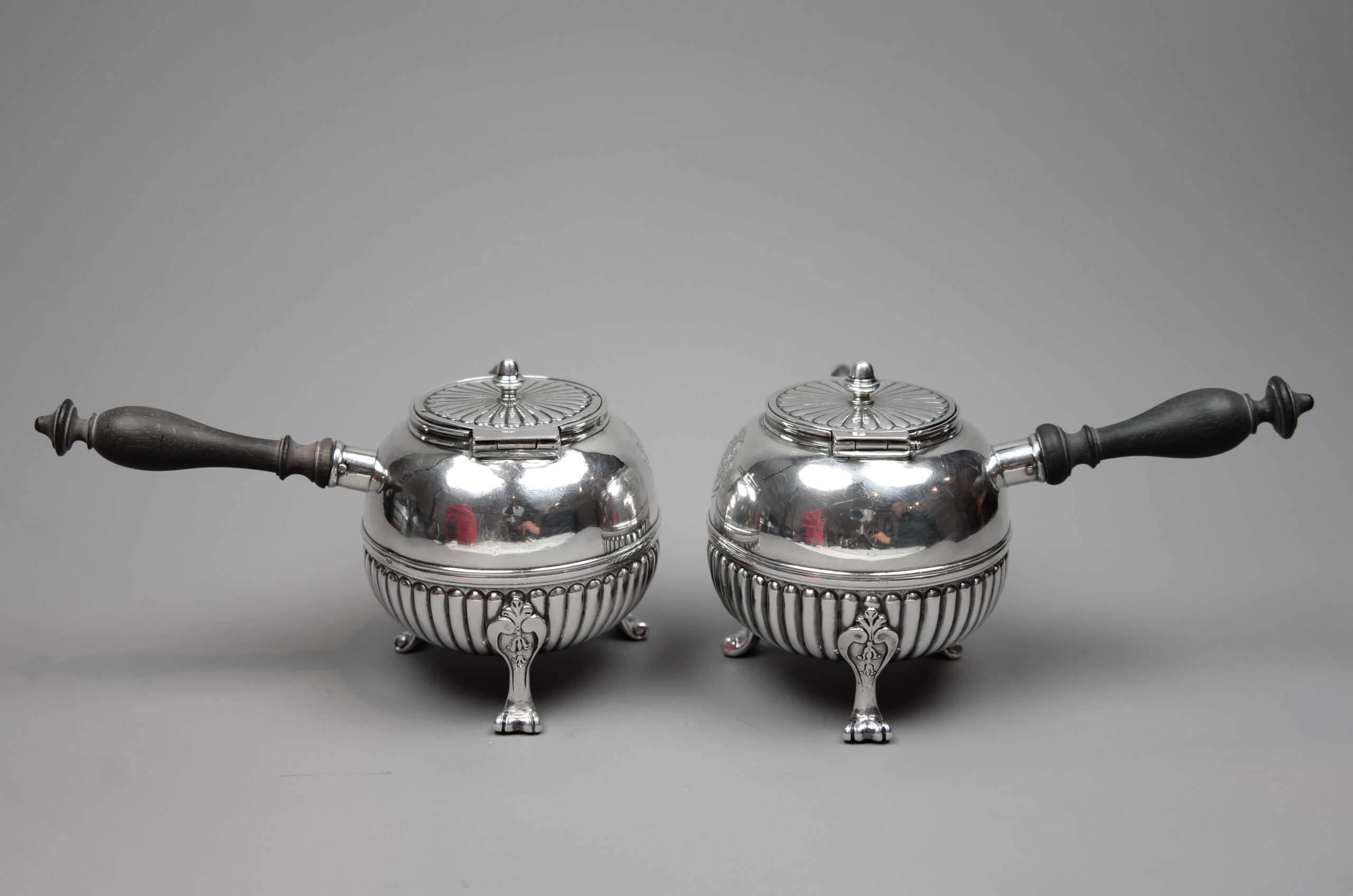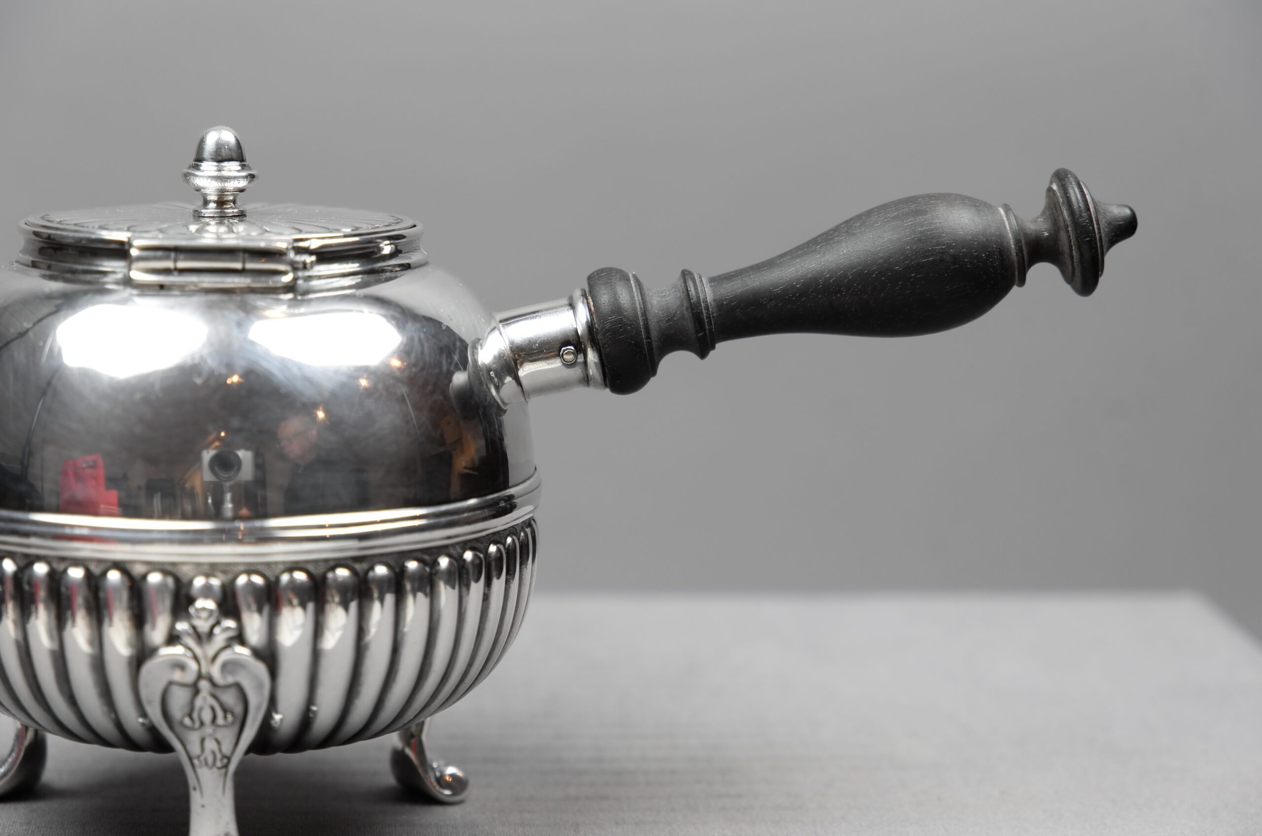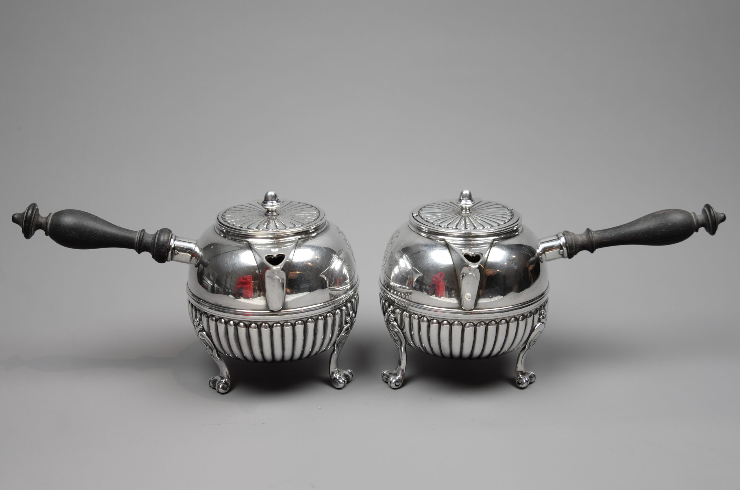 Ein von unterschiedlichen Meistern geschaffenes aber dennoch zusammengehörende Paar Schokoladenkännchen aus der Mitte des 18. Jahrhundert. Der Korpus ist als Kugel geformt, teilweise godroniert und steht auf drei Füßen. Am Korpus montiert ist ein Klappdeckel sowie seitliche, ebonisierte, gerade Handhaben. Die Öffnung des Ausgusses ist in Herzform gestaltet, eine Wappengravur befindet sich auf beiden Kännchen, die innen unbenutzt sind.