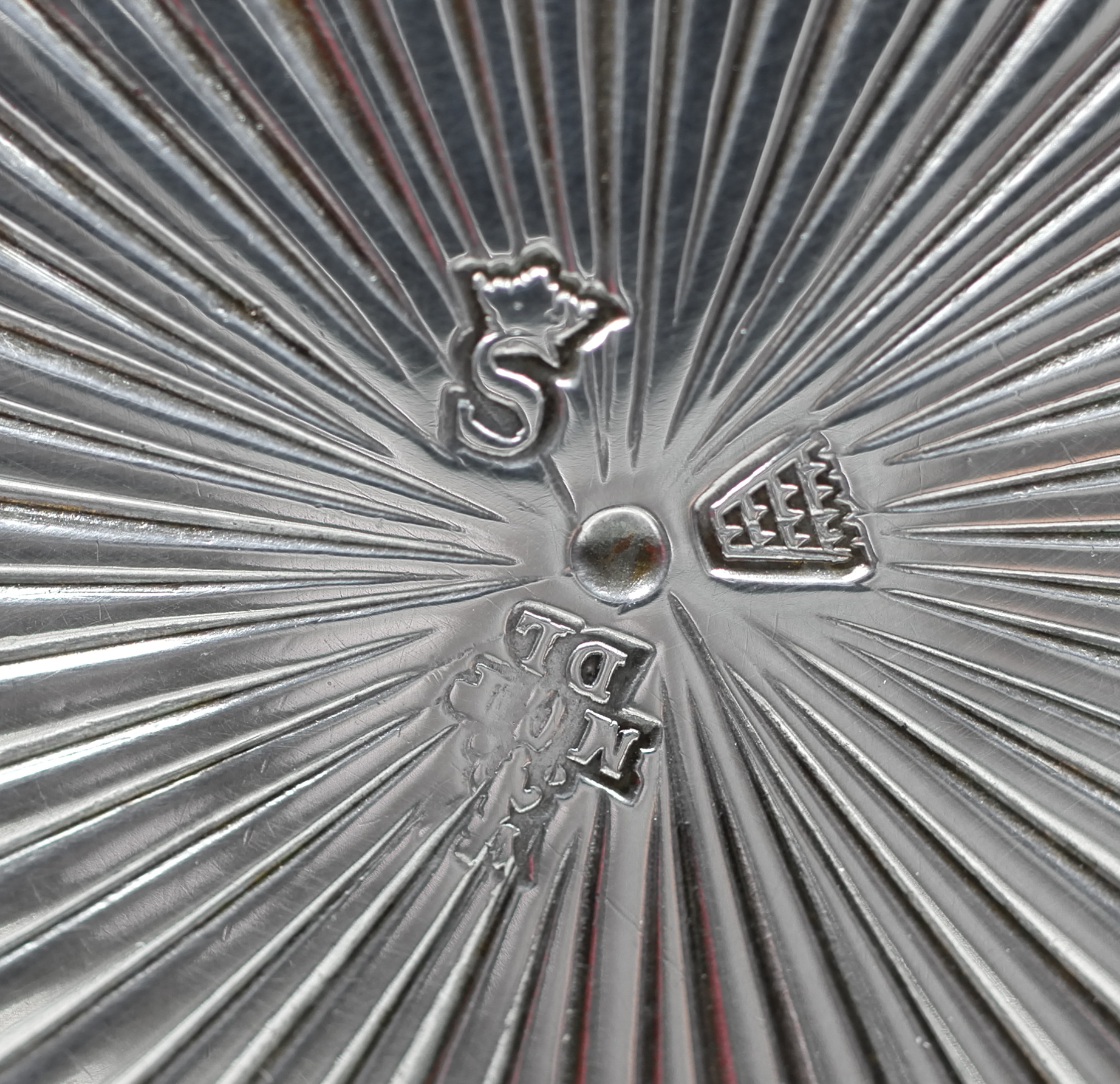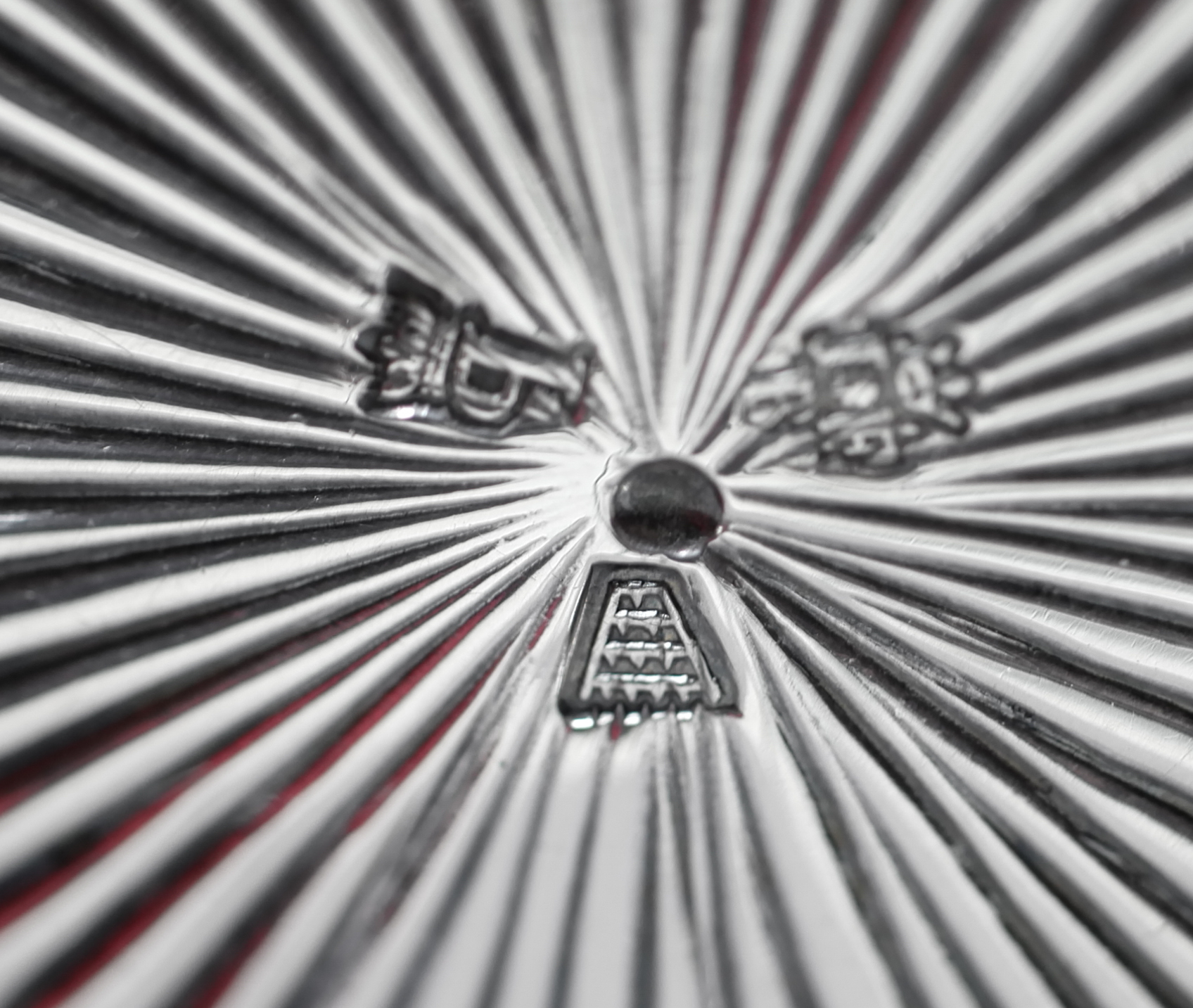 Gepunzt sind die Kännchen mit den Initialen der Meister IF B und MP L für Jacques François Bouchot bzw. Michel-Pierre de Lapierre sowie den Jahresbuchstaben und Steuermarken.