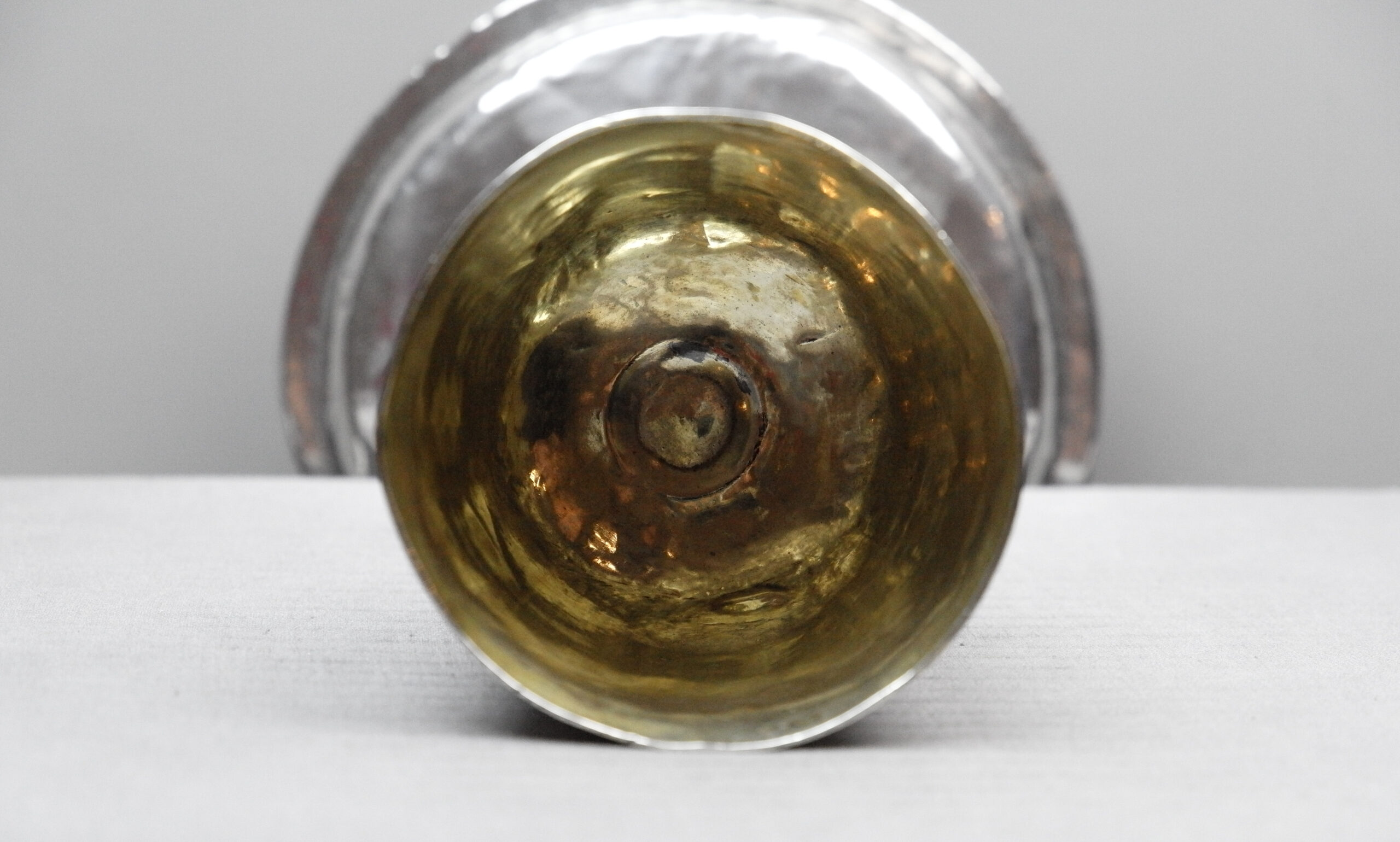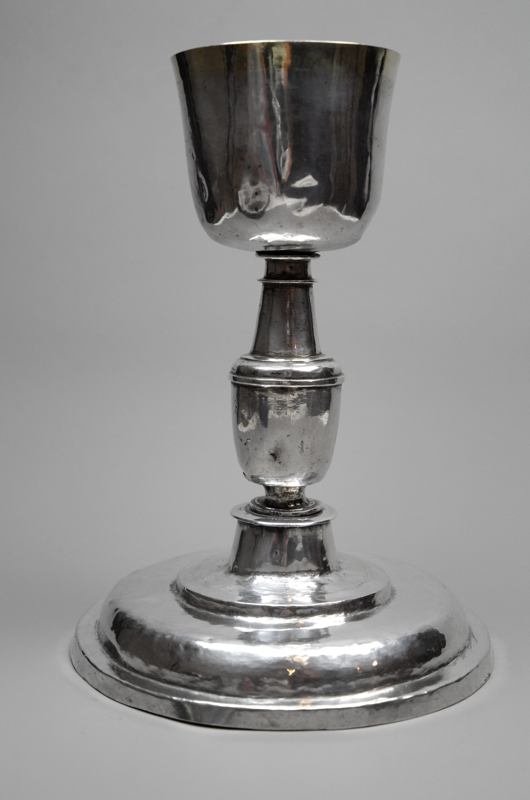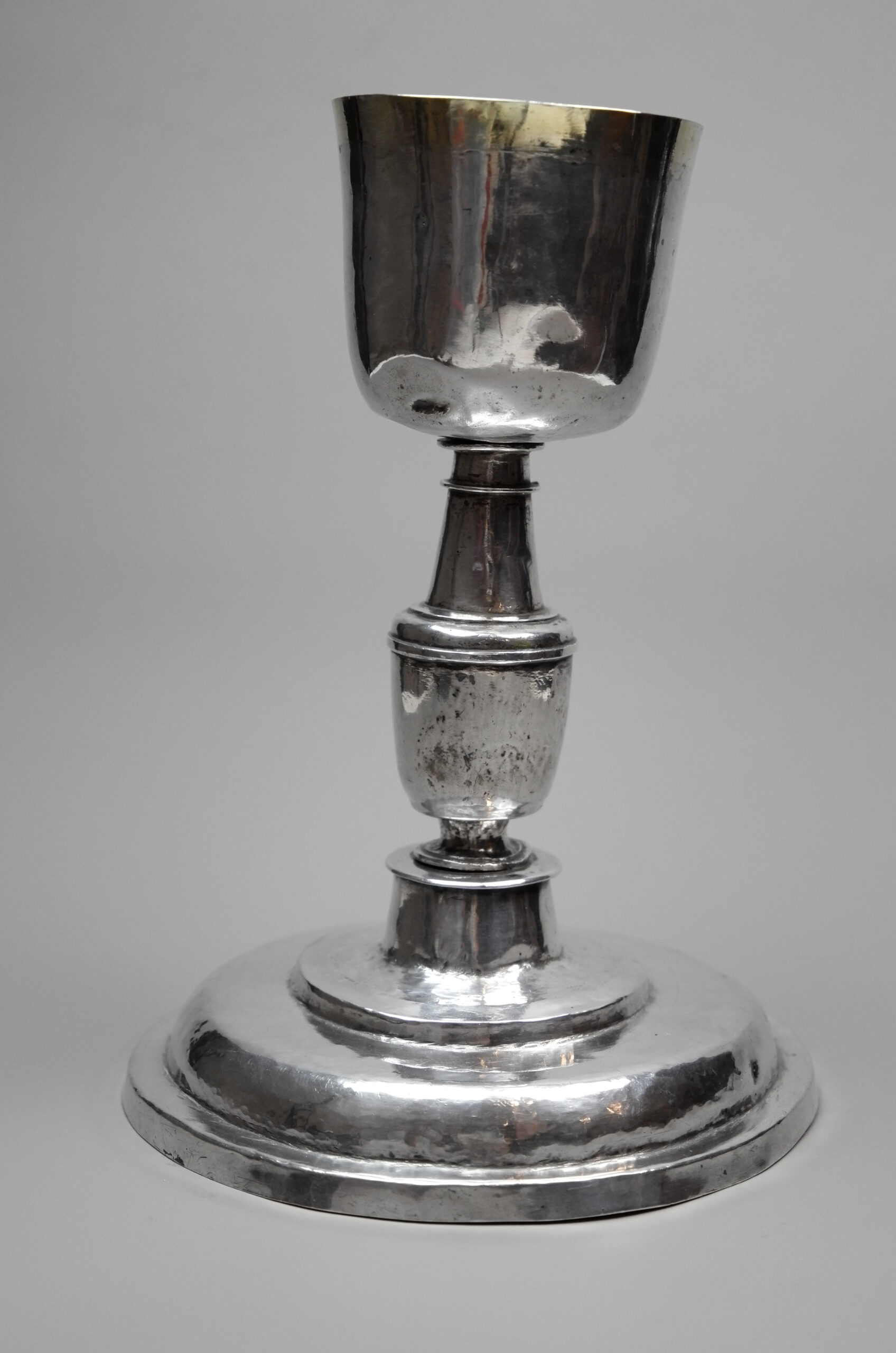 Ein sehr schlicht gehaltener Messkelch mit einem runden, getreppten Standfuß, glatten Oberflächen und einer teilvergoldeten Kuppa.