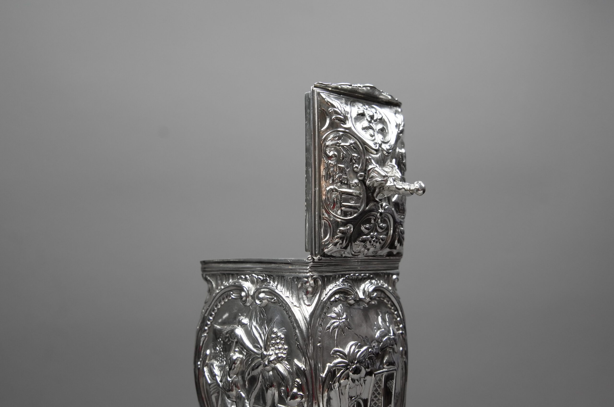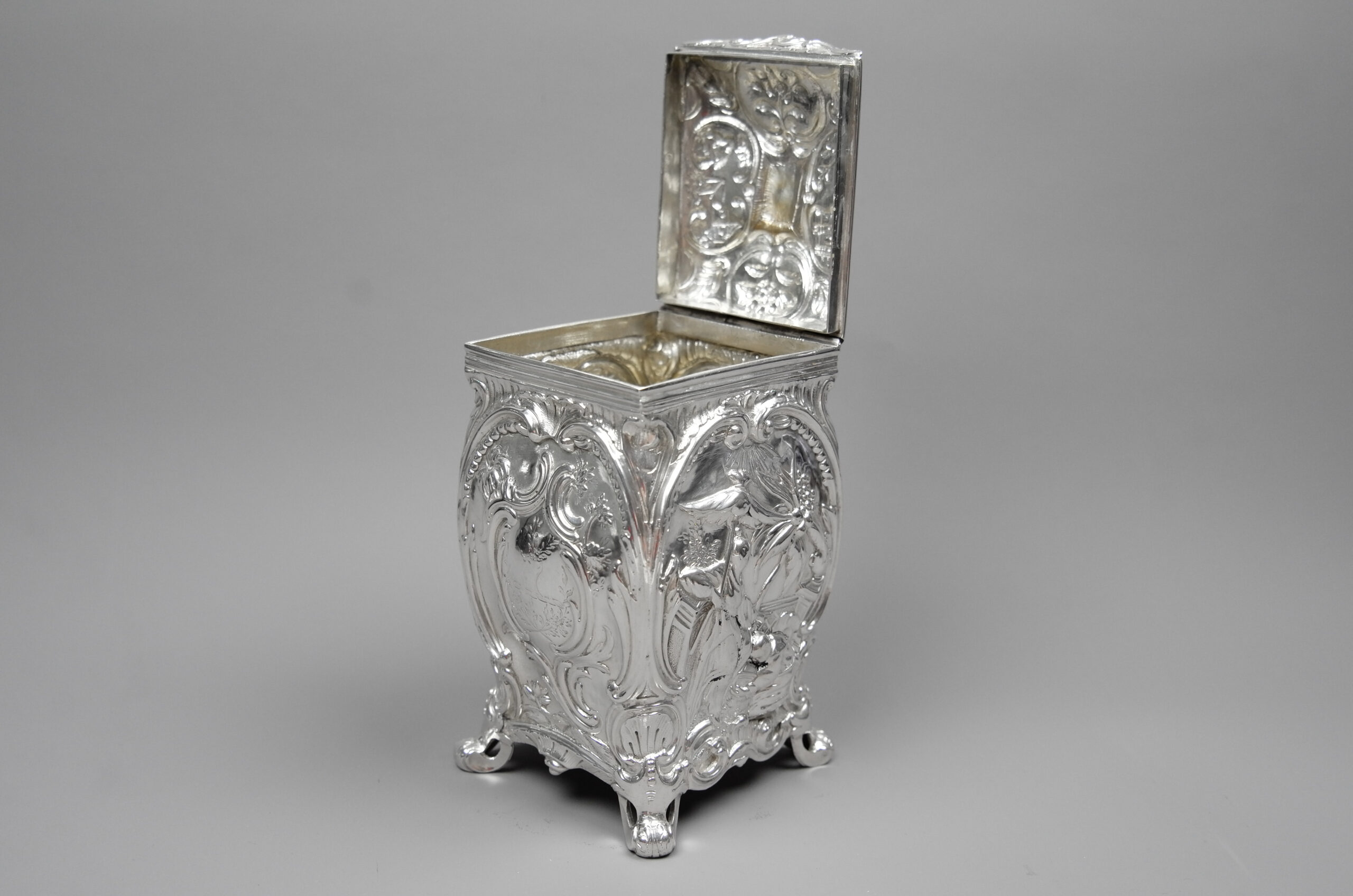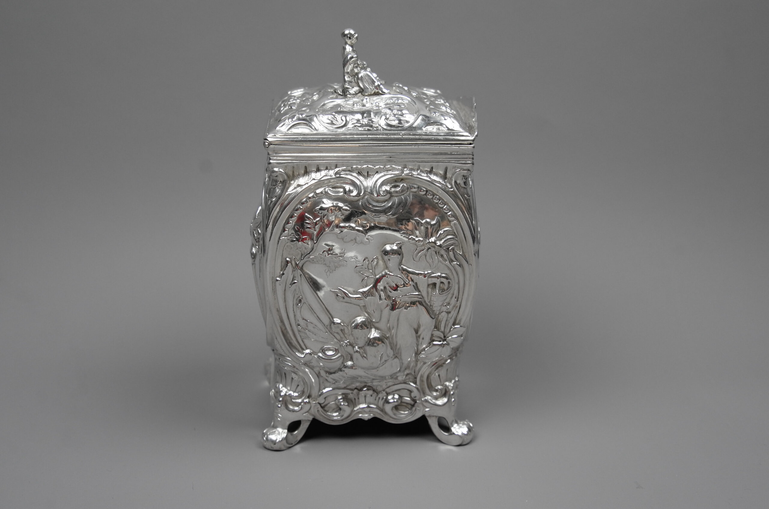 Gepunzt ist die Teedose mit dem linksschreitenden Löwen für Sterlingsilber, mit dem gekrönten Leopardenkopf für London, mit dem Jahresbuchstaben L für das Jahr 1766 sowie mit der Meistermarke ER für Emick Romer, der aus einer Osloer Goldschmiede Familie stammte, um 1750 nach London, 123 High Holborn, zog und in dieser Zeit mit Parker & Wakeling kooperierte. Romer ist bekannt für eine hohe Qualität und seine außergewöhnlichen Stücke. Exponate von ihm finden sich u.a. im Clark Art Institute, Williamstown, MA, im Fitz-William-Museum, Cambridge, im MET-Museum, New York City sowie im Victoria & Albert Museum, London.