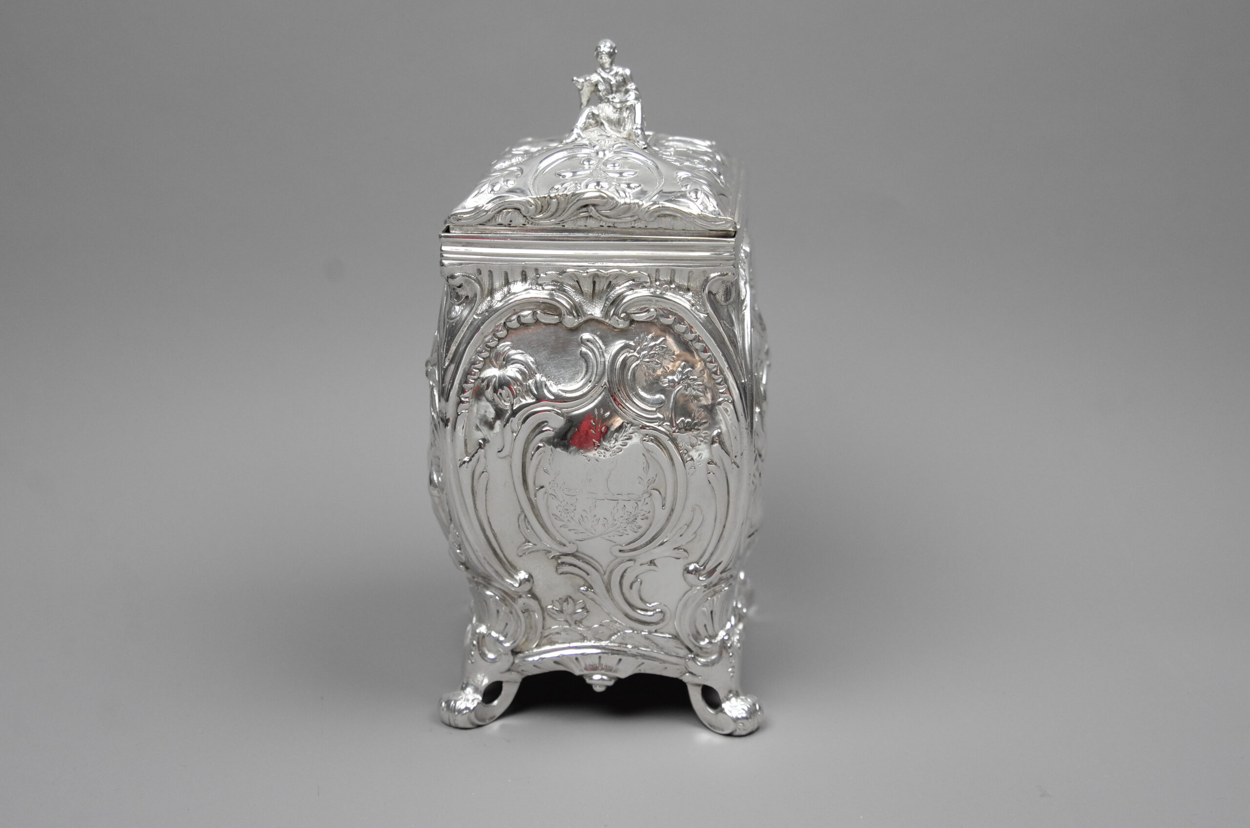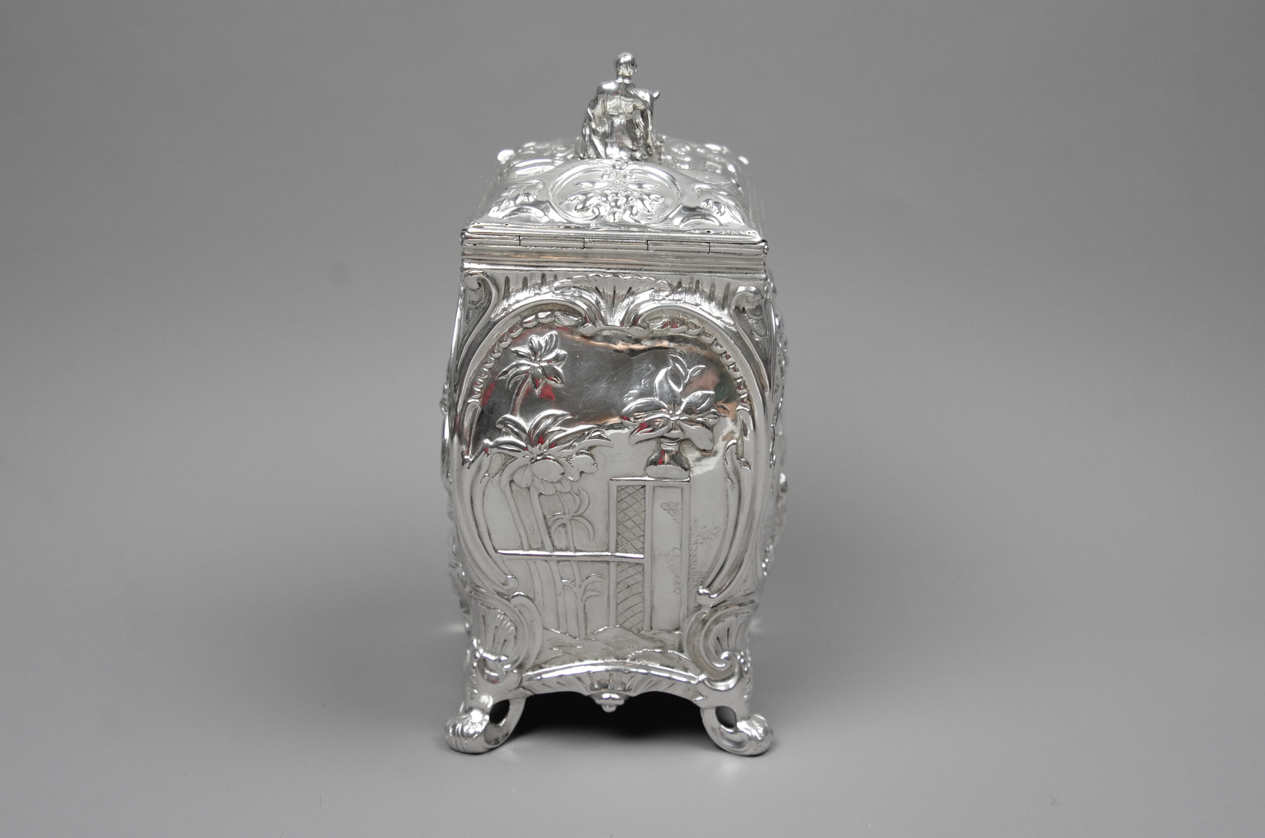 Der Teekanister stammt aus der frühen George III-Periode, die dem kontinental-europäischen Rokoko entspricht. Der rechteckige Korpus dieser Teedose ist geschwungen, steht auf vier Volutenfüßen und ist ganz im Chinoiserie-Stil gehalten. Der Deckel ist leicht gewölbt, mit Blütenmotiven verziert und mit einer Daumenrast ausgestattet. Als Deckelknauf dominiert eine sitzende chinesische Figur. An drei Seiten ist der Korpus mit fein gearbeiteten chinesischen Szenen versehen, die Front Seite dagegen beinhaltet ein Medaillon mit einem Familienwappen (Hirsch Geweih). Die damalige Teeherkunft prägte in Anlehnung an China die Gestaltung. Dennoch sind insbesondere die geschwungenen Teedosen im Chinoiserie-Stil aus dieser Zeit selten.