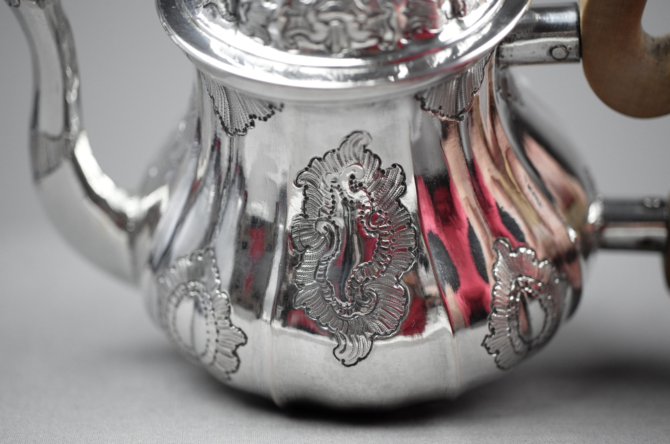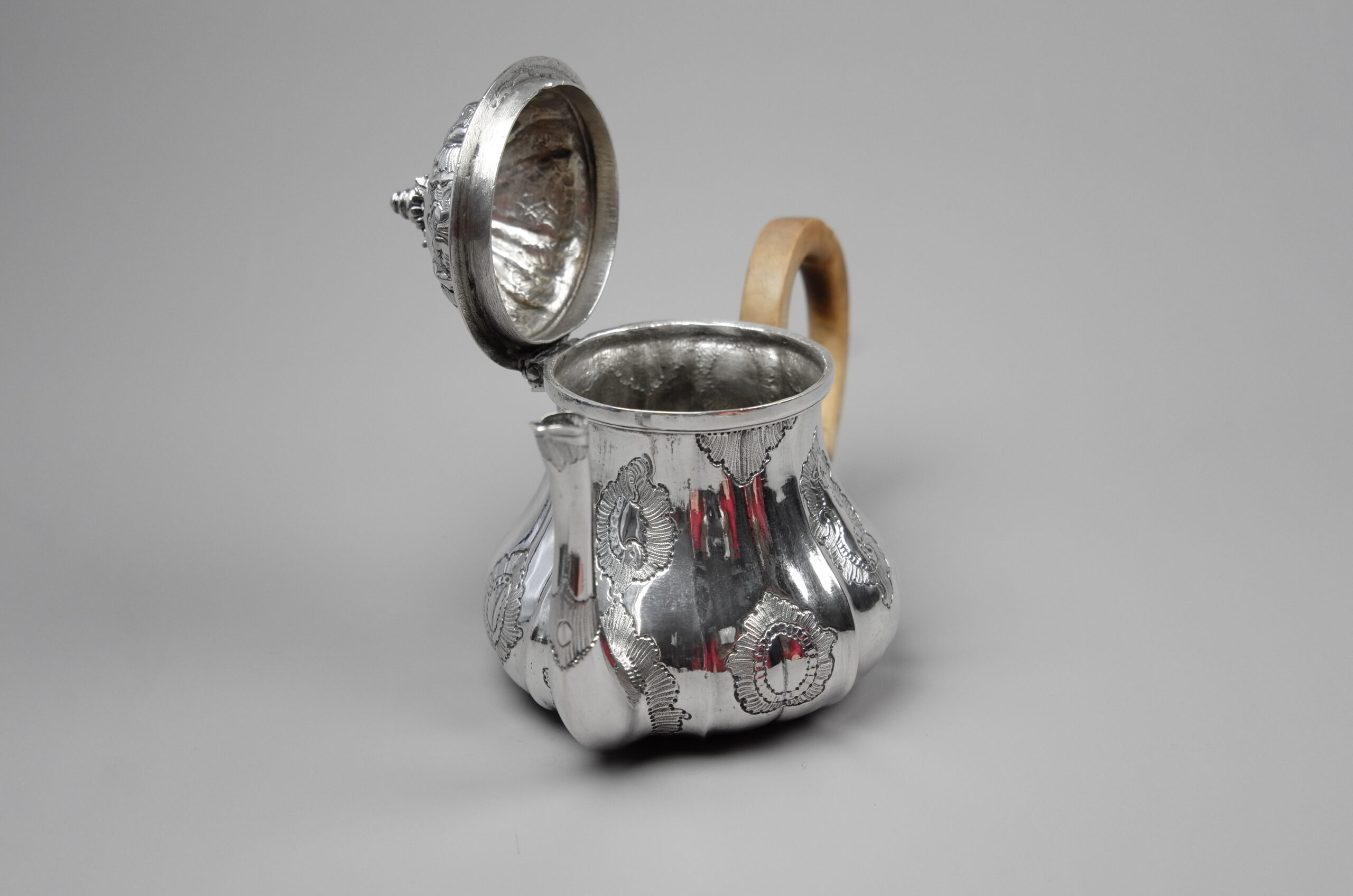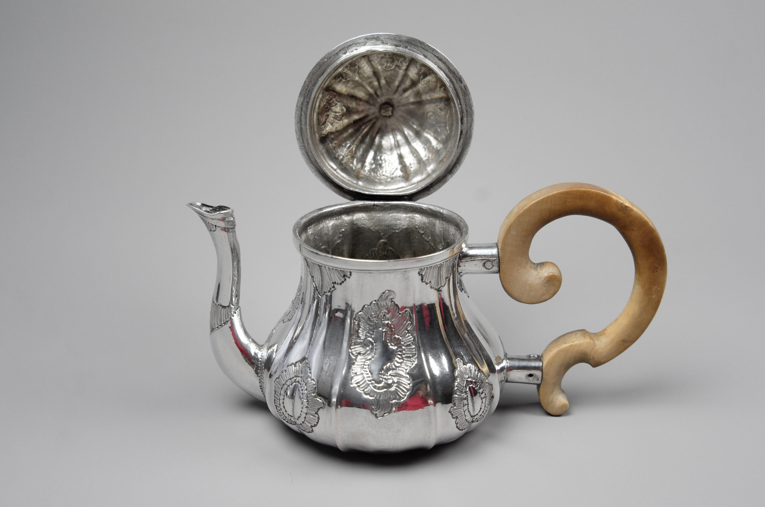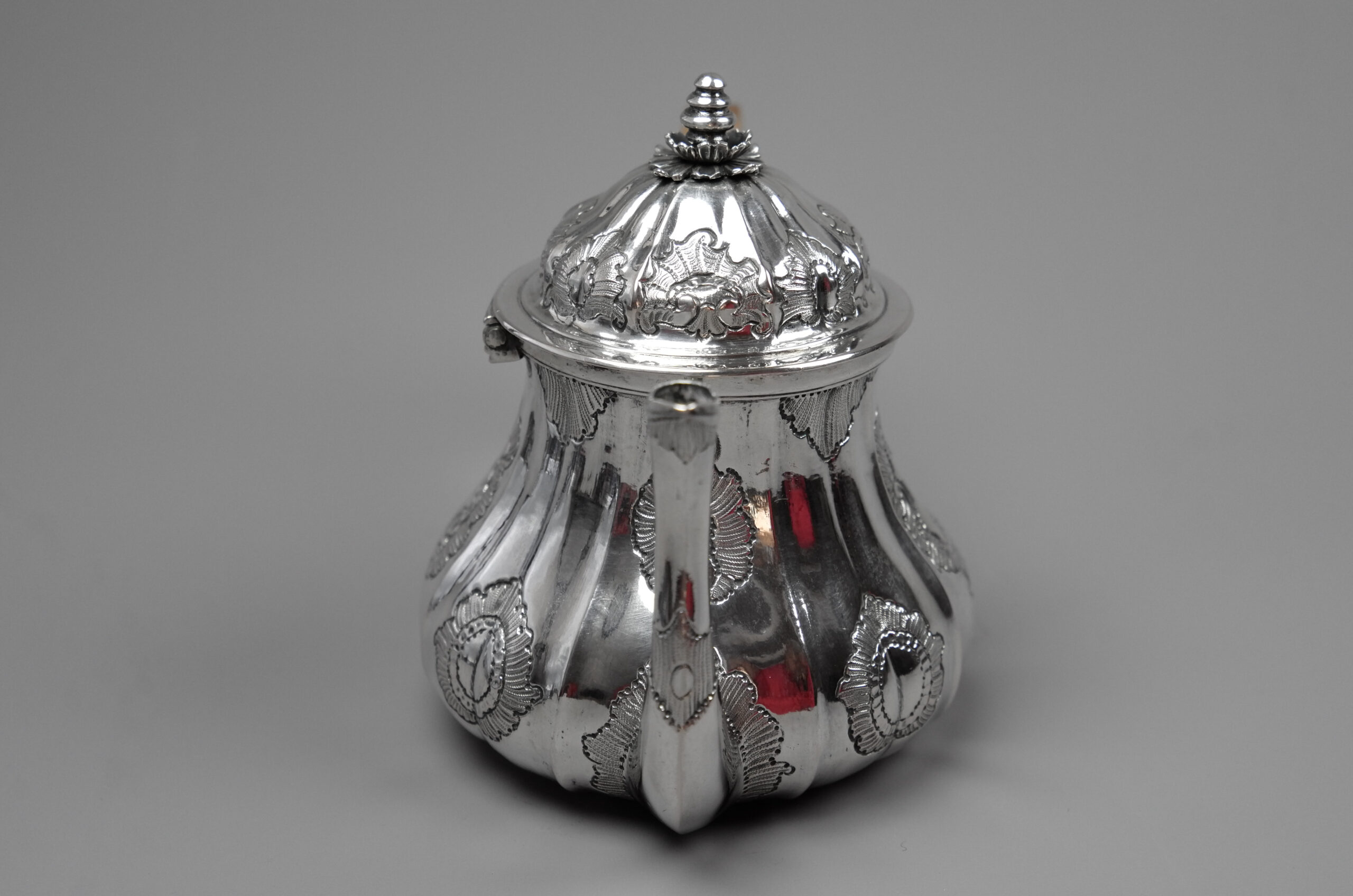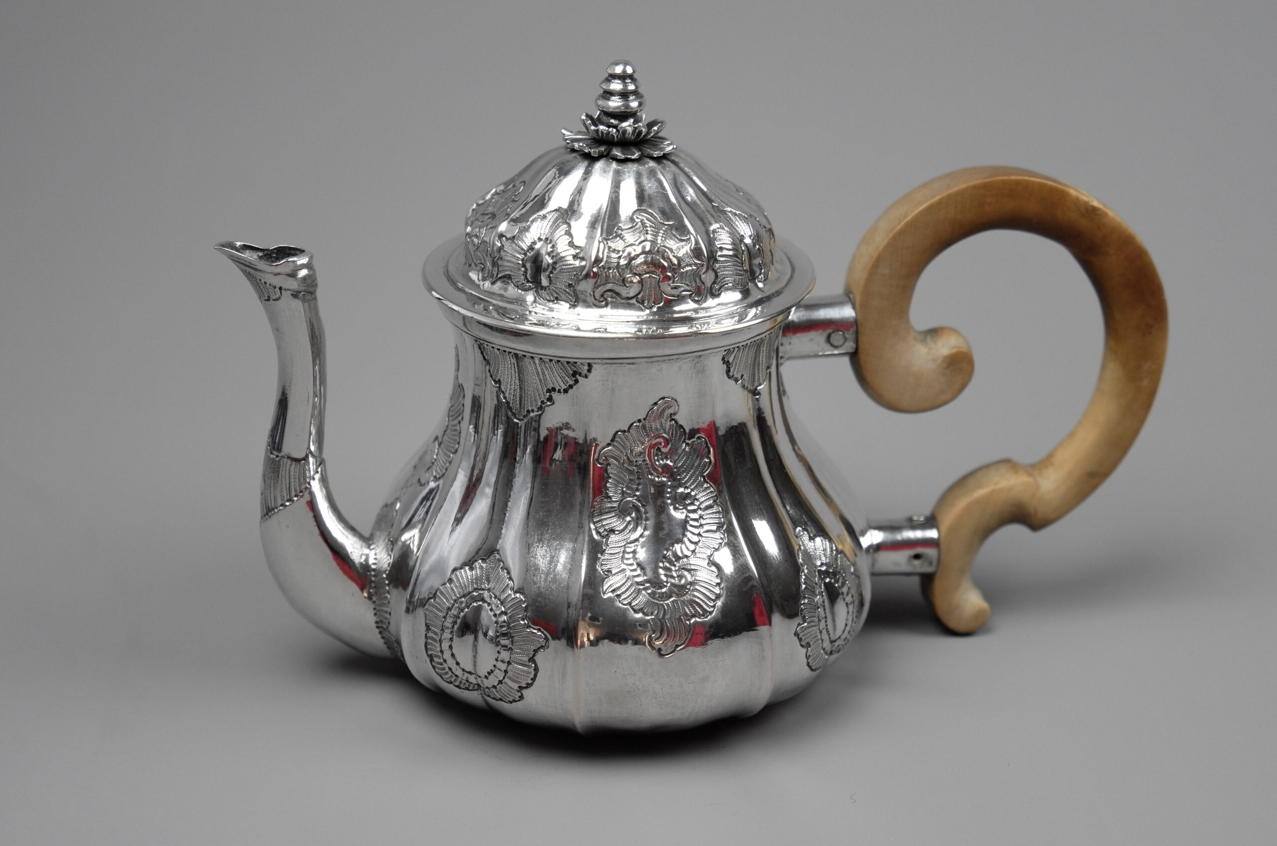Ein sehr handliches Teekännchen in Birnenform mit godroniertem und mit Akanthusmustern verziertem Korpus. Montiert sind eine Holzhandhabe und ein Klappdeckel.