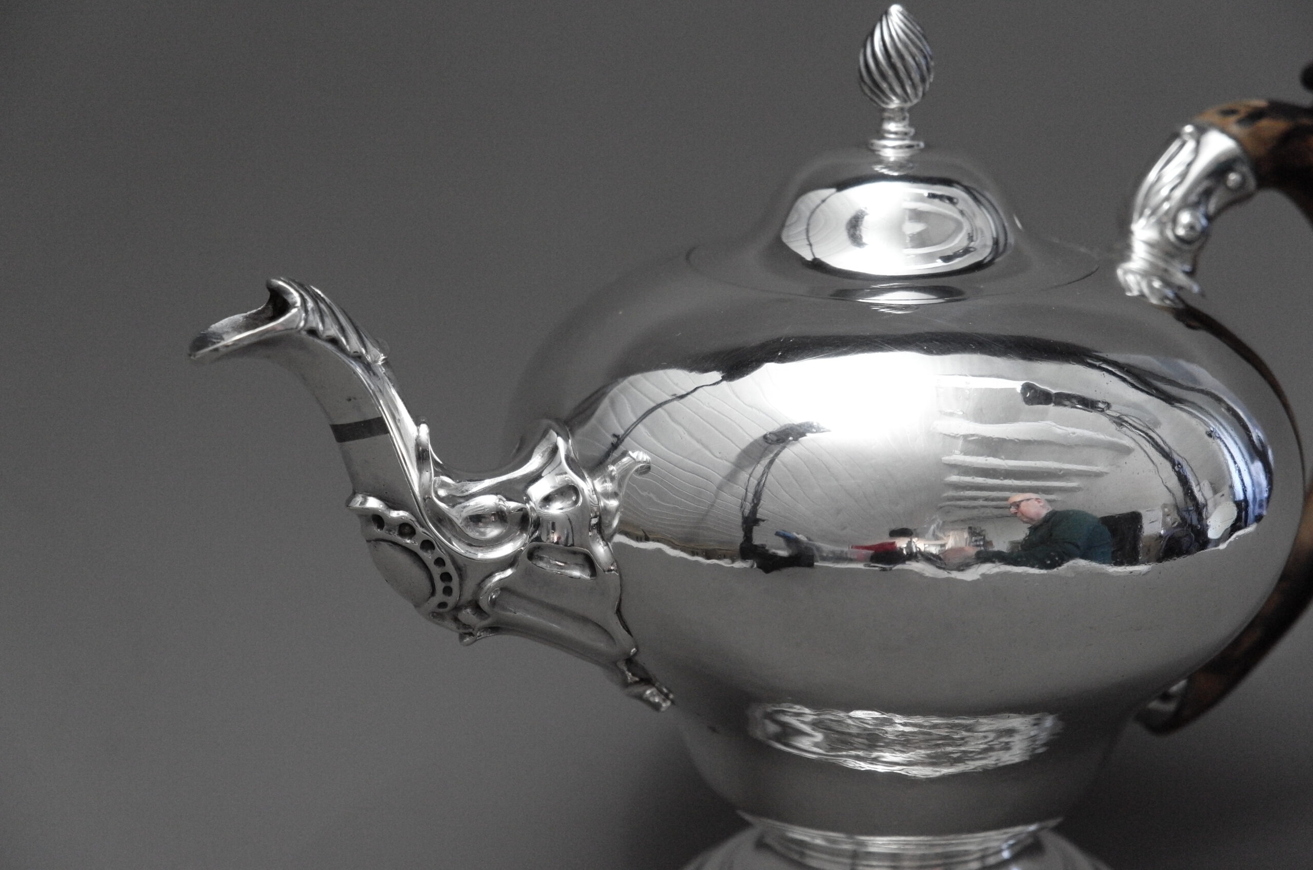 Eine glatte Teekanne in Melonenform auf rundem, getrepptem und hohem Standfuß. Die Handhabe ist aus ebonisiertem Holz, der Klappdeckel ist mit Silberknauf ausgestattet.