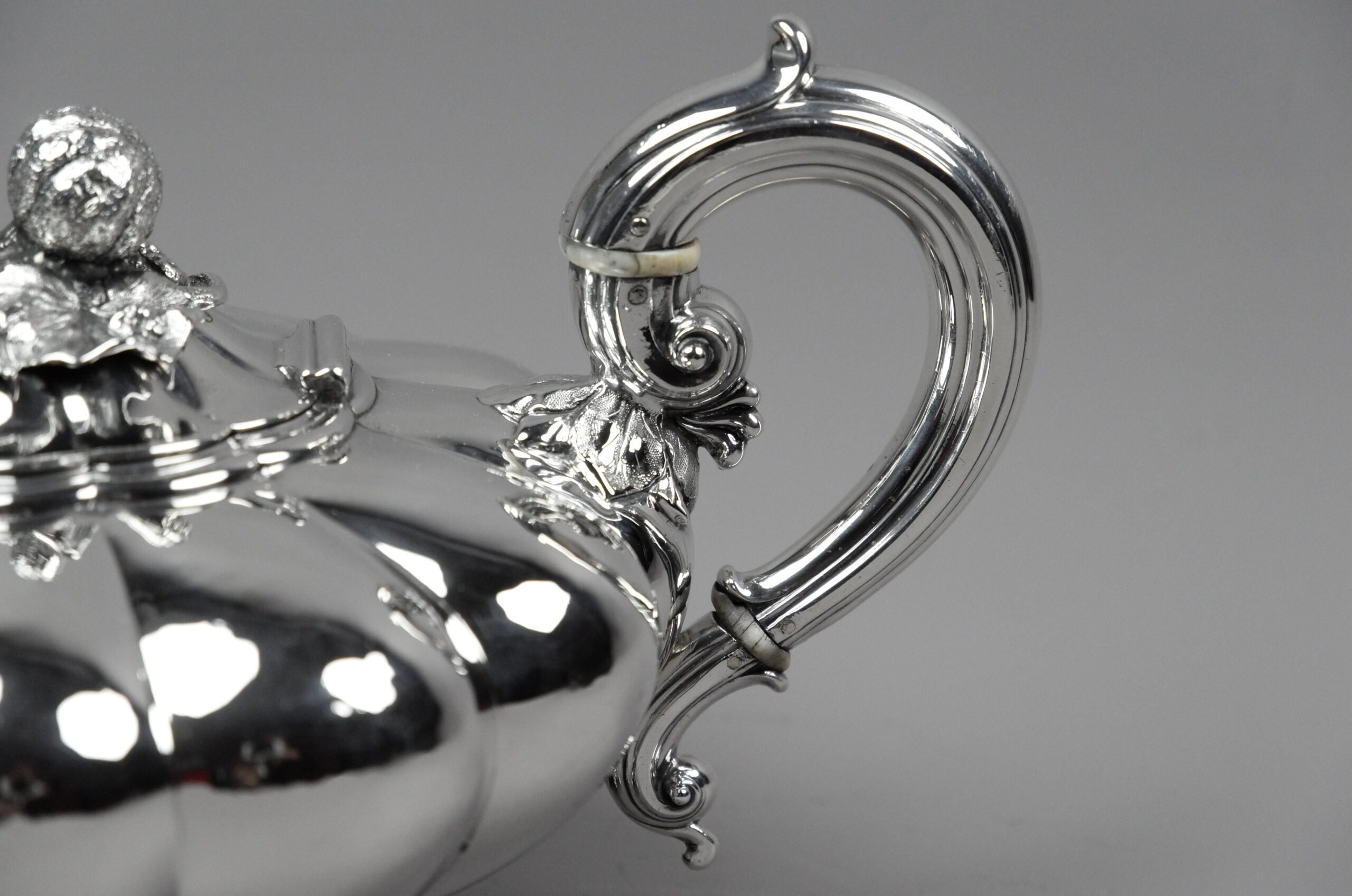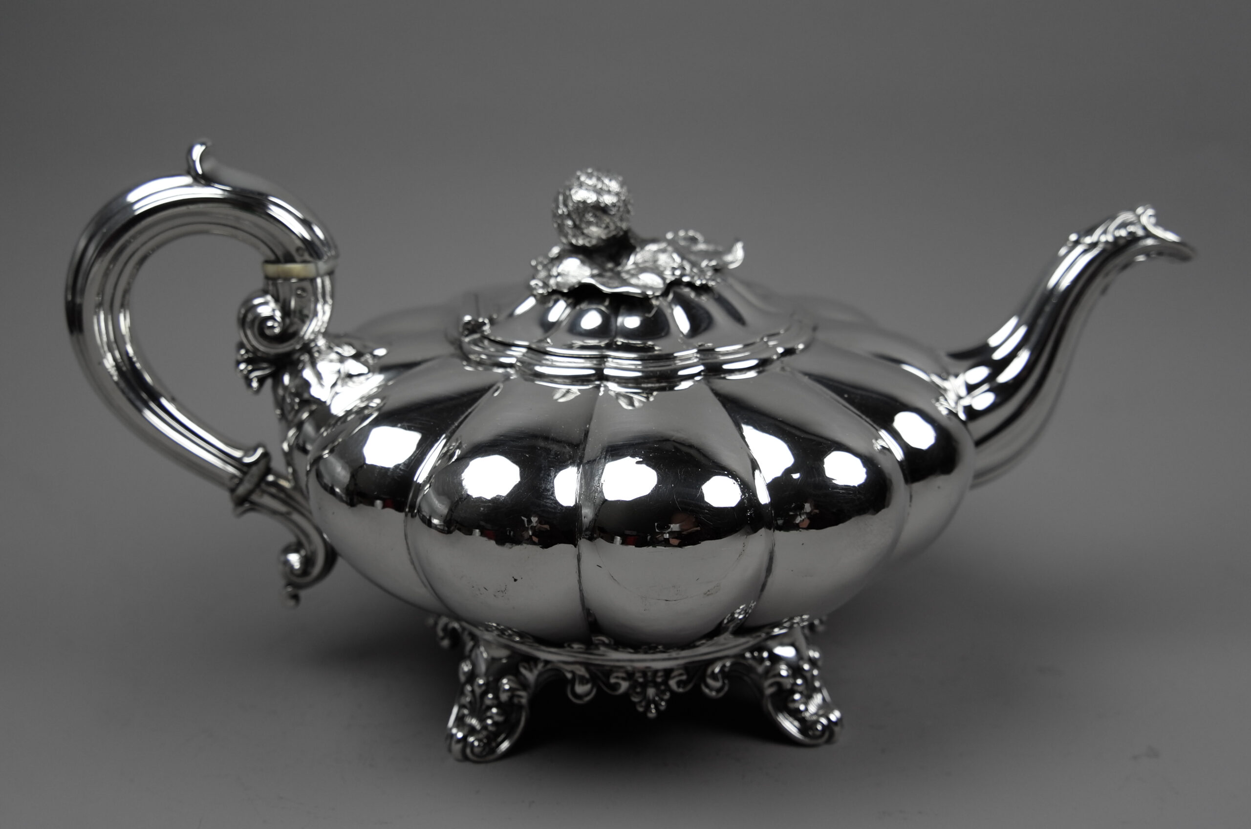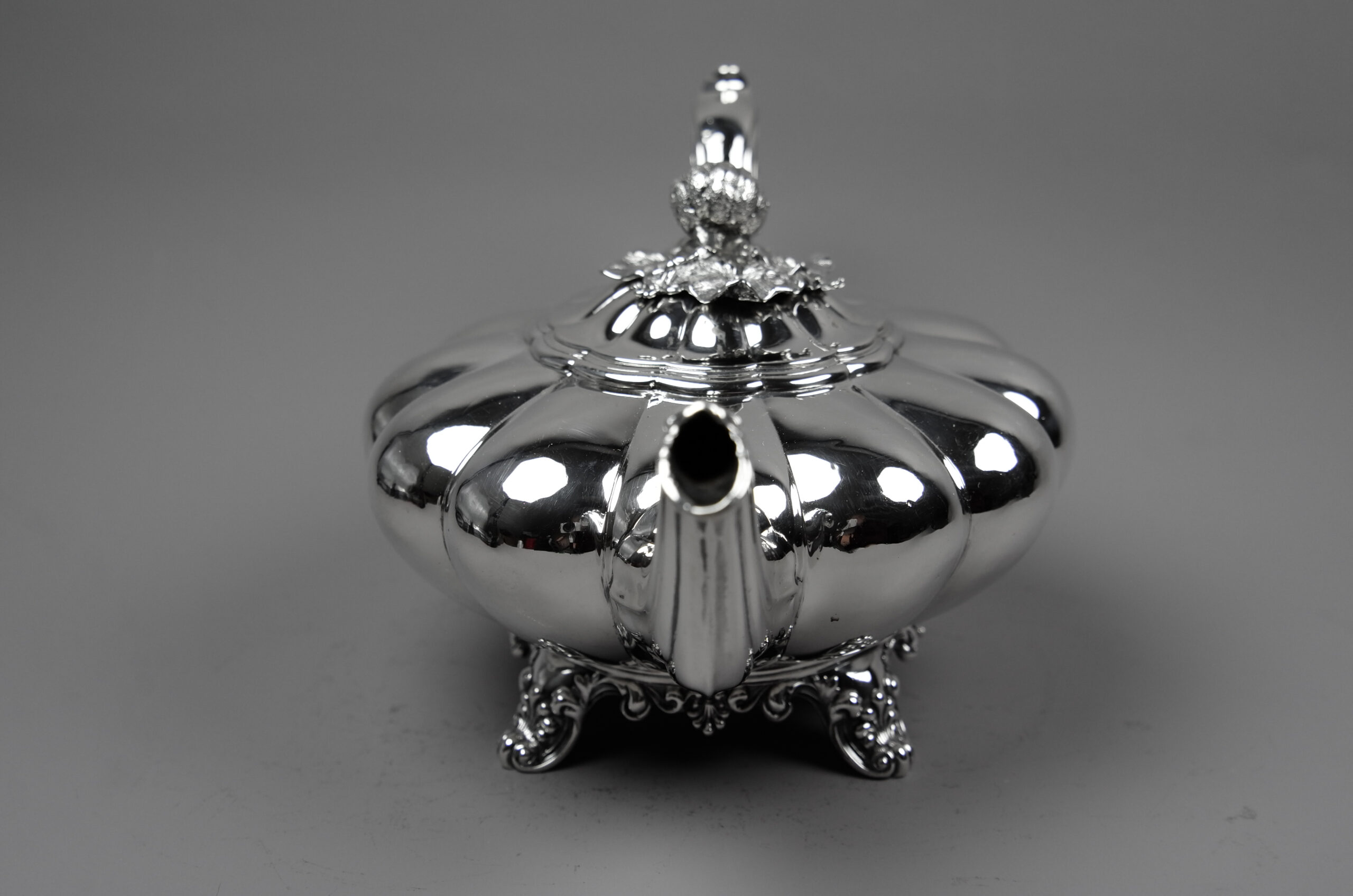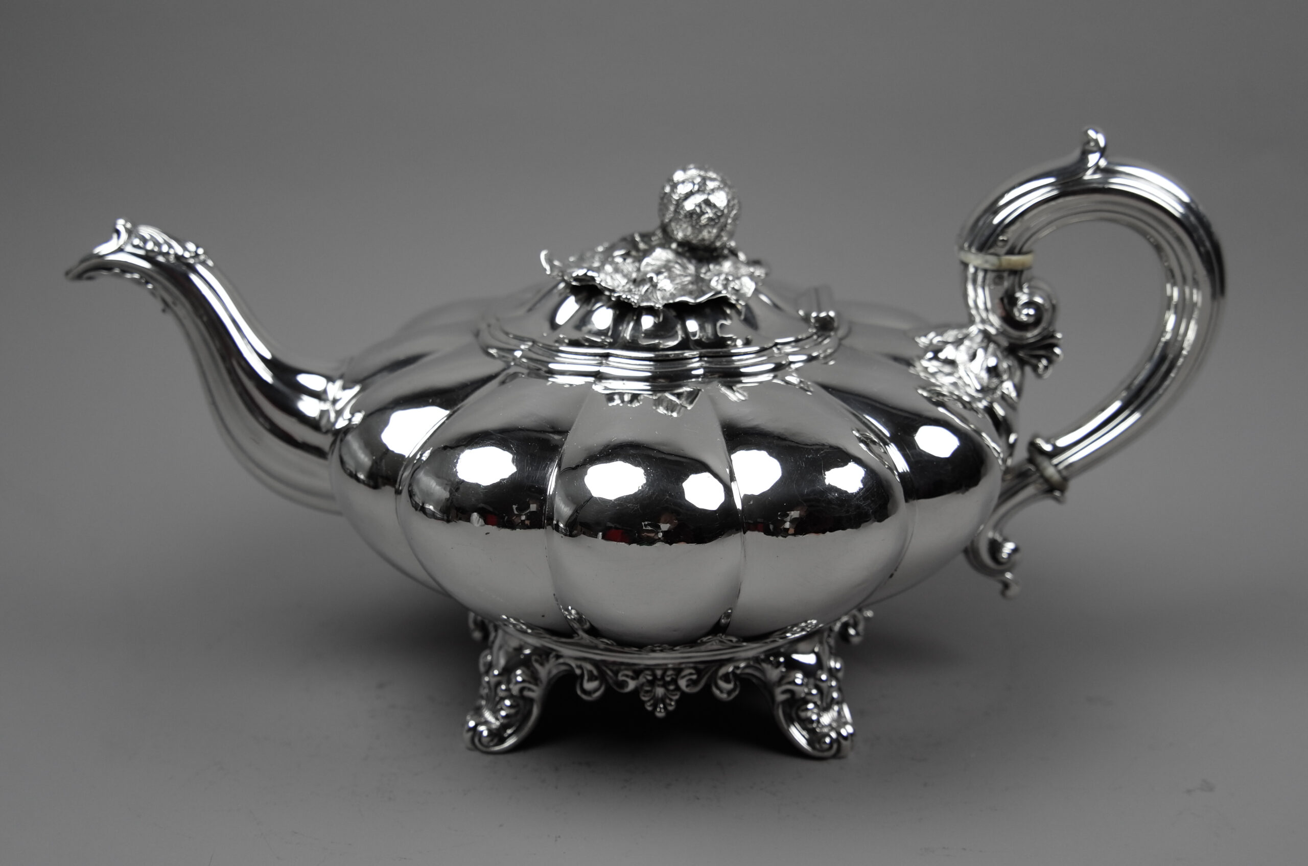 Diese Teekanne besticht durch die Form und weniger durch die dekorativen Elemente. Die runde segmentierte Melonenform steht auf vier Füßen. Der Klappdeckel ist mit mit einer plastischen Blüte als Knauf ausgestattet, an der Silberhandhabe befinden sich Beinisolatoren. Ein sehr schönes Objekt.