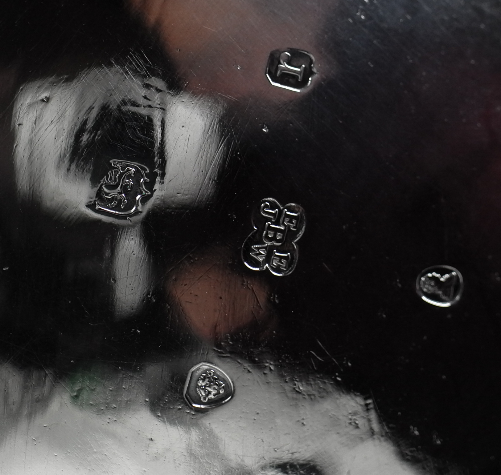 Gepunzt ist die Kanne mit EE über JWB für die Werstatt von Edward Edward jr., John & William Barnard, gepunzt ist darüber hinaus mit dem linksschreitenden Löwen für Sterlingsilber, mit dem ungekrönten Leopardenkopf für London, mit dem Jahresbuchstaben r für 1832 sowie mit der Portrait-/Steuermarke für die Epoche William IV.