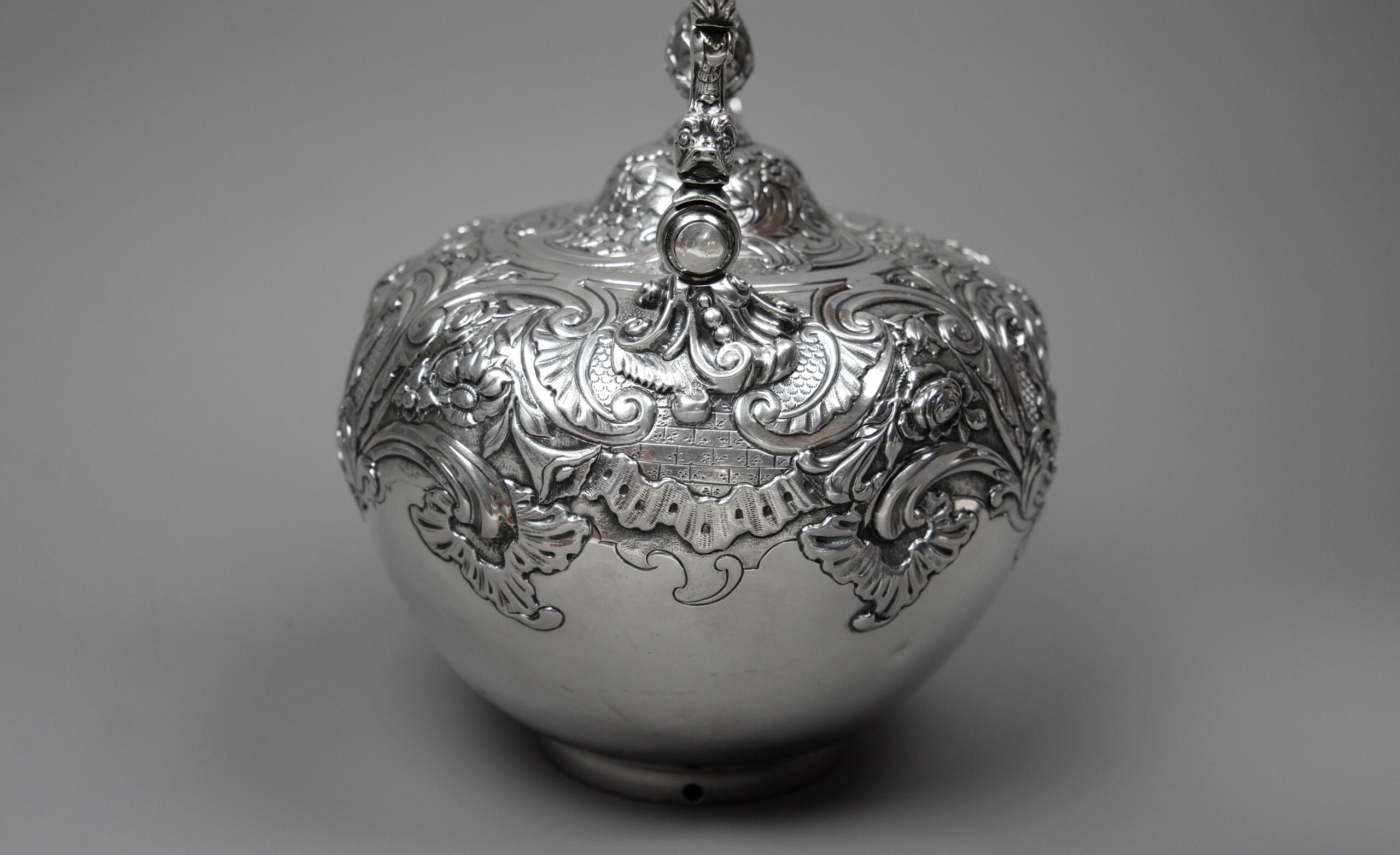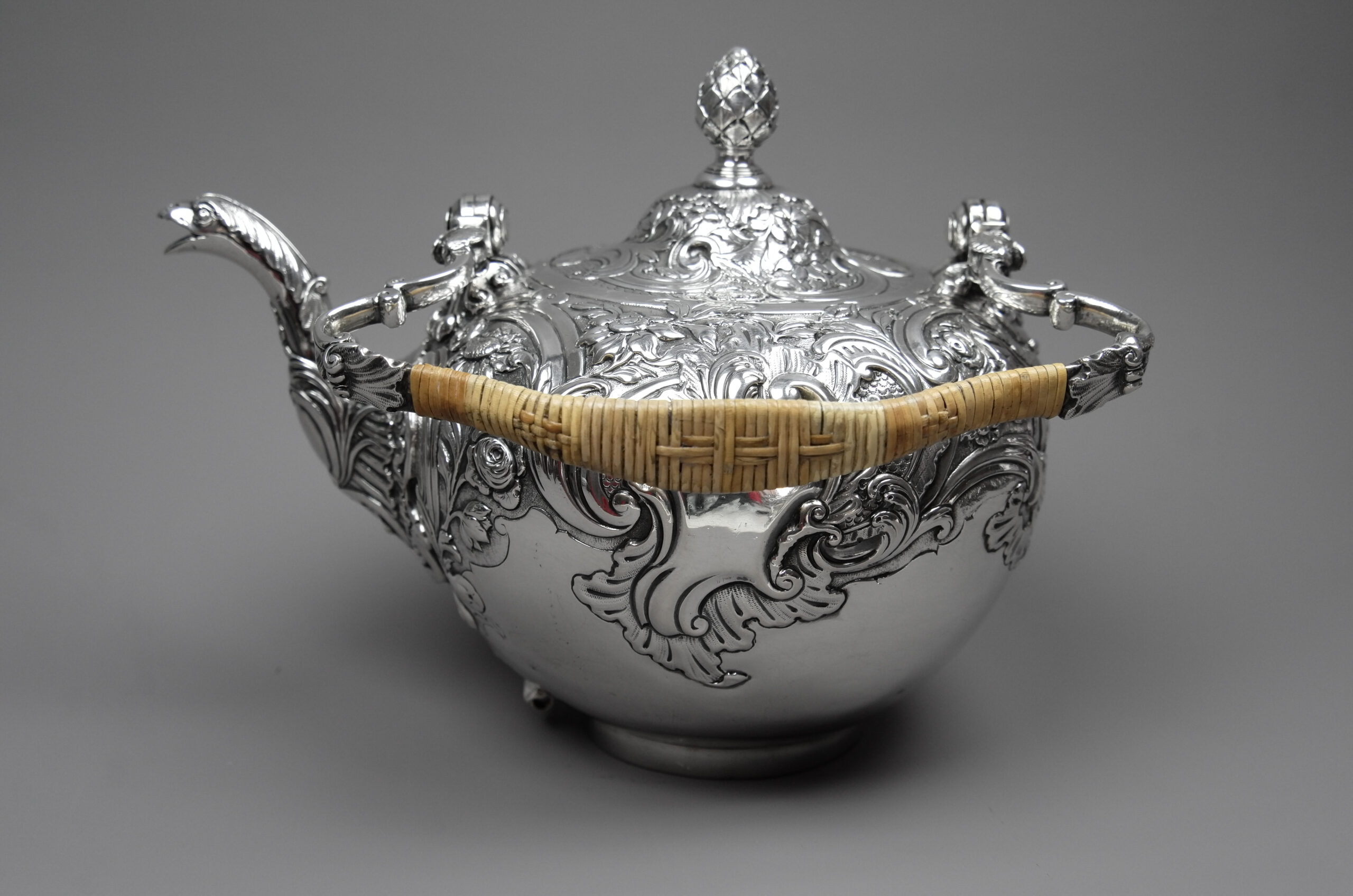 Ein weiteres, beeindruckendes Objekt des Silberschmieds Thomas Whipham I, ein Teekessel mit Rechaud. Der Teekessel ist in runder Apfelform mit geprägtem Rocaillen-, Blatt- und Blütendekor auf Korpus und Klappdeckel gestaltet. Darüber hinaus ist der Kessel mit zwei freien Kartuschen, einer plastischen Blüte als Deckeknauf, einem Ausguss in Form eines Fabeltiers sowie einer mit Rattan umwickelten Handhabe ausgestattet. Der Rechaud steht auf drei Volutenfüßen mit Maskaronbesatz, ist mit Blüten- und Blattdekor verziert und mit einem eingelegten Brennelement für Docht ausgestattet. Der Kessel kann über ein Scharnier mit Stift am Rechaud fixiert werden, der Silberstift für ein zweites Scharnier fehlt leider.