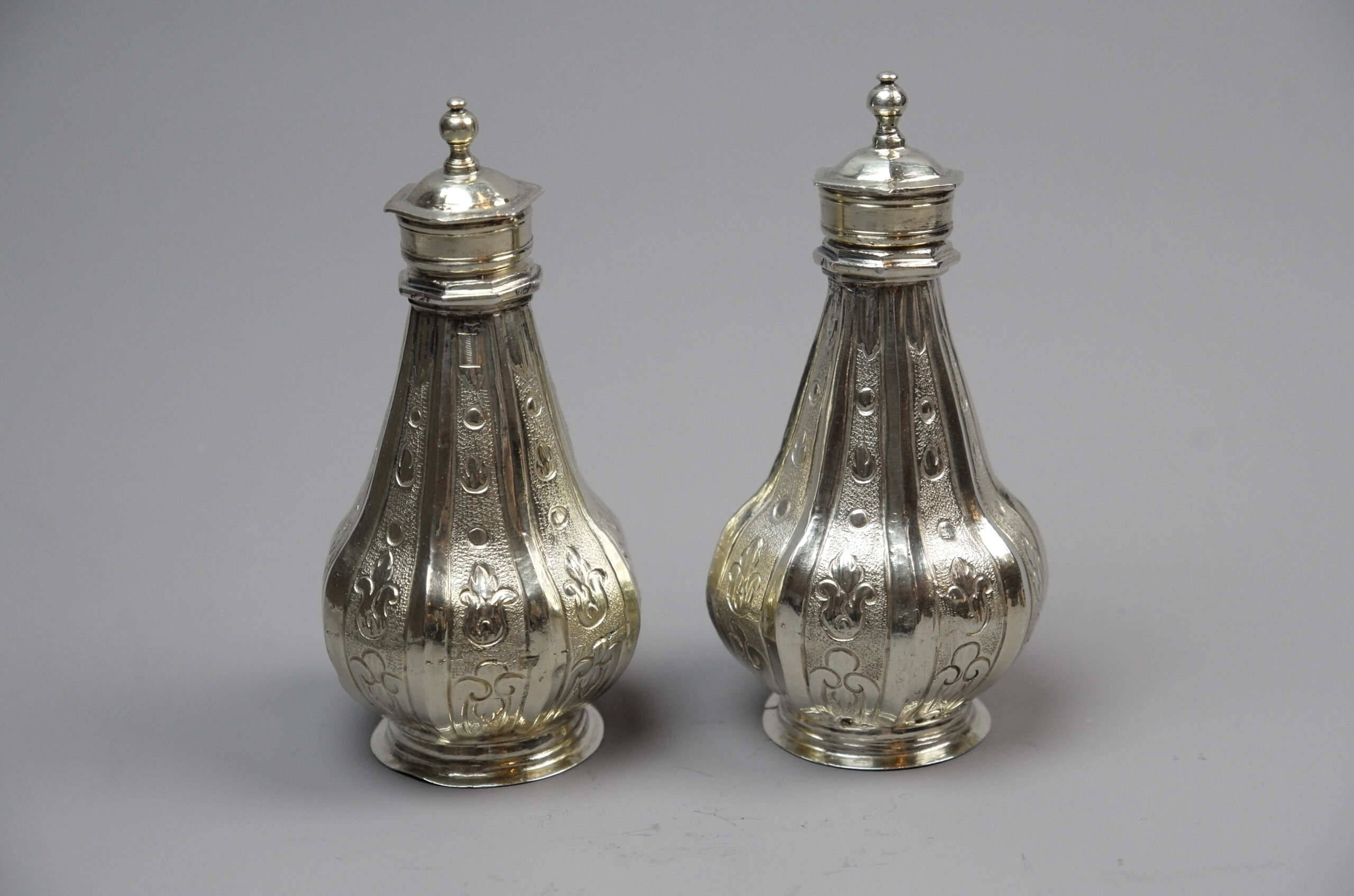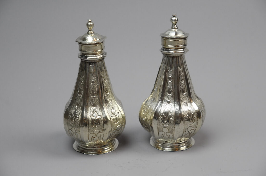 Zwei bezaubernde, komplett vergoldete Parfümfläschchen mit birnenförmigem Korpus auf einem rundem Standfuß. Die Korpusse sind mit vertikalen Linien und Blattmuster dekoriert, die Deckel sind abschraubbar und mit den Buchstaben “I“ und „P“ graviert.