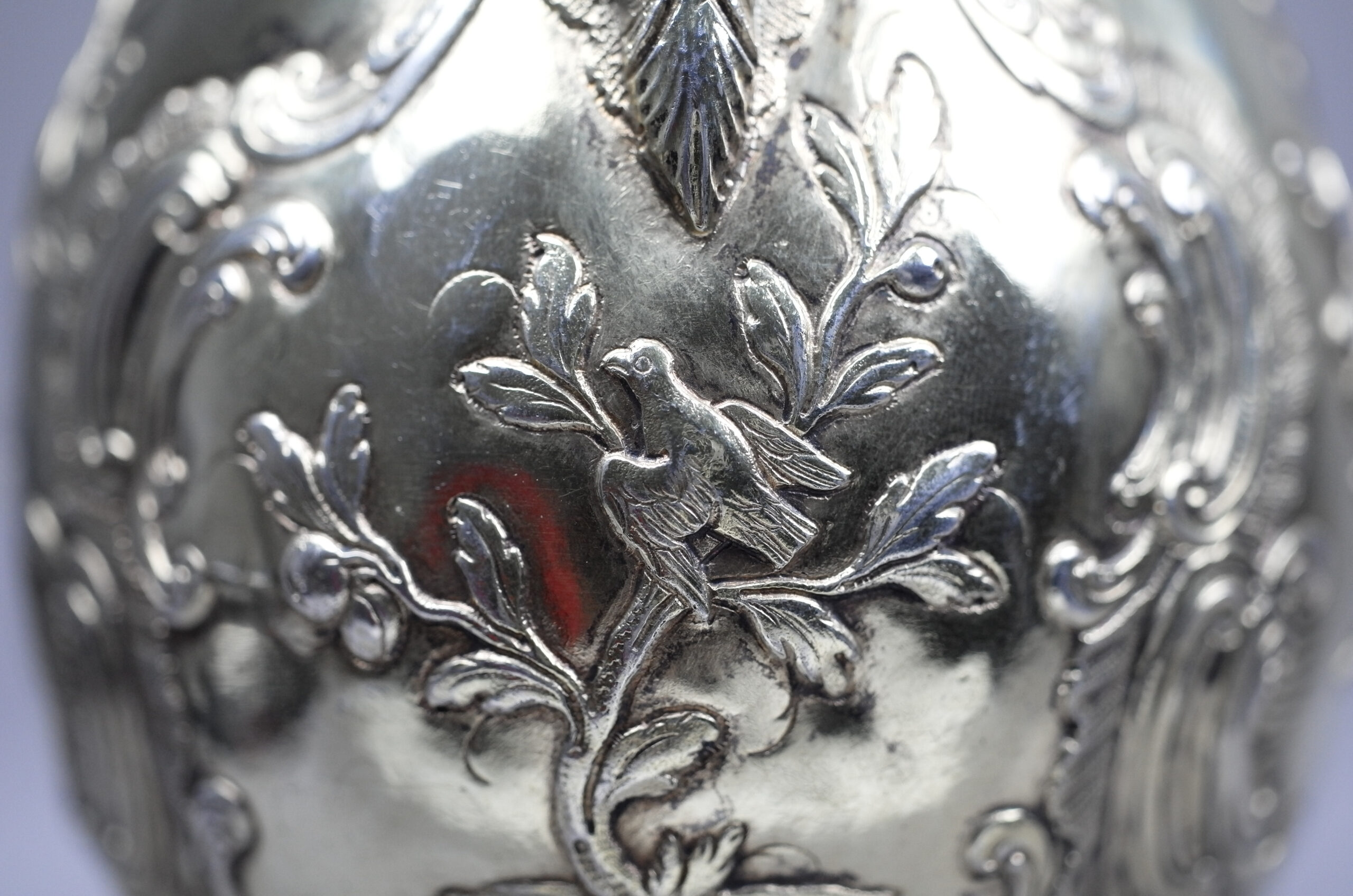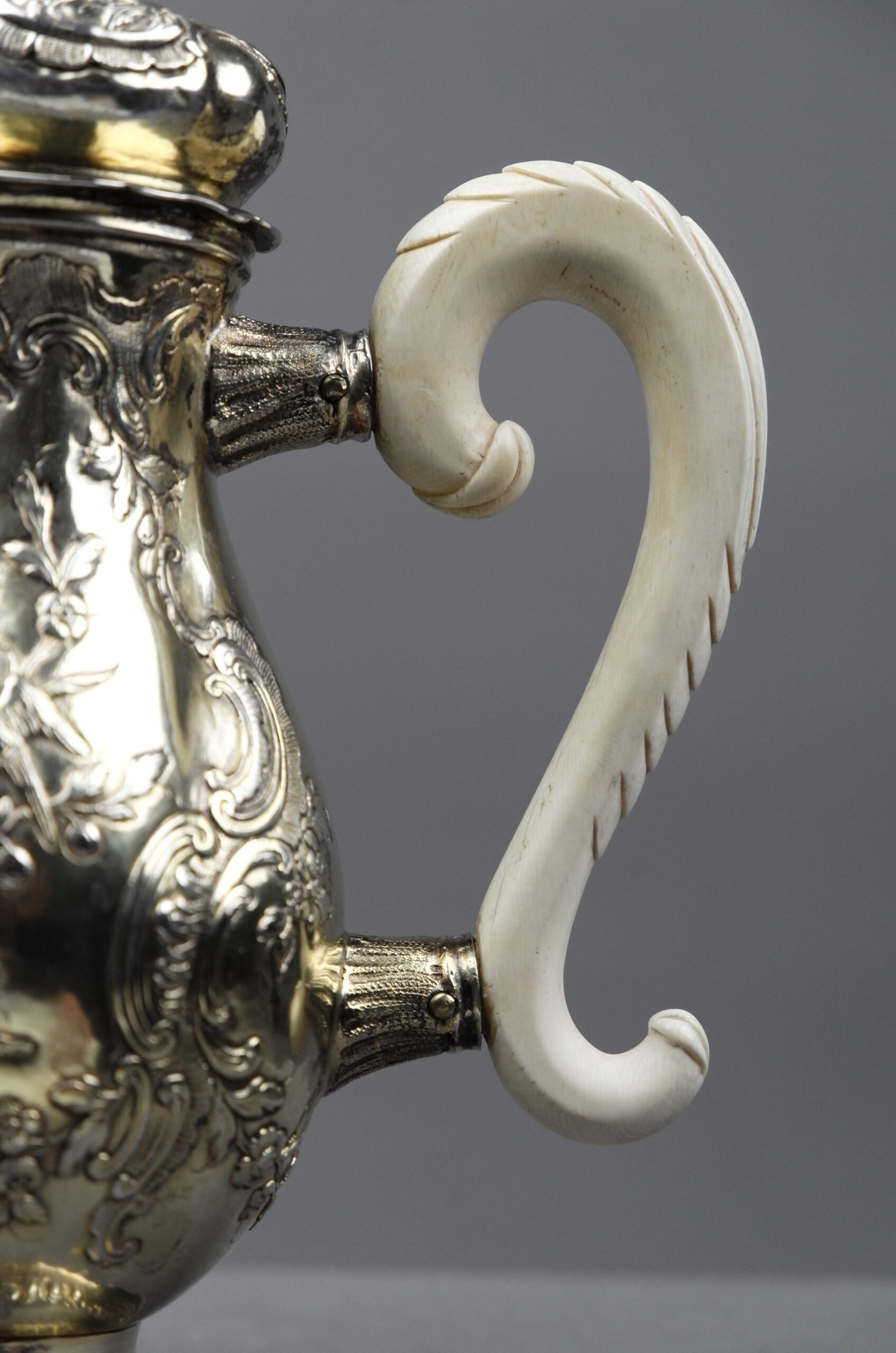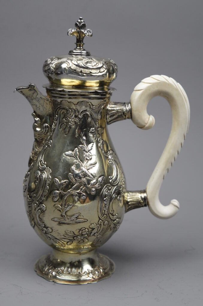 Ein fein gearbeitetes Kännchen auf rundem Standfuß mit balusterförmigem Korpus und hoch gewölbtem Scharnierdeckel mit Blütenknauf. Verziert ist das Kännchen mit getriebenen floralen Muschel- und Akanthus Mustern sowie beidseitig und mittig mit einem Vogel im Strauch. (Chinoiserie). Ein fein geschnitzter Griff aus Bein dient als Handhabe.