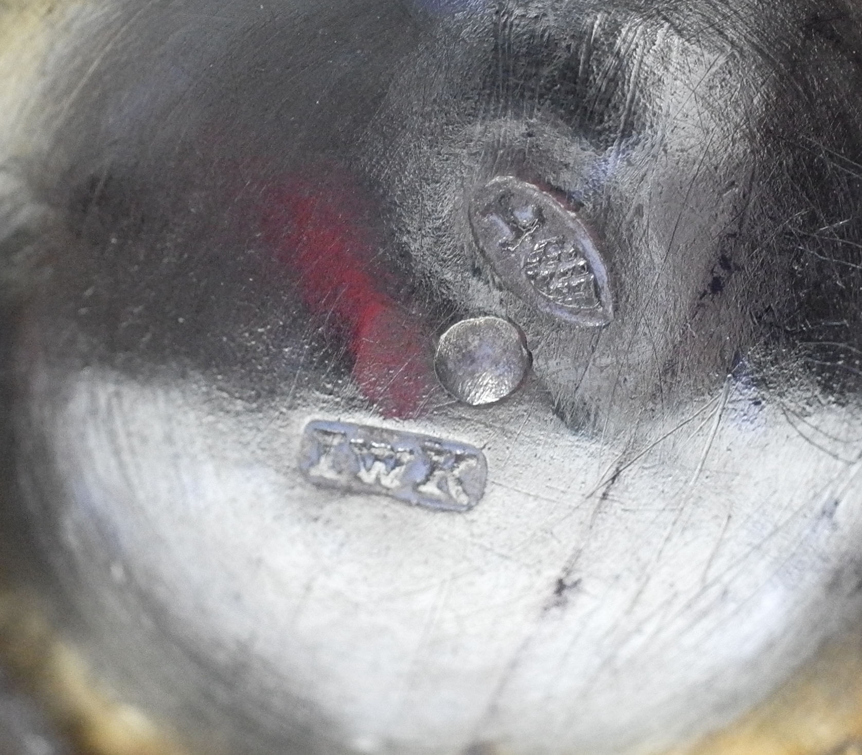 IWK ist die Punze des Augsburger Silberschmieds Jacob Wilhem Kolb (Seling 2522), die Zirbelnuss (Pyr) mit dem Buchstaben T ist das Beschauzeichen für Augsburg 1769 bis 1771.