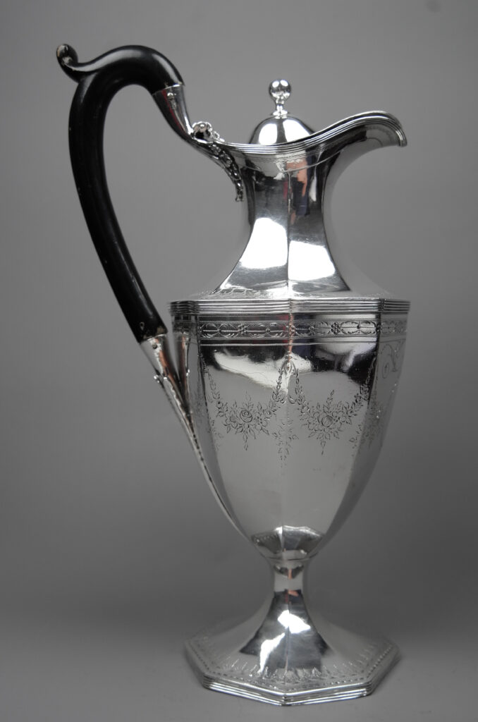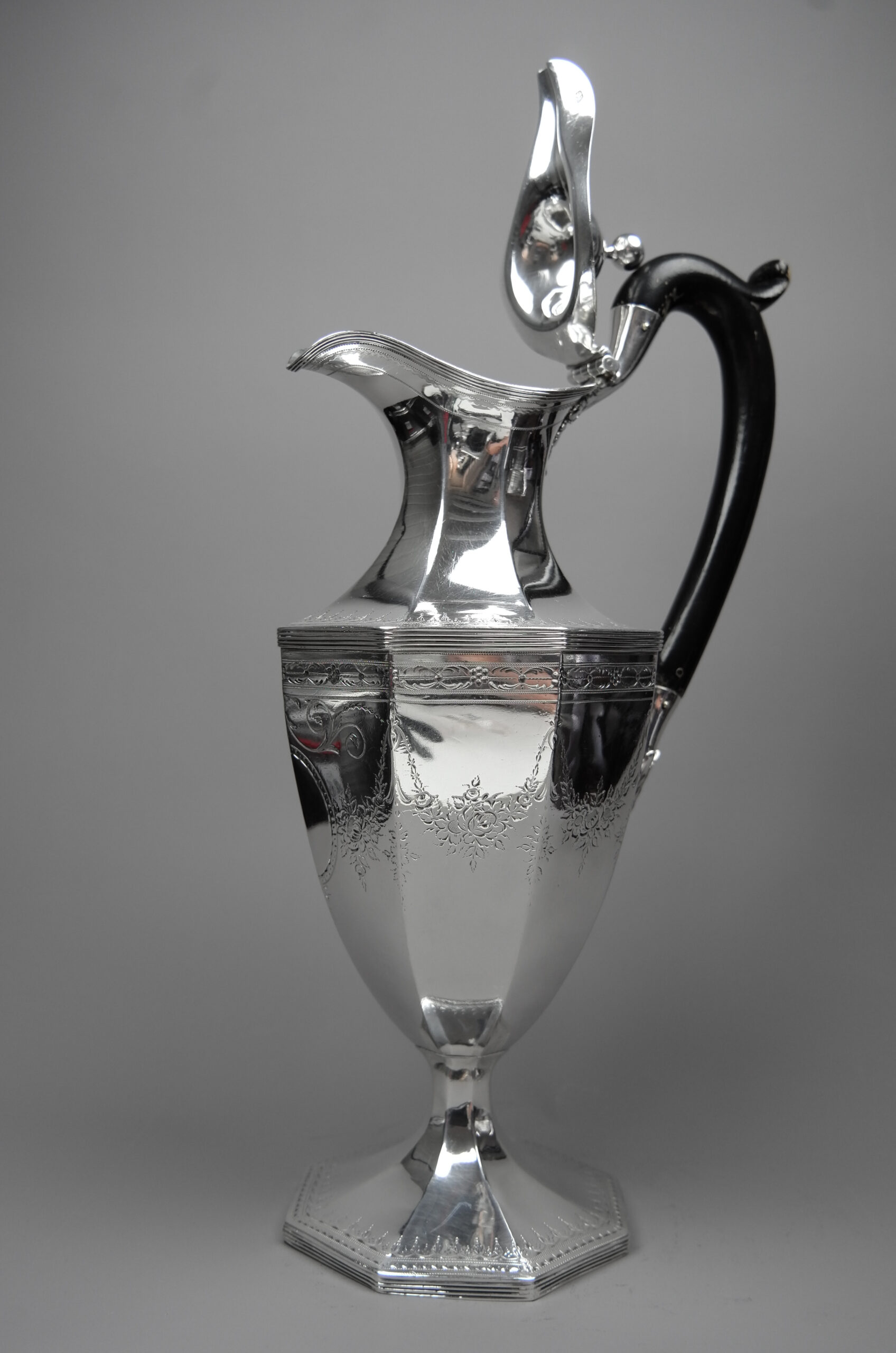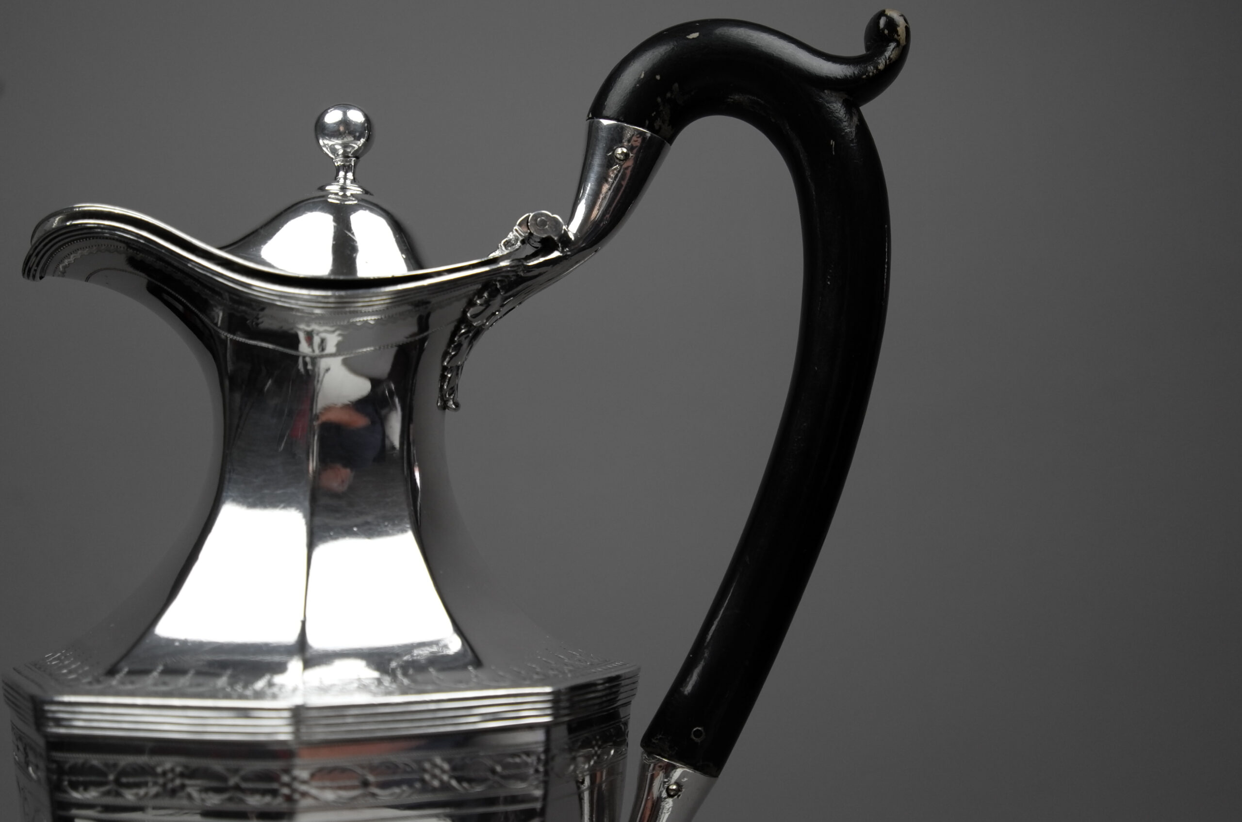 Ein großer Ewer in achtpassiger Urnenform auf achtpassigem, hohem Standfuß. Dekoriert ist der Korpus mit gravierten Blatt- und Blütenbändern sowie Girlanden. Im Frontbereich befindet sich eine freie Kartusche. Die Kanne ist ansonsten mit einem Klappdeckel und einer ebonisierten Holzhandhabe ausgestattet.