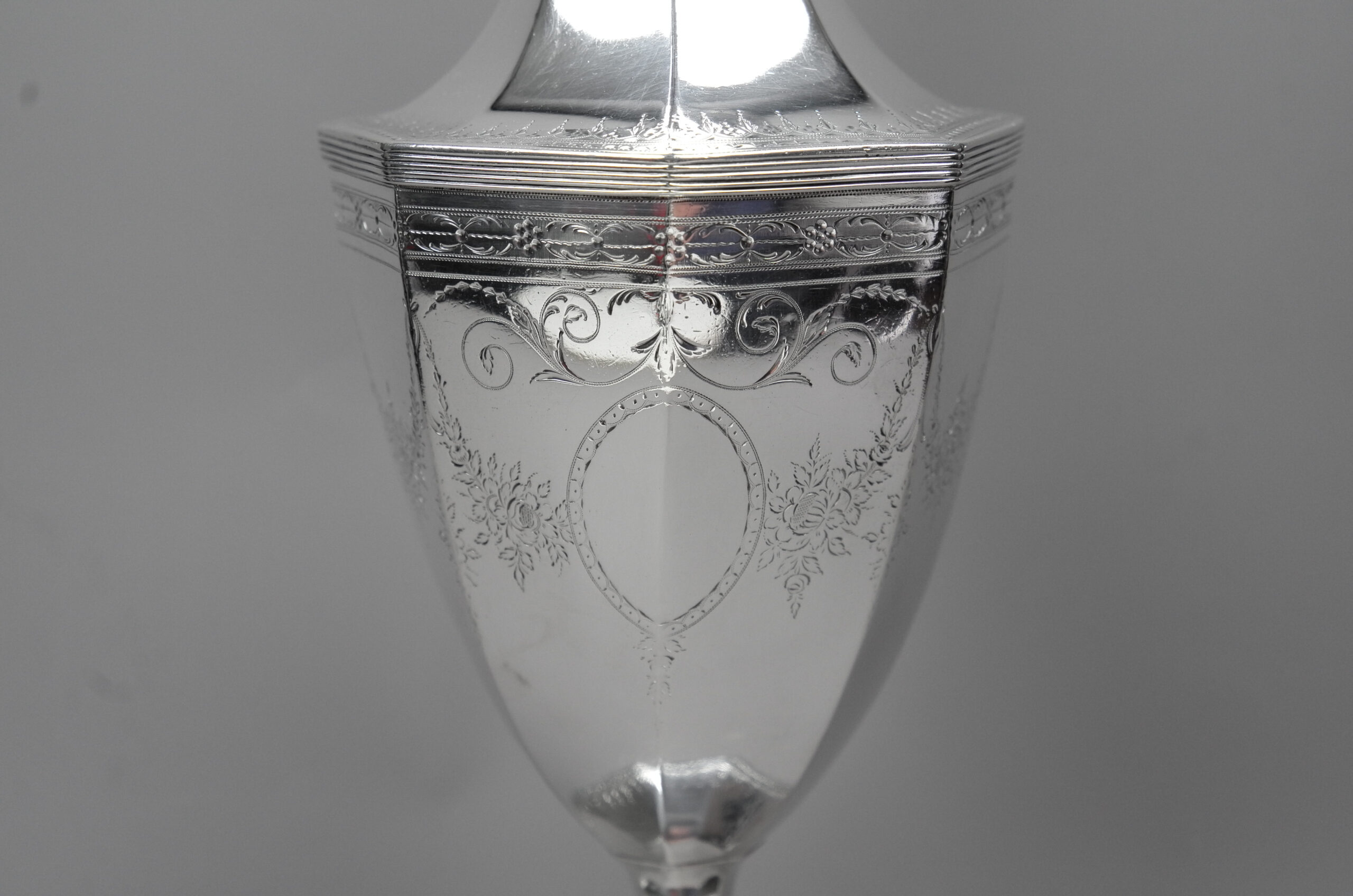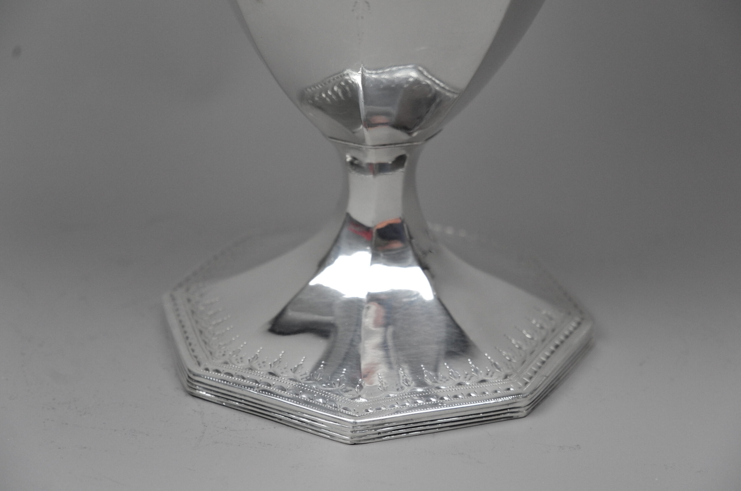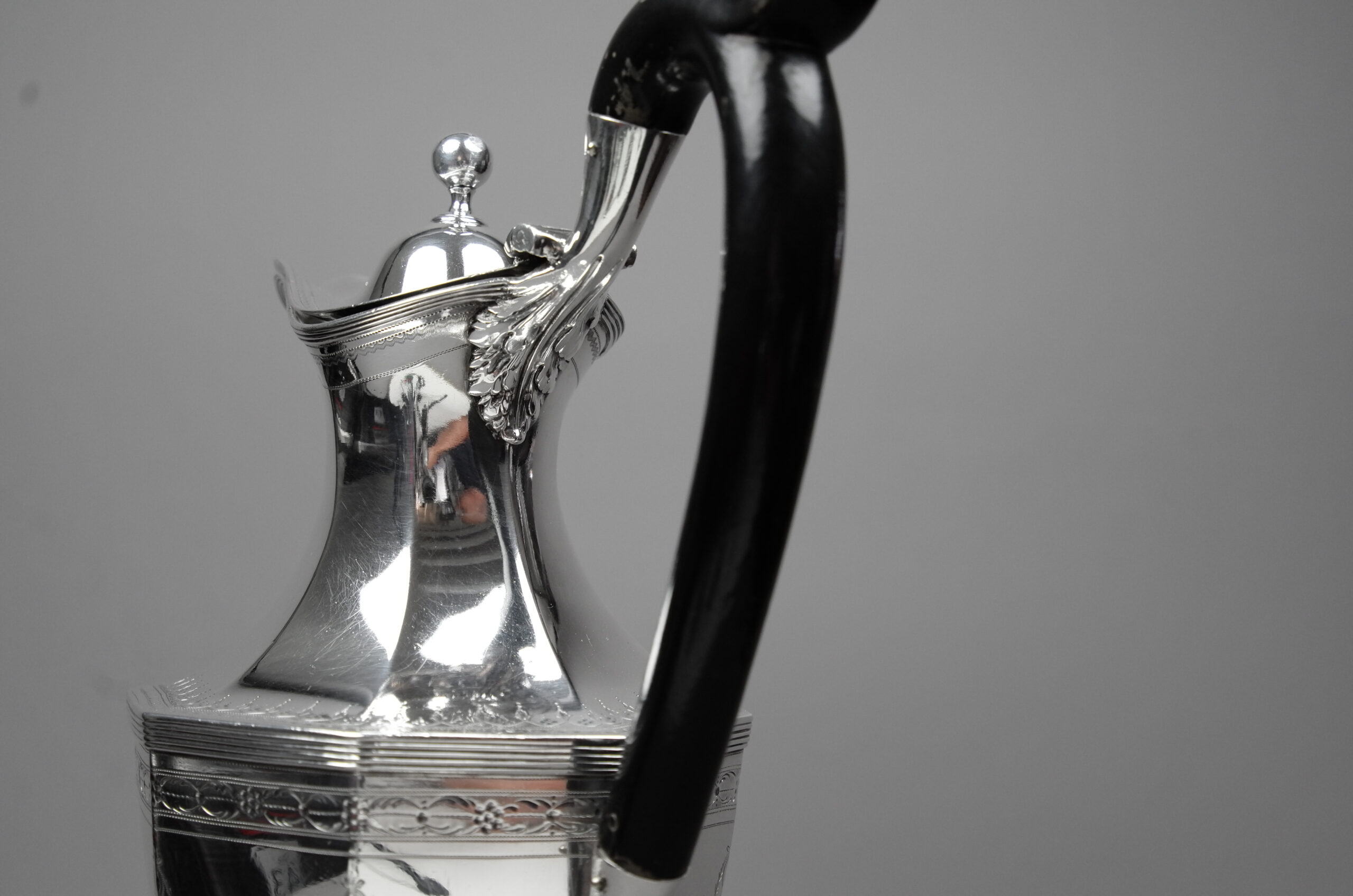 Ein großer Ewer in achtpassiger Urnenform auf achtpassigem, hohem Standfuß. Dekoriert ist der Korpus mit gravierten Blatt- und Blütenbändern sowie Girlanden. Im Frontbereich befindet sich eine freie Kartusche. Die Kanne ist ansonsten mit einem Klappdeckel und einer ebonisierten Holzhandhabe ausgestattet.
