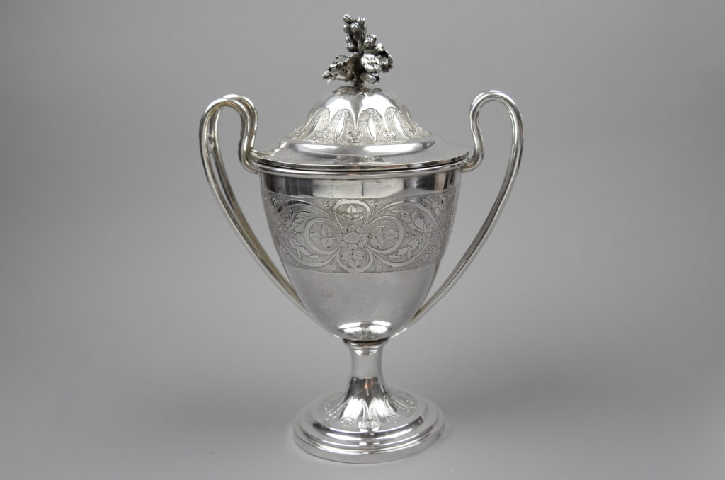 Auf einem runden, mit Blattwerk verzierten Standfuß, steht der urnenförmige Korpus des Deckelpokals, der mit floralen Motiven graviert ist. Zwei Henkel in dickem Silberdraht sowie ein abnehmbarer Deckel mit Blattverzierung und Deckelknauf als Blüte vervollständigen das solide gearbeitete Objekt.