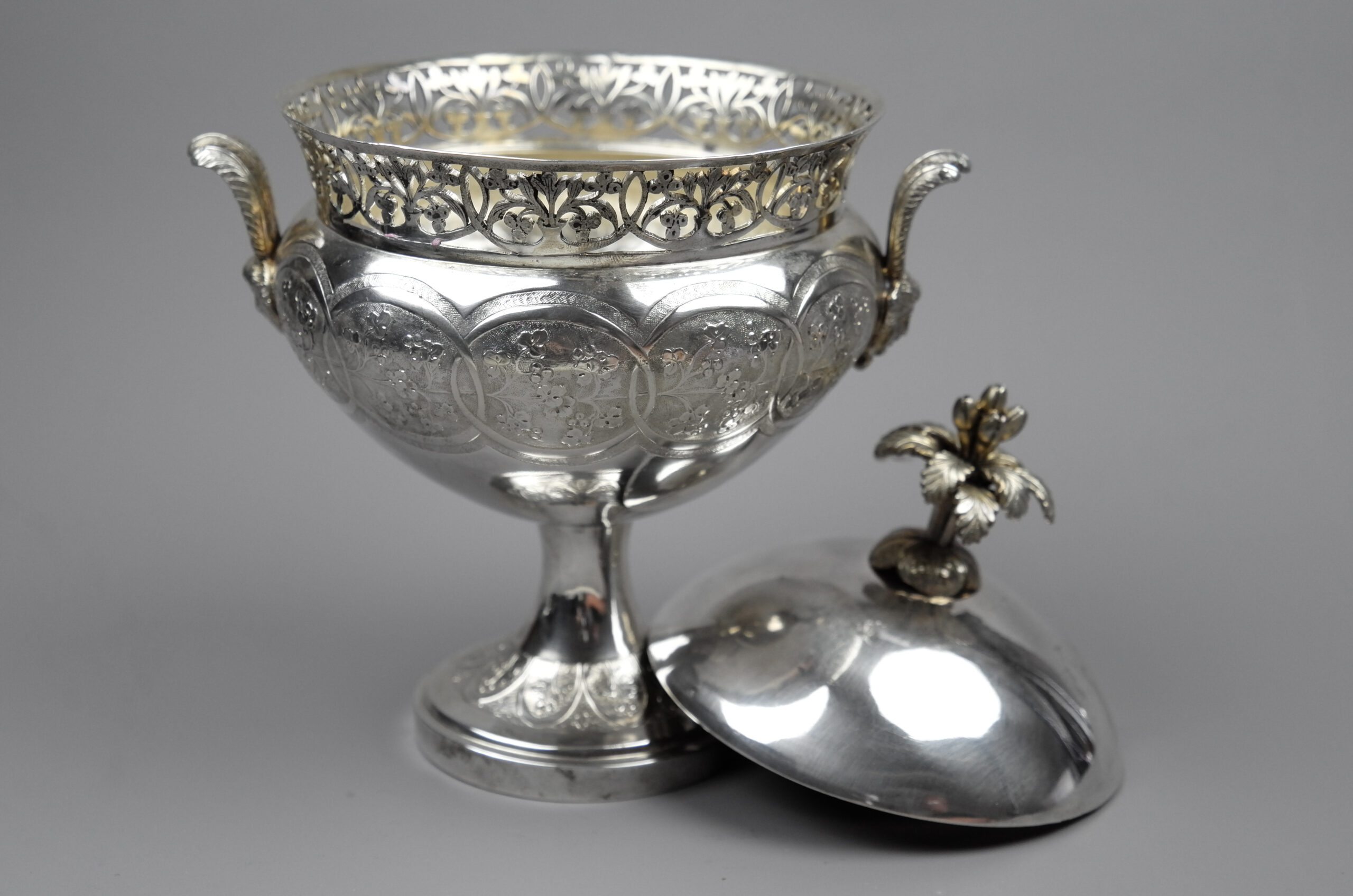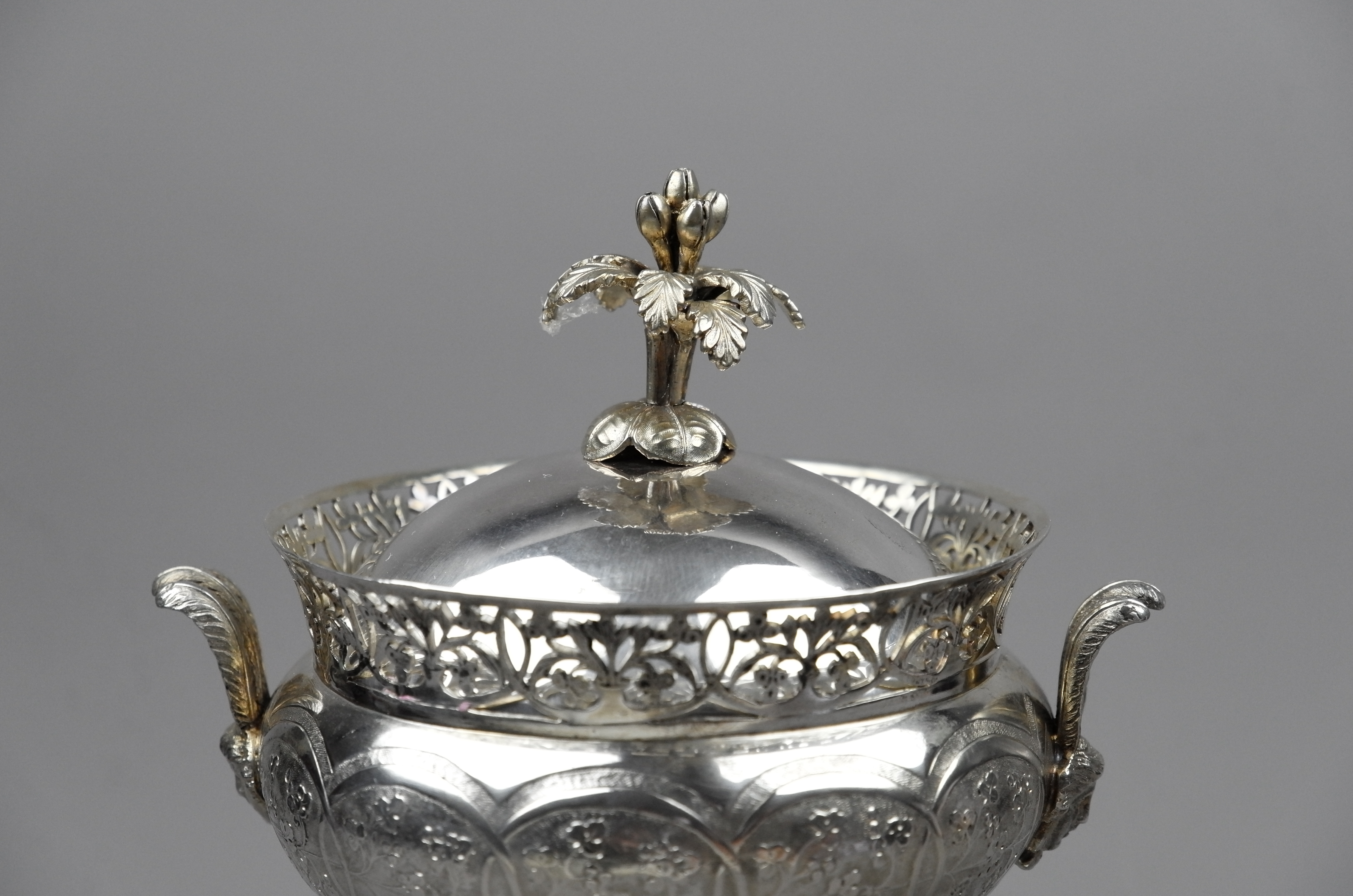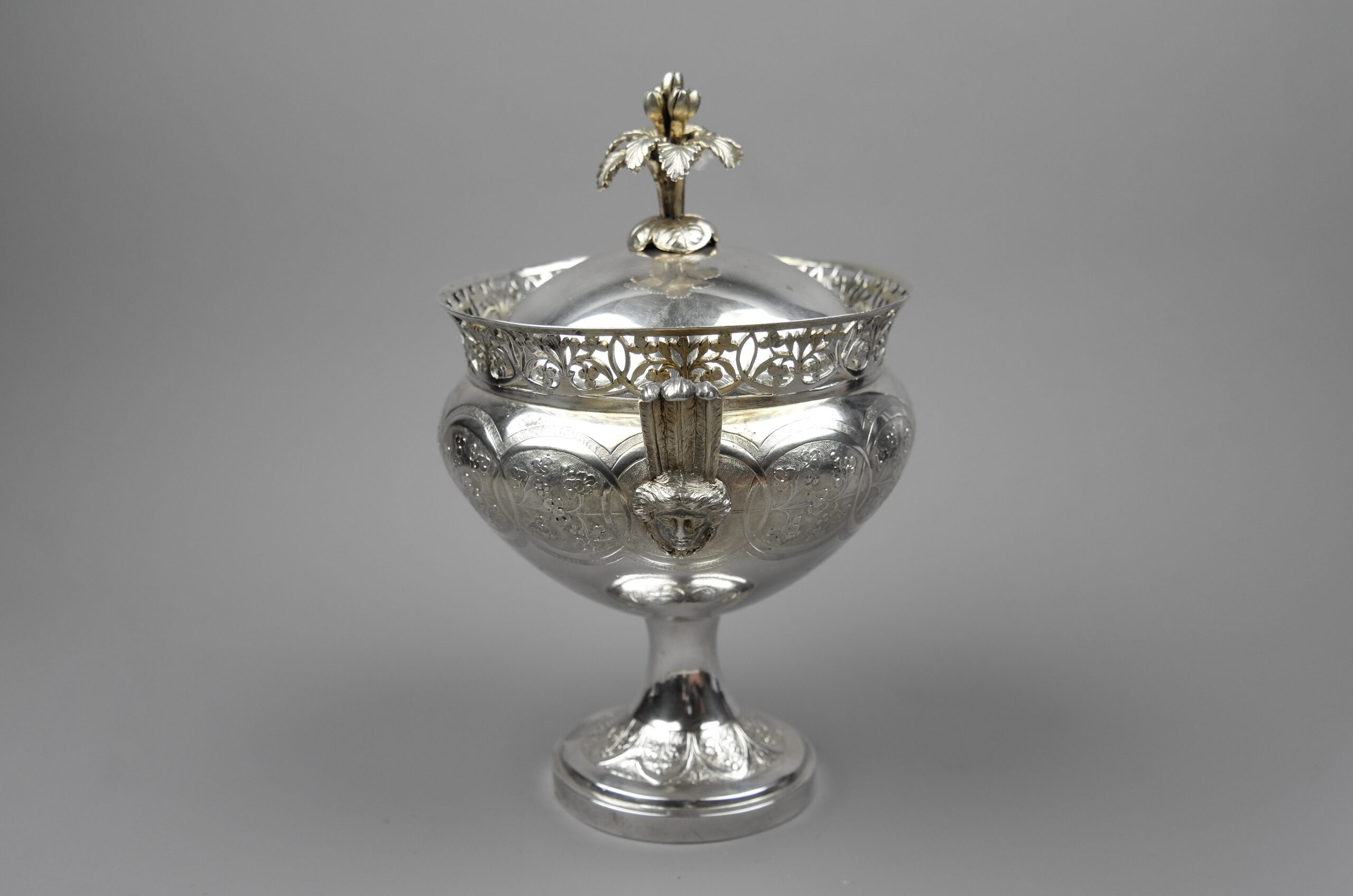 Eine reich ziselierte, runde Deckeldose für Zucker oder Konfekt auf rundem Stand mit hochgezogenem Rand, durchbrochen gearbeitet, sowie Maskarons als seitliche Handhaben.