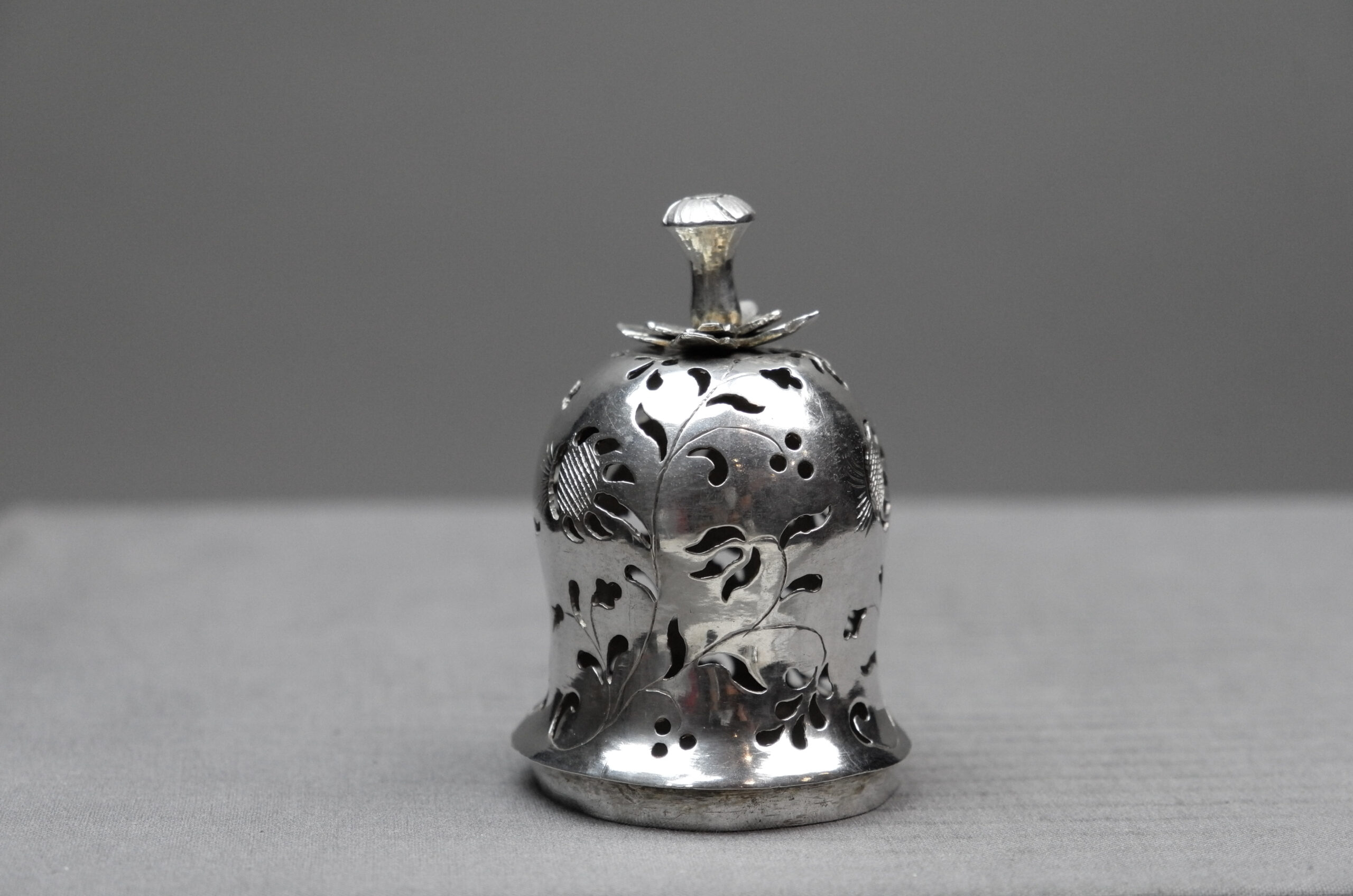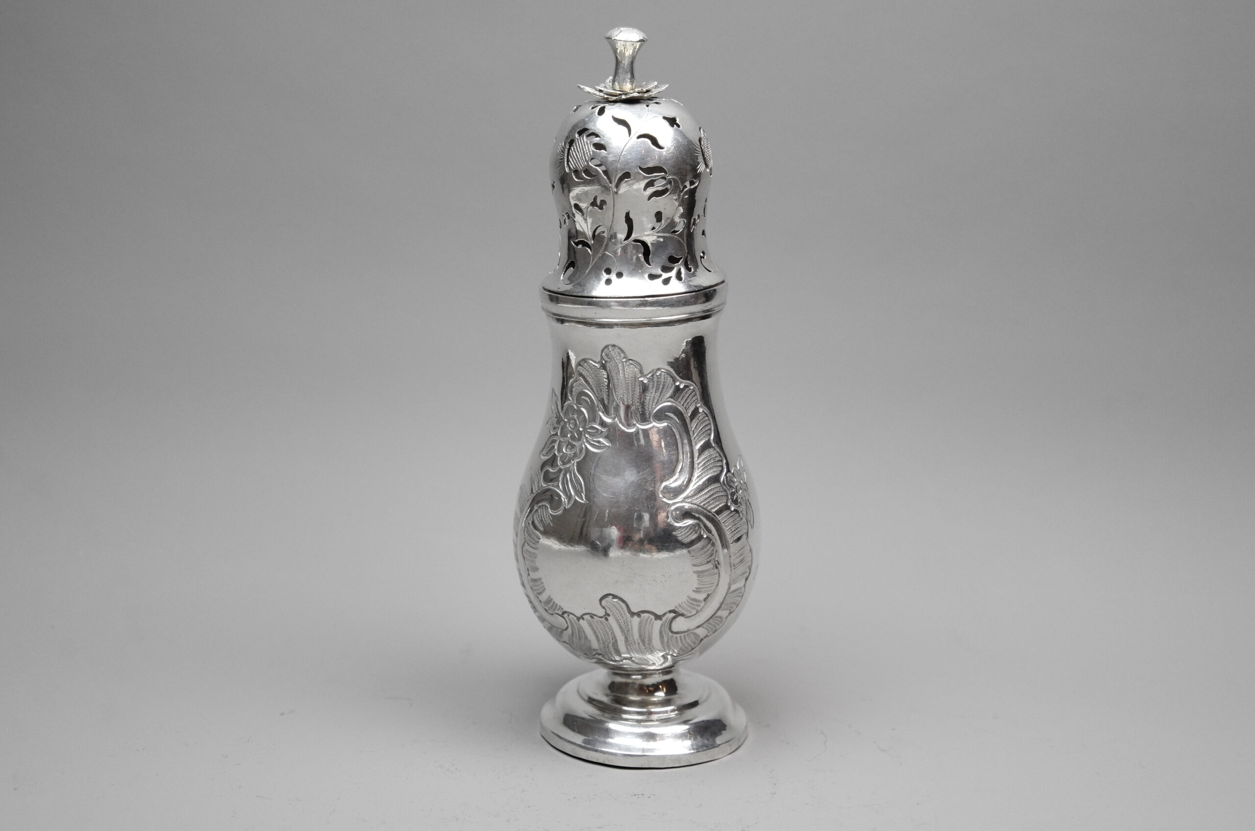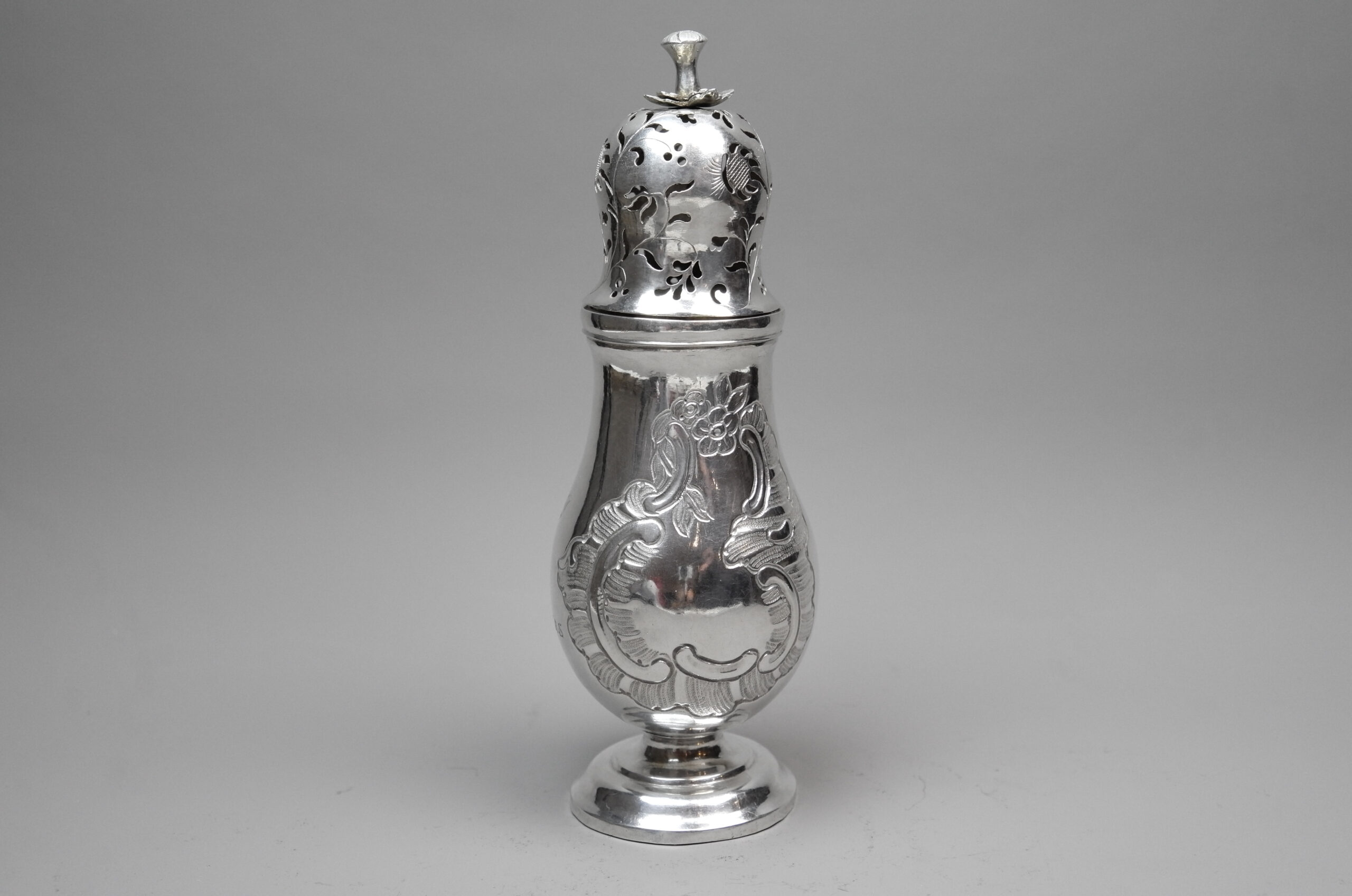 Ein weiterer balusterförmiger Zuckerstreuer auf rundem Standfuß mit geprägtem Rocaillen- und Akanthusdekor am Korpus und mit einem in Ornamenten durchbrochenen Haubendeckel.