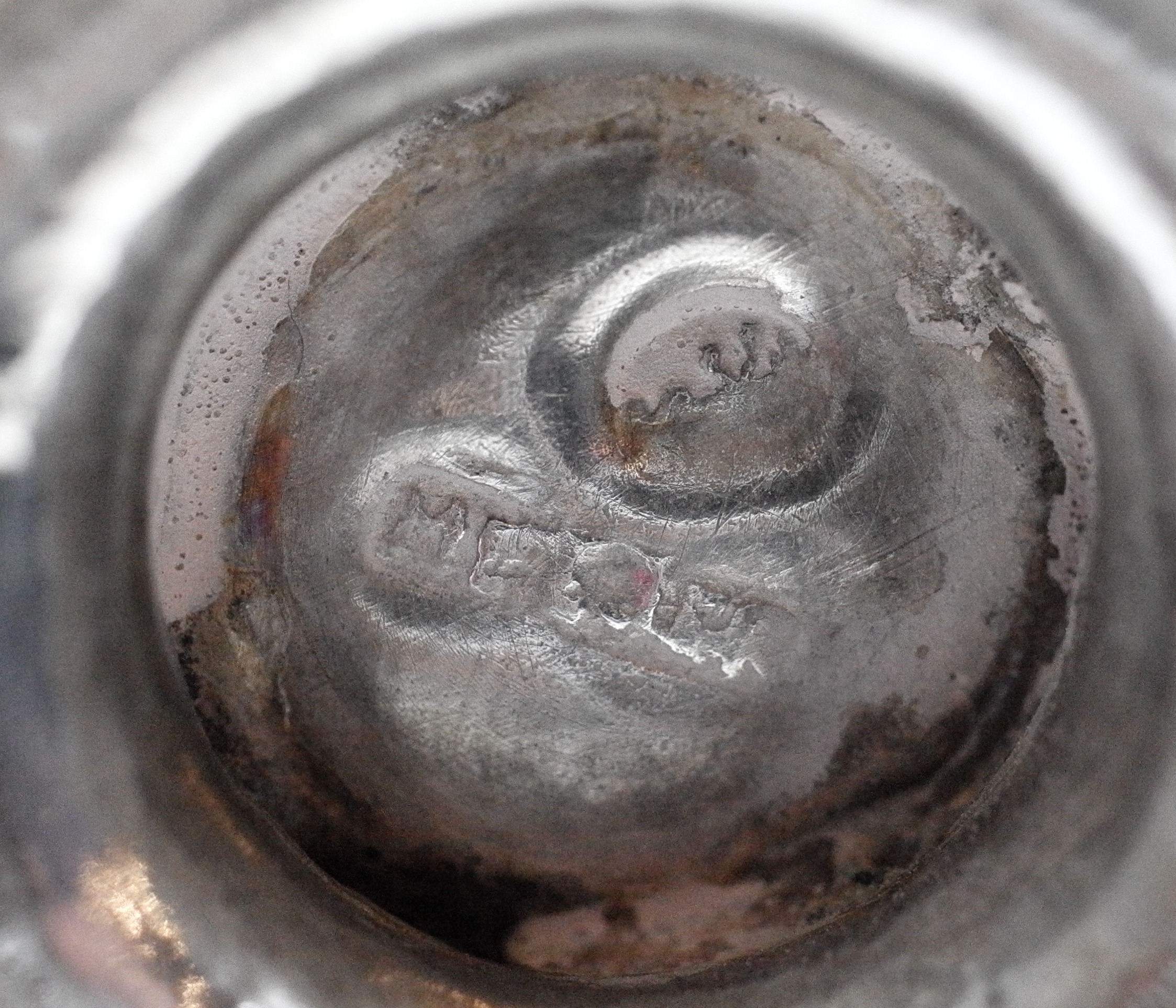 Markiert ist der Zuckerstreuer mit dem Bär als Beschaumarke für Berlin sowie mit der Meistermarke von Martin Friedrich Müller, der von 1737 bis 1810 in Berlin tätige war.